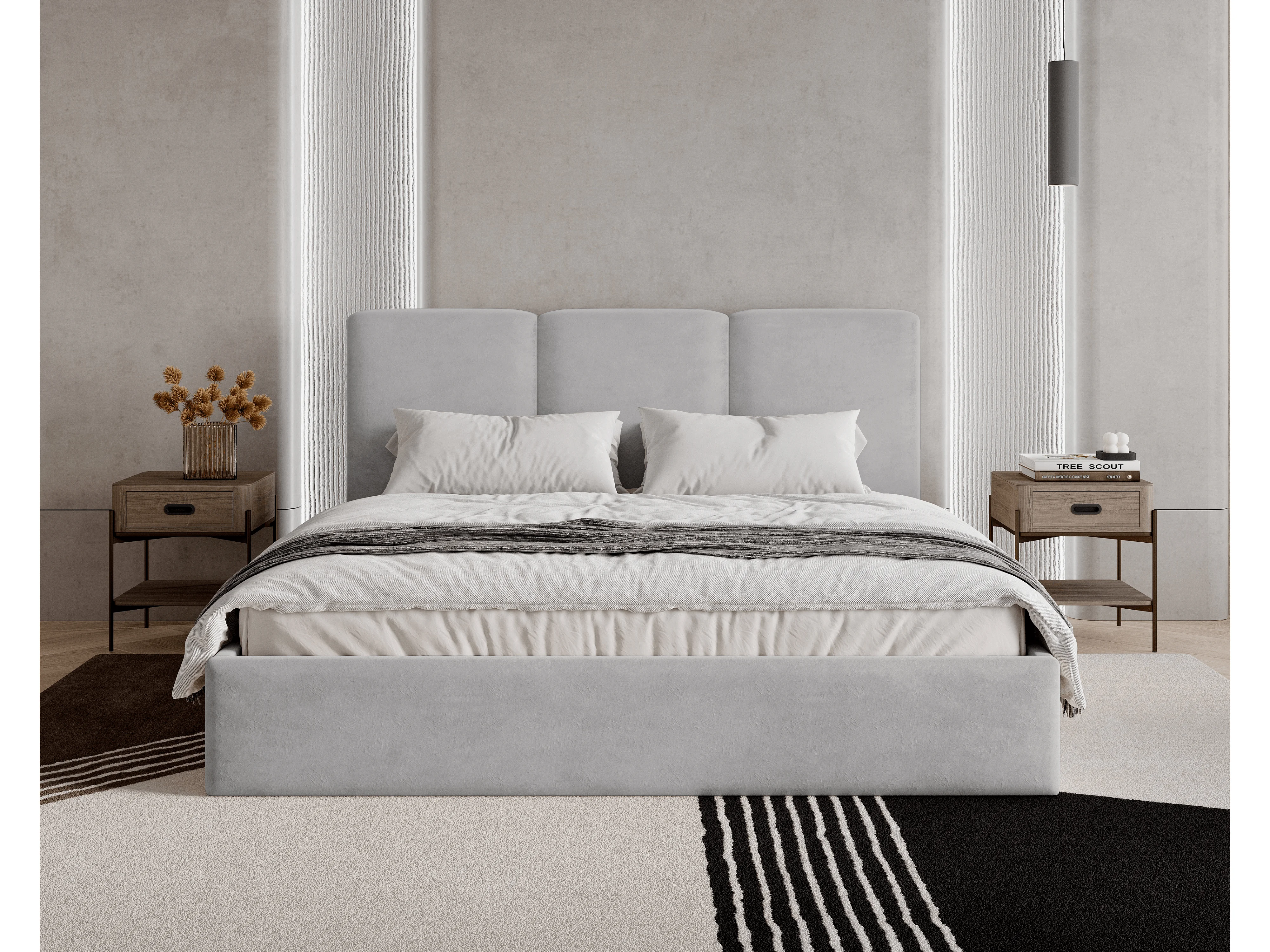 BESILIO Lit tapissé avec coffre de rangement 140x200 Mira – lit fin et minimaliste avec cadre en métal – Gris clair