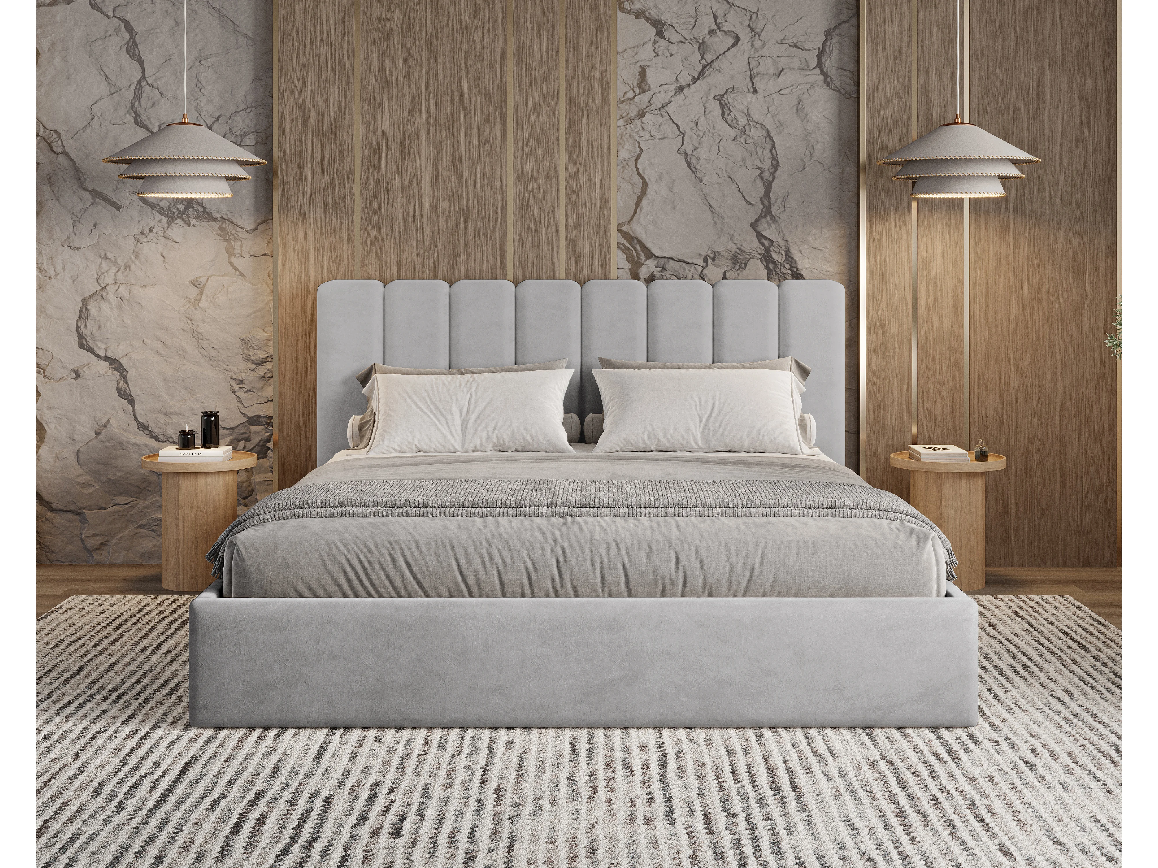 BESILIO Lit tapissé avec coffre de rangement 140x200 Nuvia – lit fin avec tête de lit moelleuse et cadre en métal – Gris clair