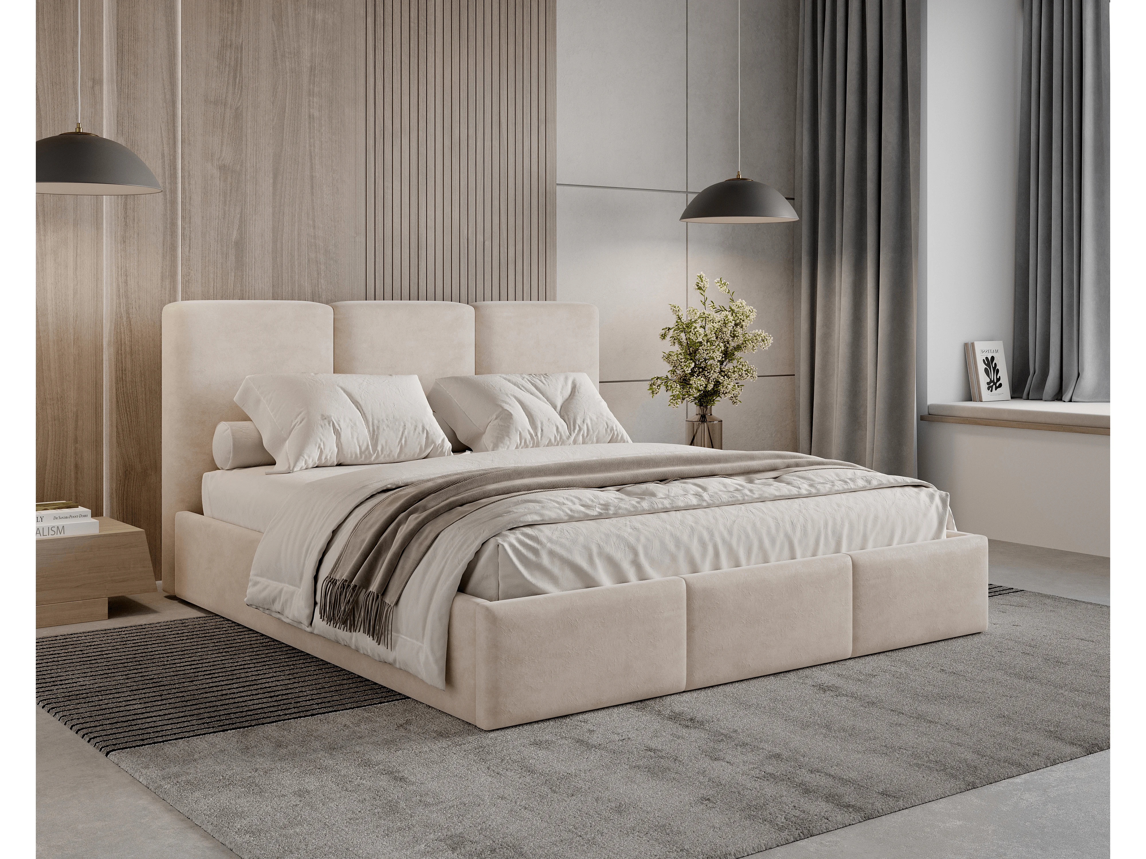 BESILIO Lit tapissé avec coffre de rangement 180x200 Elora – lit fin avec tête de lit décorative et cadre en métal – Beige