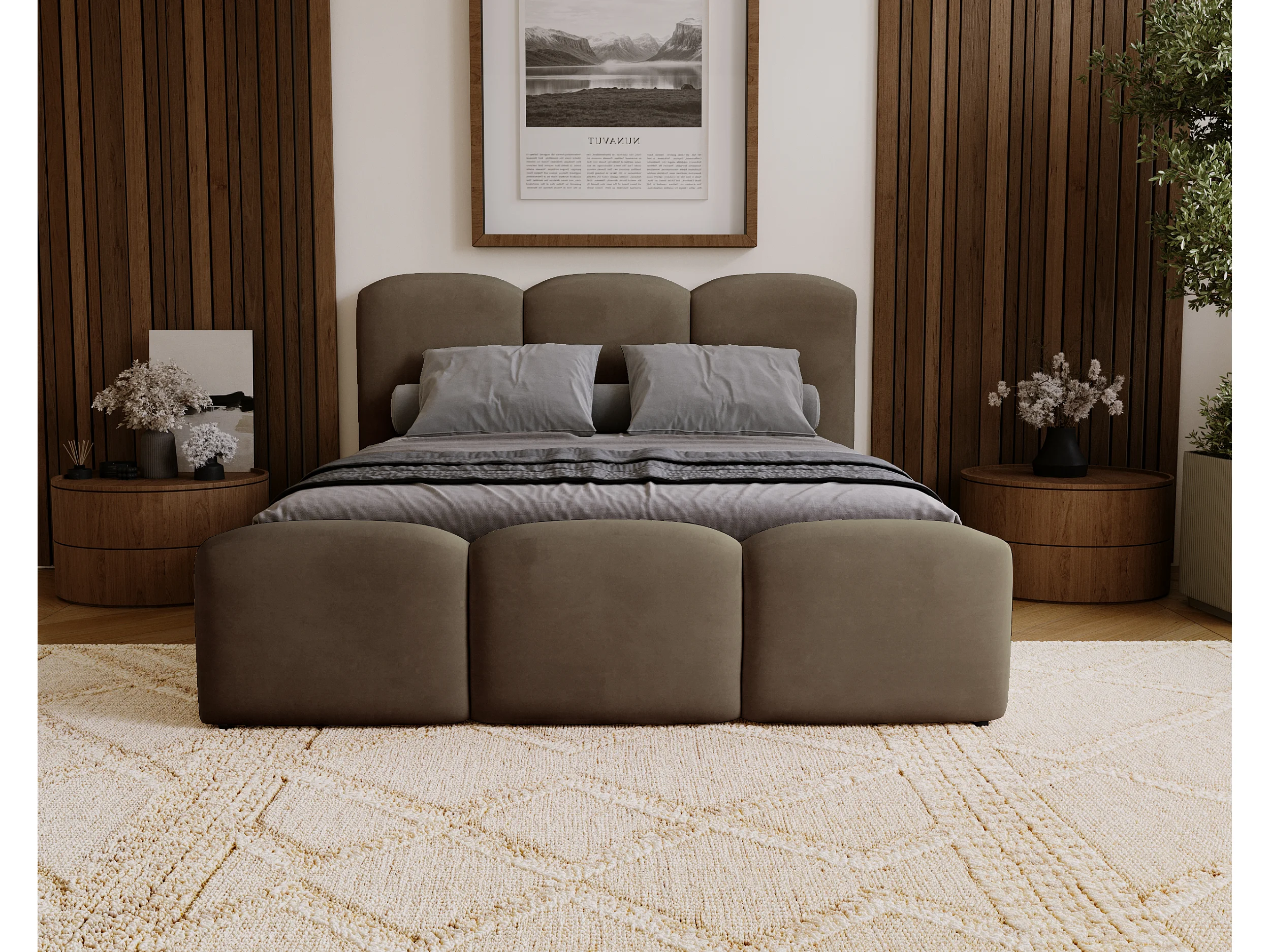 BESILIO Lit tapissé pour chambre 200x200 Camille – lit avec coffre de rangement et sommier en bois – Marron