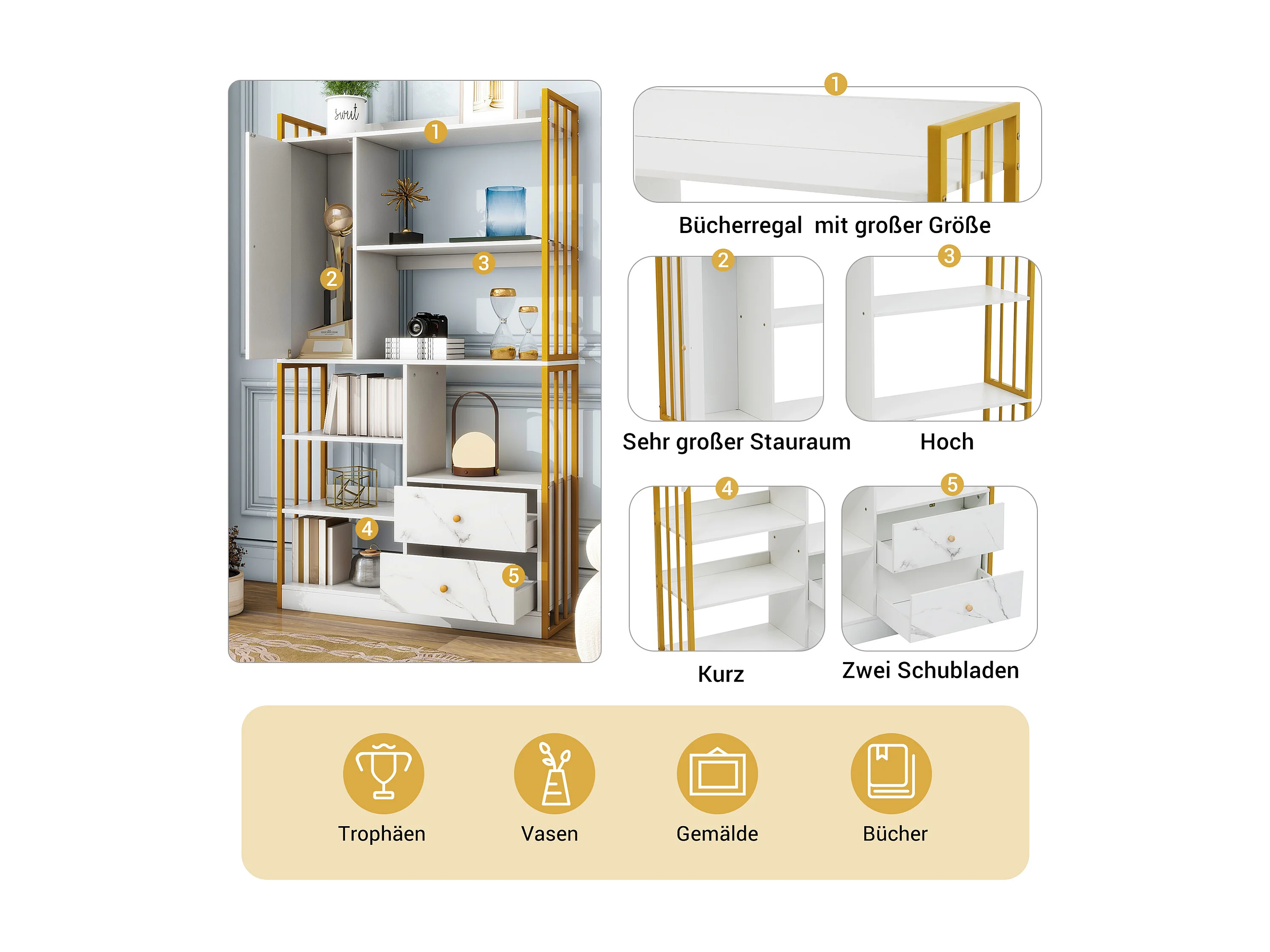 Bibliothèque à 6 étagères avec une porte et 2 tiroirs - 100 x 30 x 173.5 - Panneau de particules et métal - or + blanc