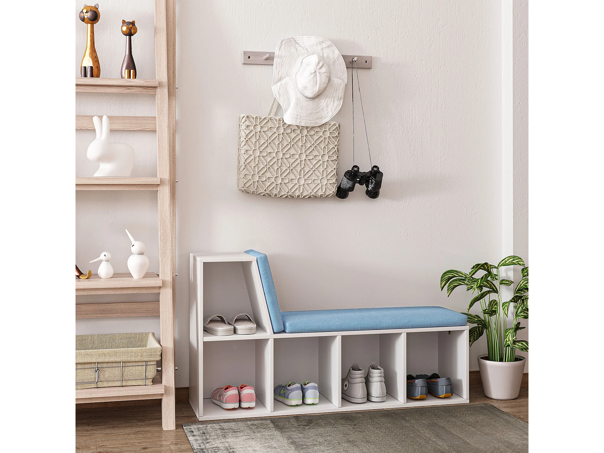 Bibliothèque banc 2 en 1 design contemporain 5 casiers 2 coussins fournis 108L x 30l x 60H cm blanc bleu chiné