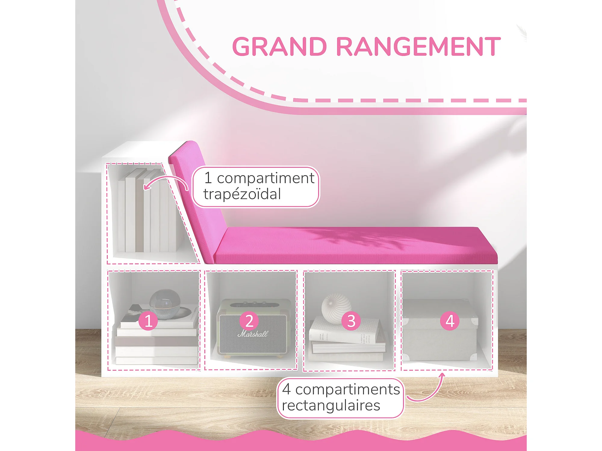 Bibliothèque banc 2 en 1 design contemporain 5 casiers 2 coussins fournis 108L x 30l x 60H cm blanc rose