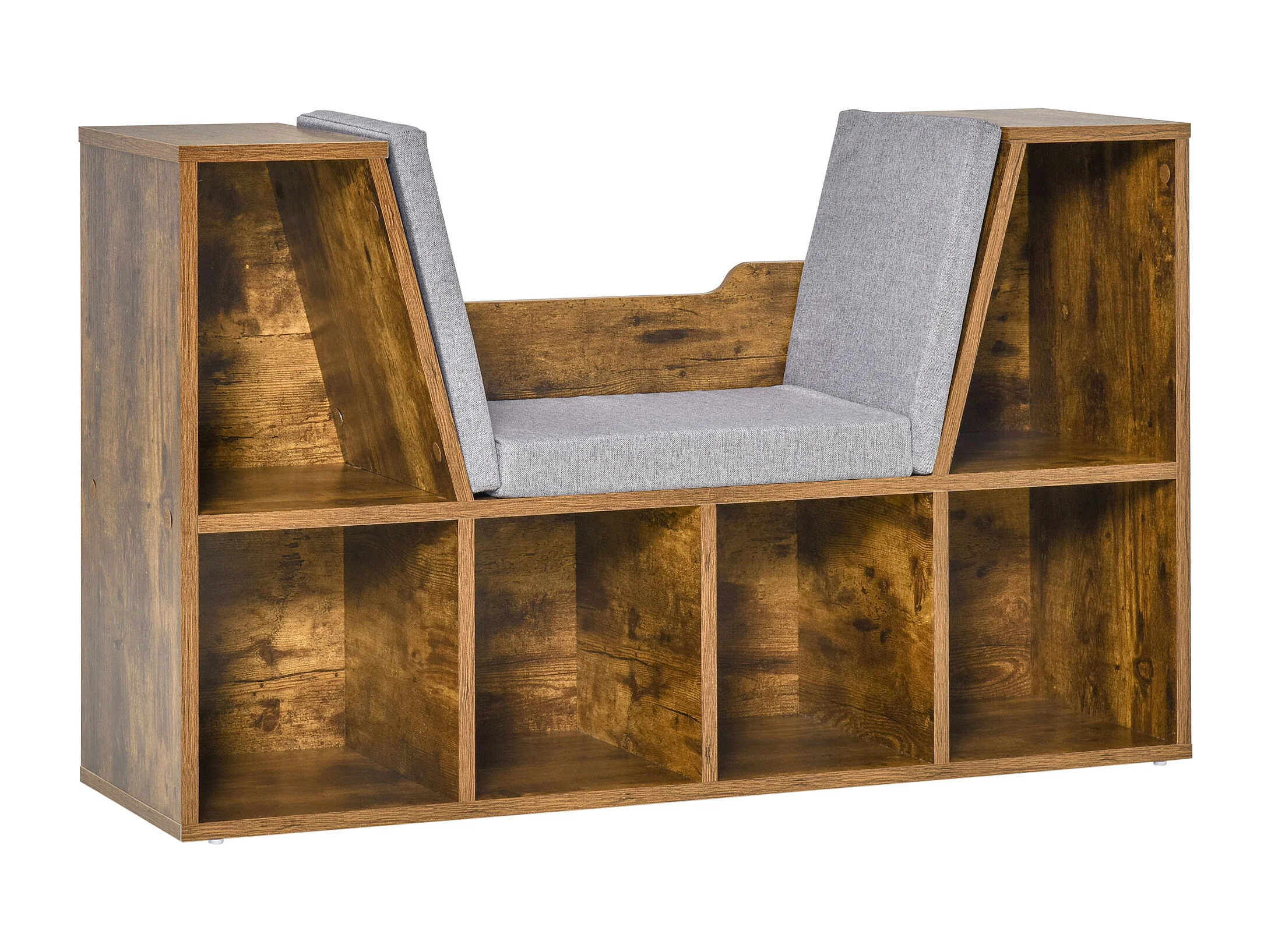 Bibliothèque banc 2 en 1 design contemporain 6 casiers 3 coussins fournis 102L x 30l x 61H cm aspect bois vieilli gris
