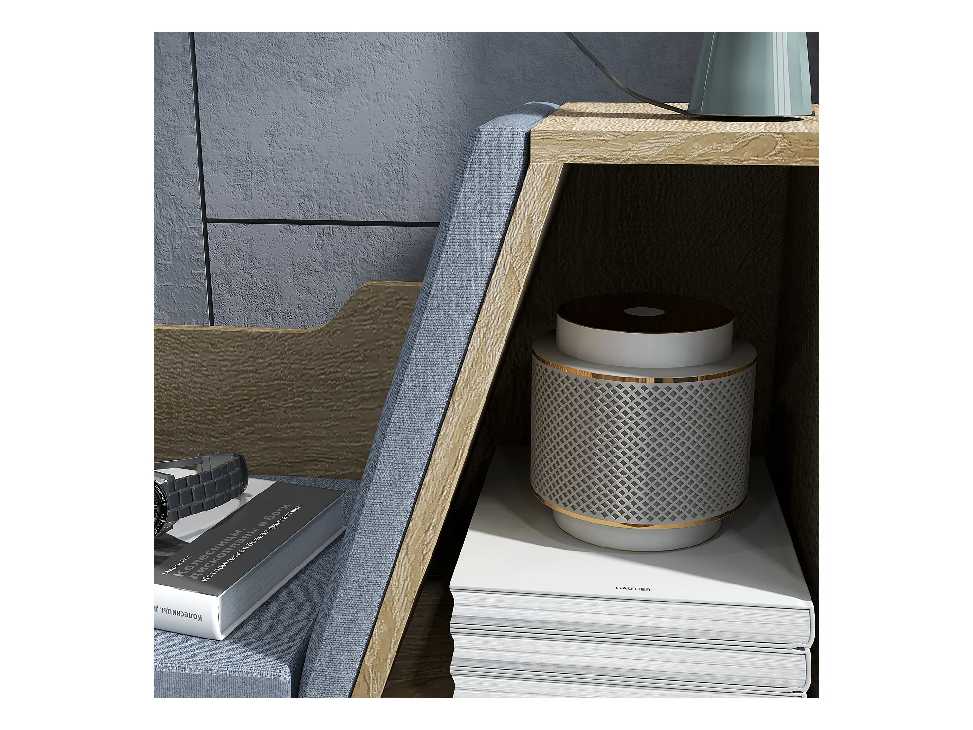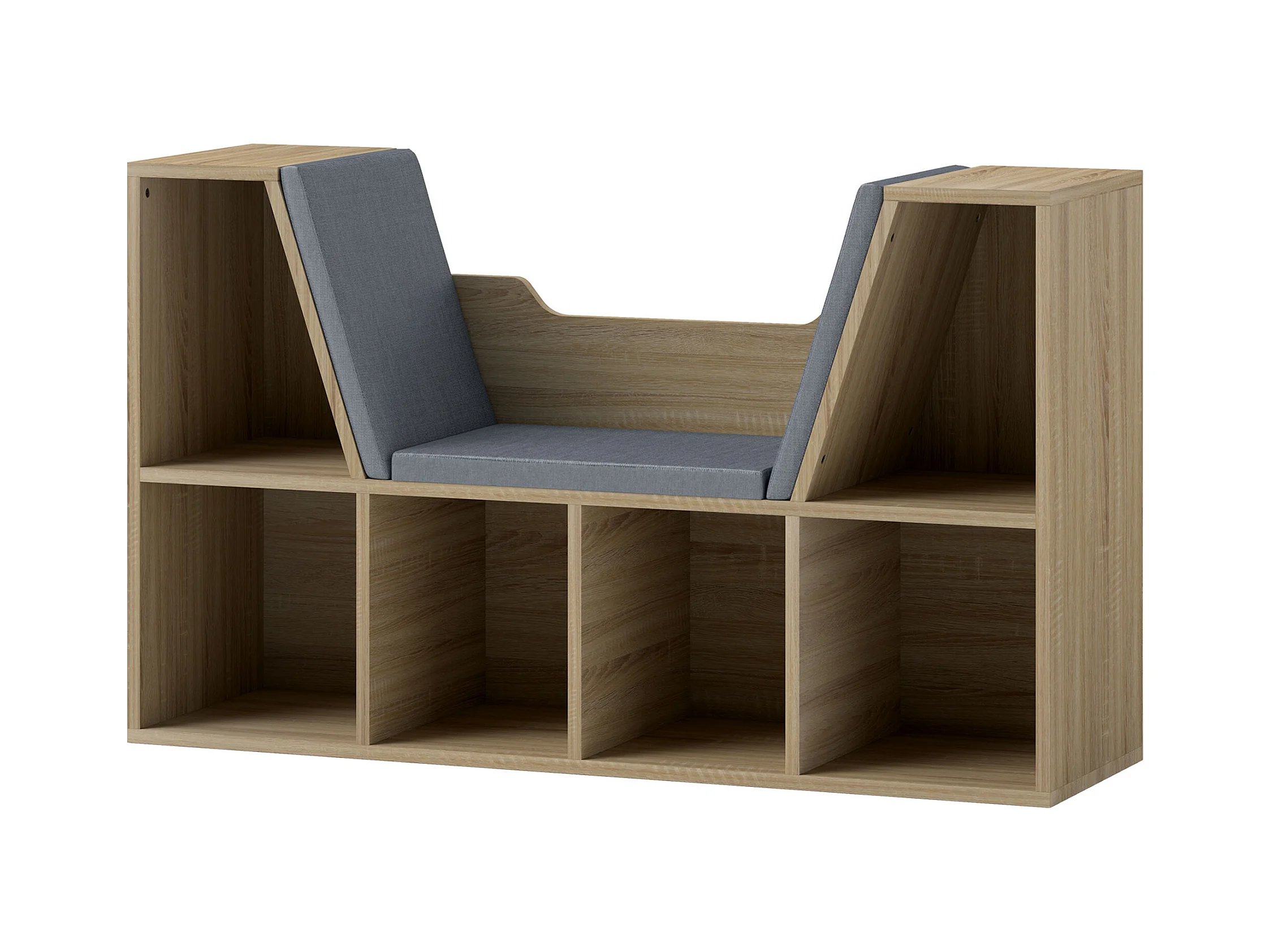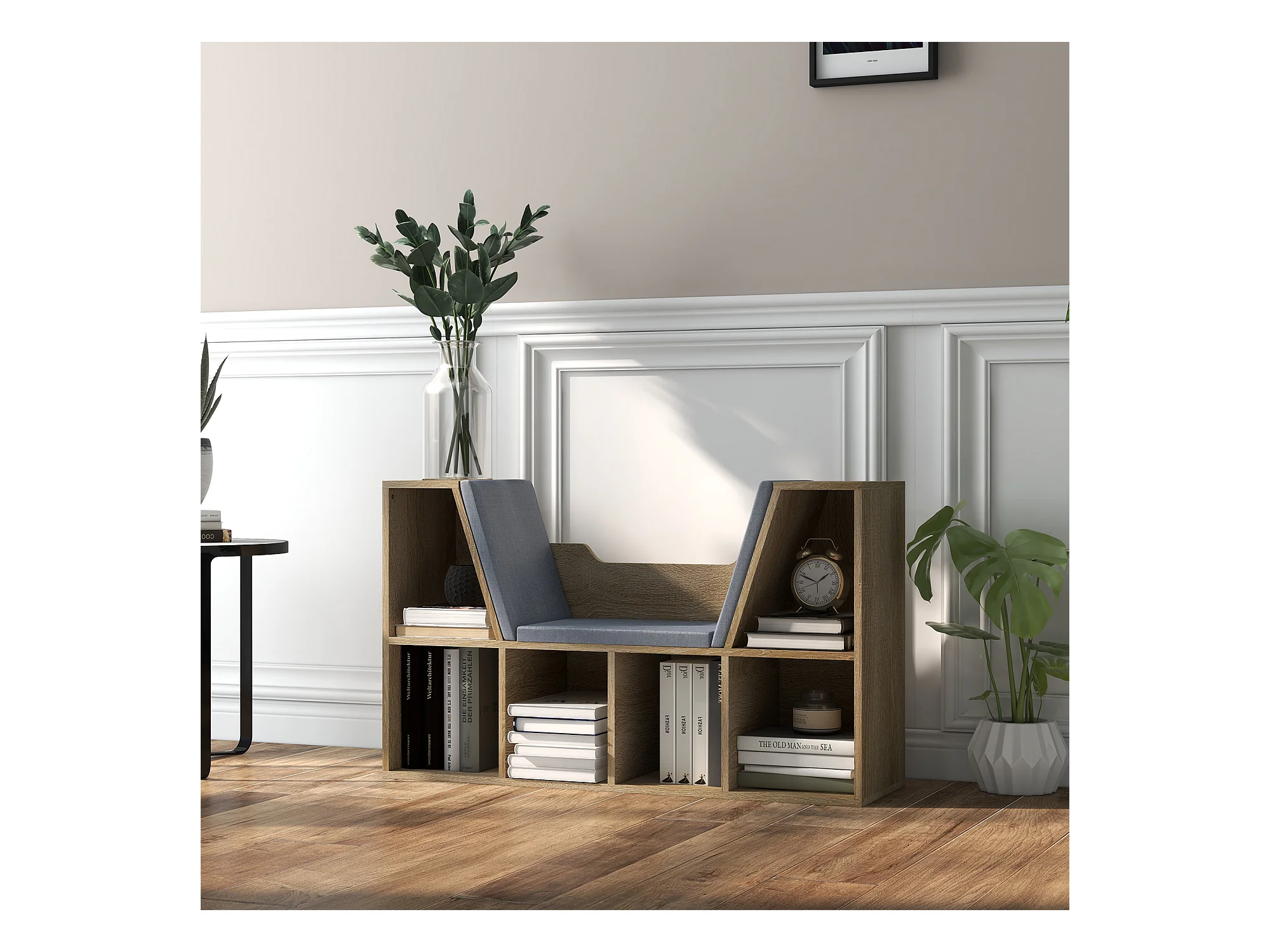 Bibliothèque banc 2 en 1 design contemporain 6 casiers 3 coussins fournis 102L x 30l x 61H cm aspect chêne clair gris