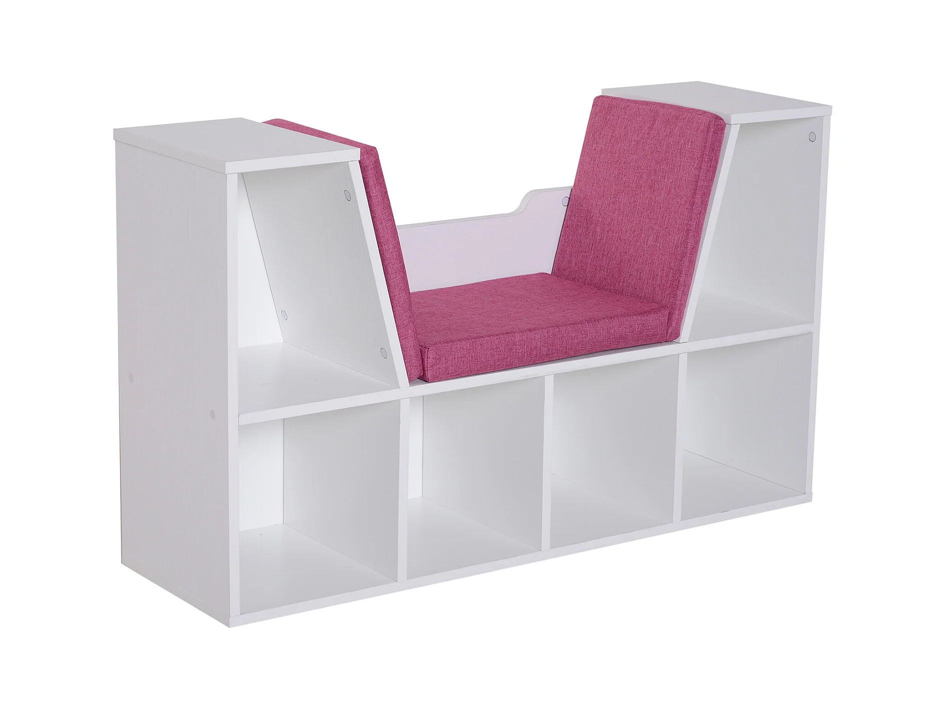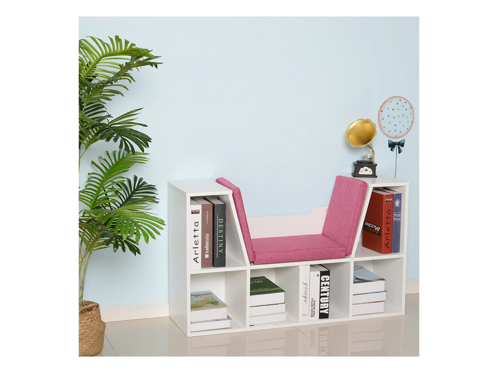 Bibliothèque banc 2 en 1 design contemporain 6 casiers 3 coussins fournis 102L x 30l x 61H cm blanc rose
