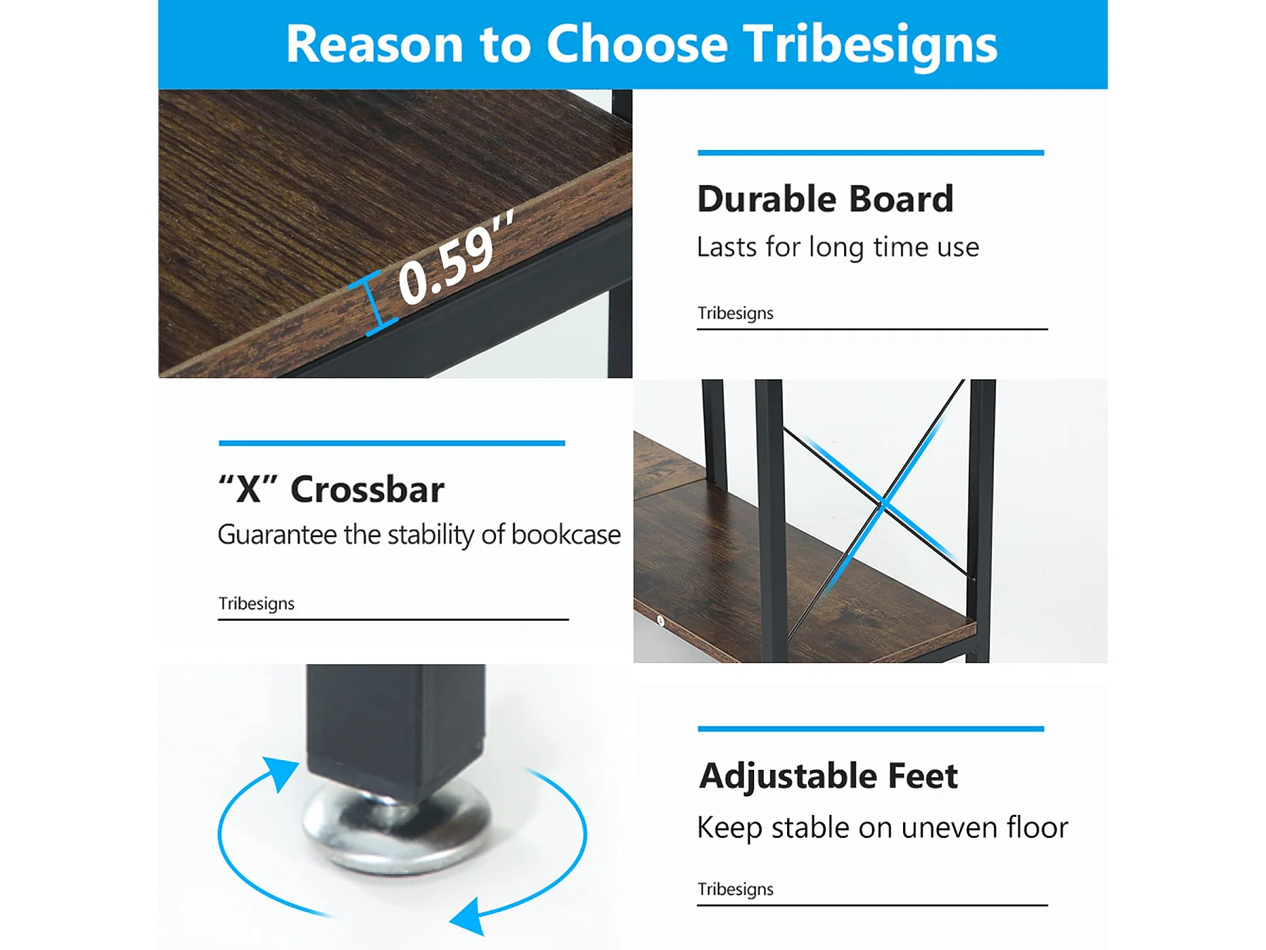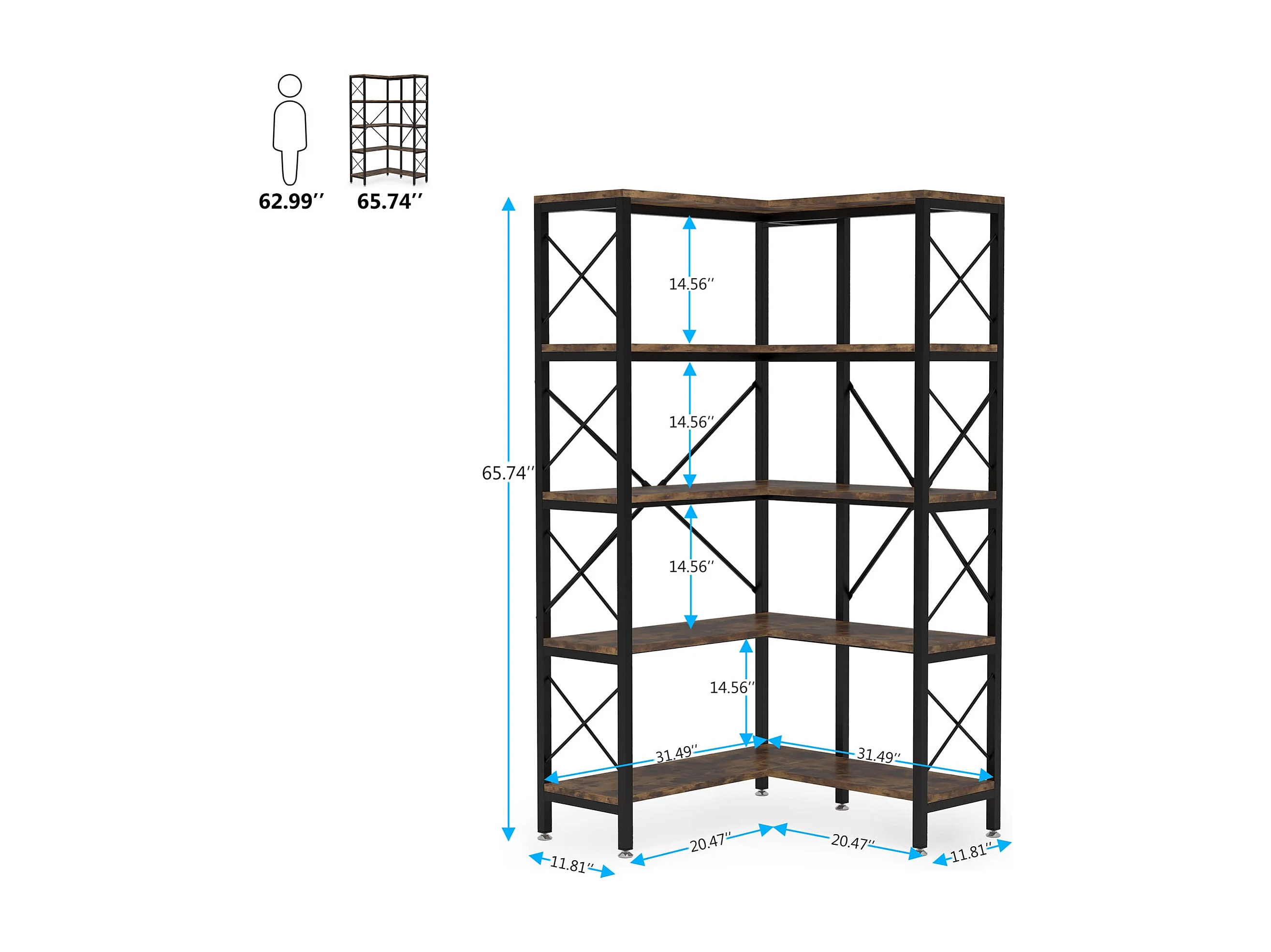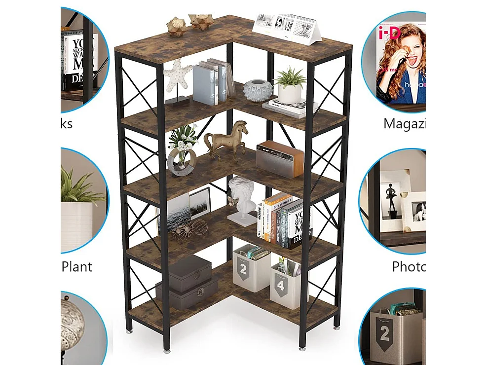 Bibliothèque d'angle à 5 Niveaux, Grande étagère Industrielle sur Pied avec Cadre en métal pour Salon, Maison, Bureau, Marron Rustique,Noir