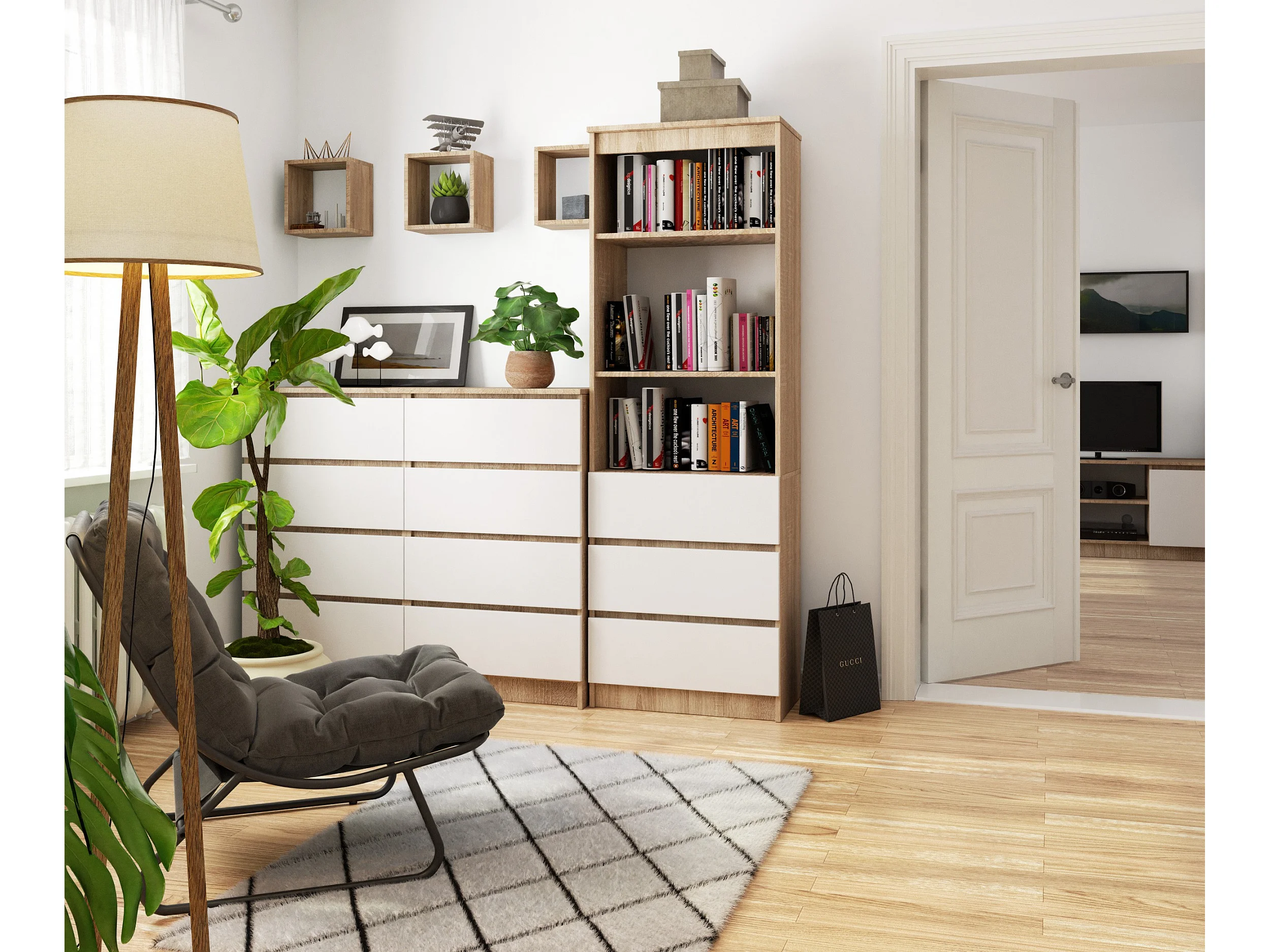 Bibliothèque de bureau AKORD R60 Chêne Sonoma 60 cm 3 tiroirs façade Blanche mat 3 étagères 60x35x180 cm