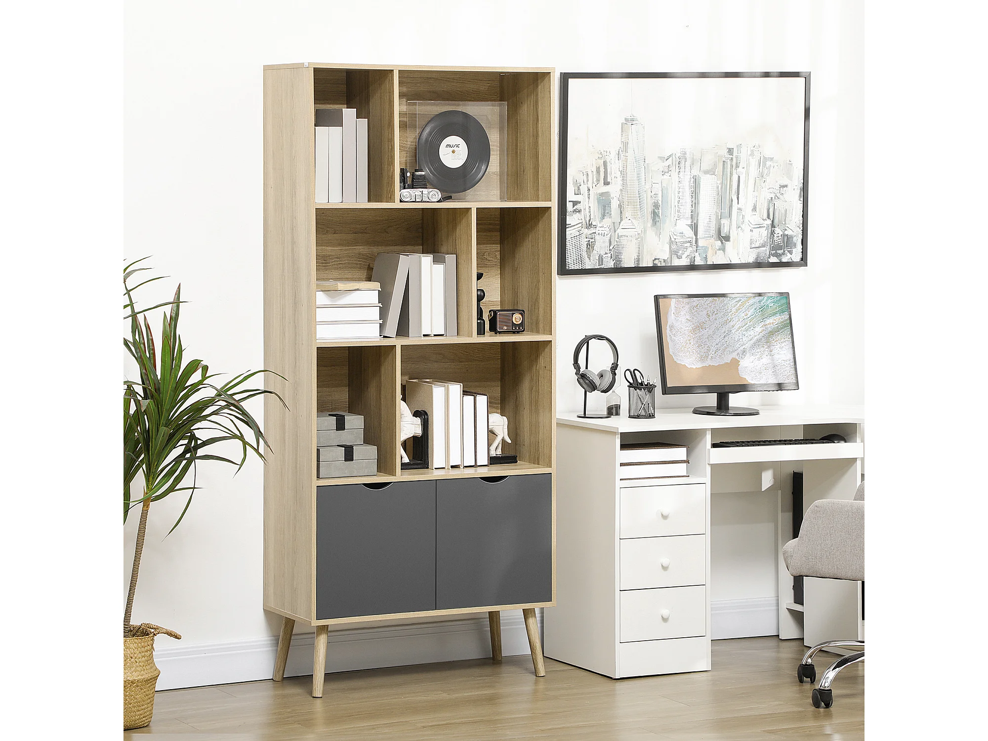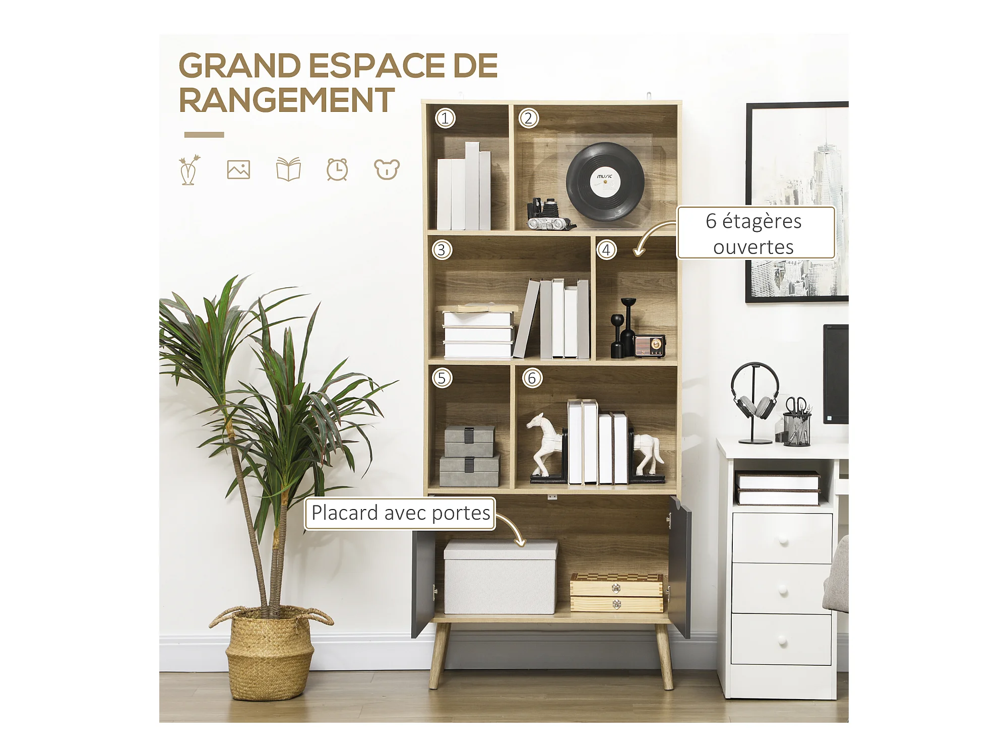 Bibliothèque design - 2 portes, 6 niches - dim. 80L x 35l x 180H cm - aspect chêne clair gris