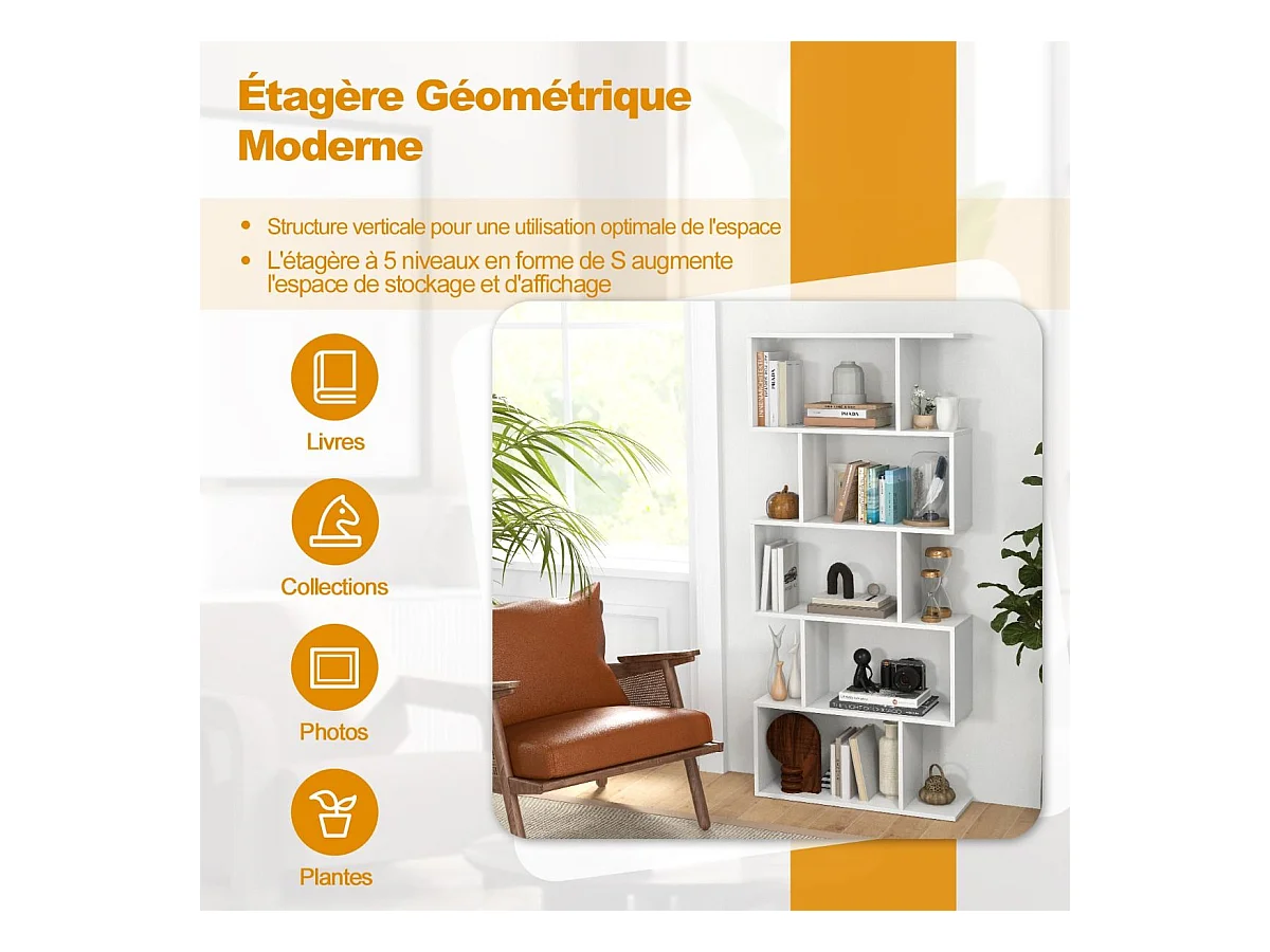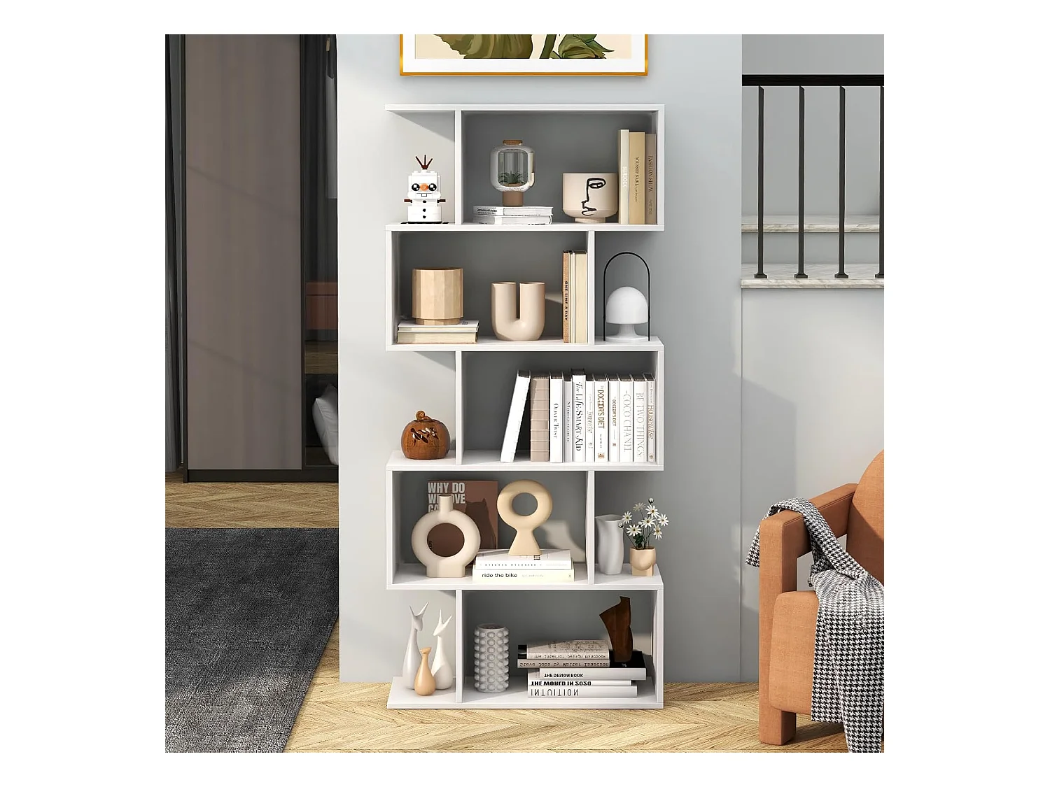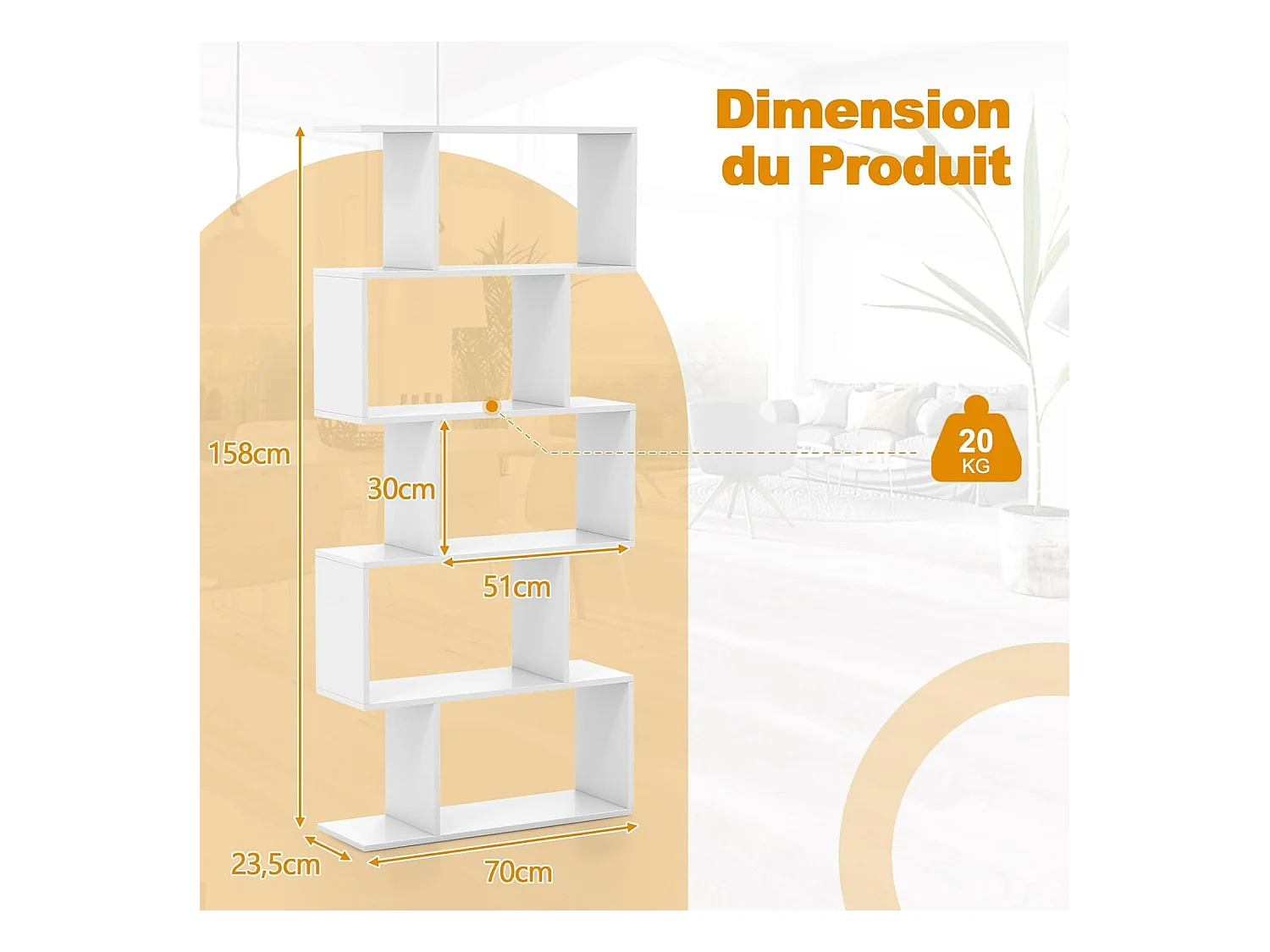 Bibliothèque en Forme de S, Étagère à 5 Niveaux, Meuble de Rangement avec Anti-basculement, 70 x 23,5 x 158 cm, Blanc