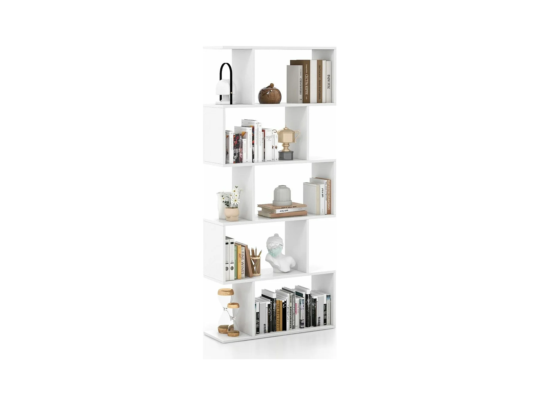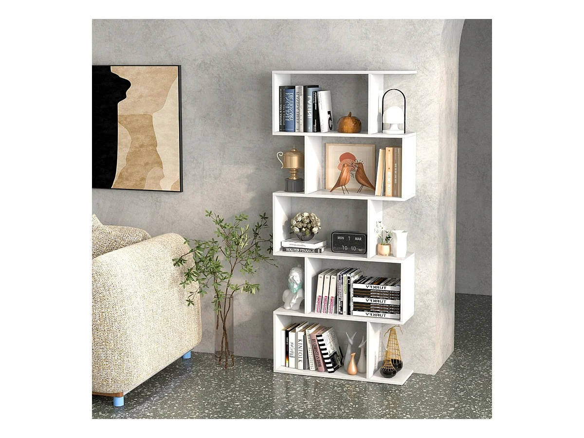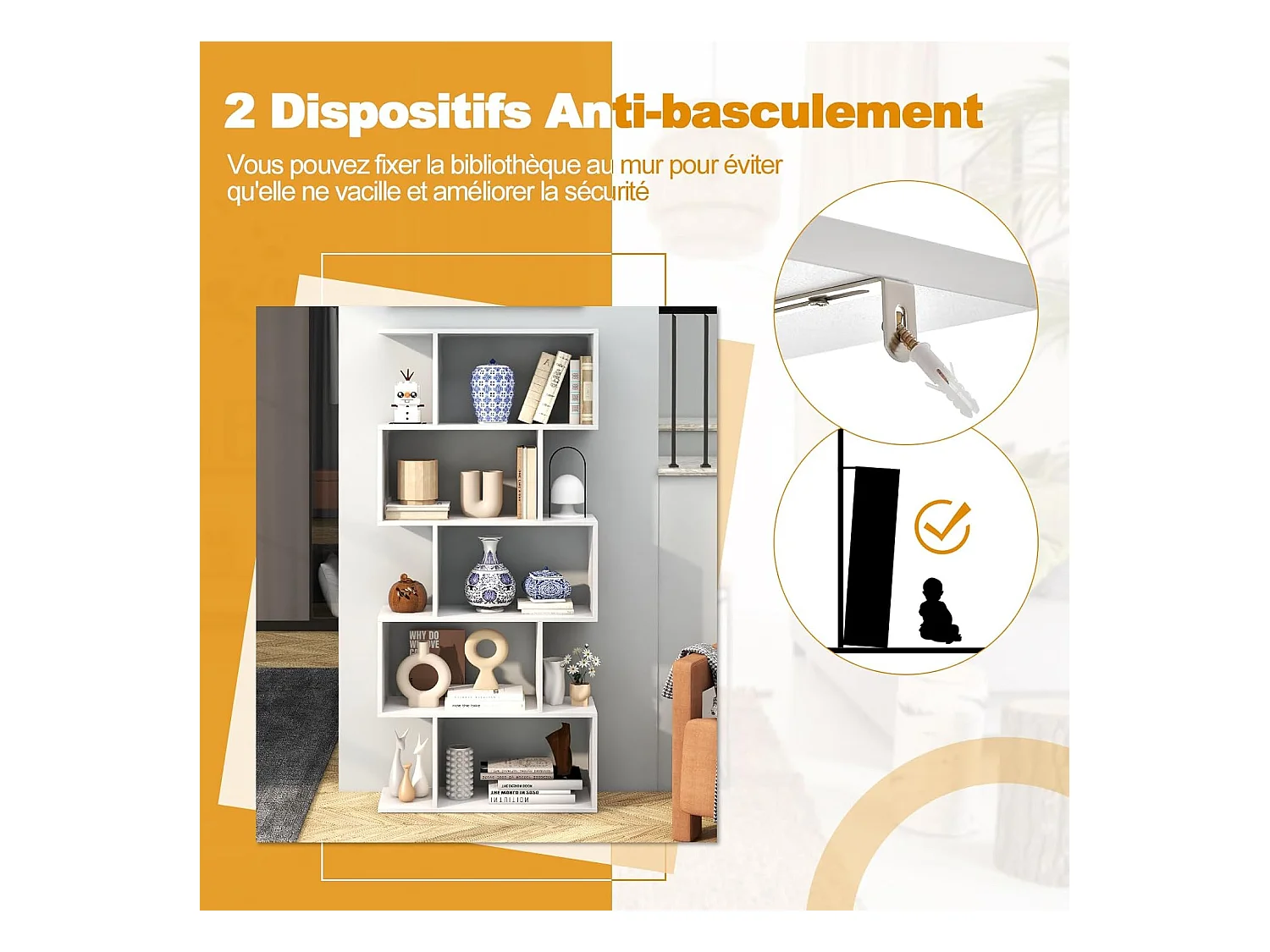Bibliothèque en Forme de S, Étagère à 5 Niveaux, Meuble de Rangement avec Anti-basculement, 70 x 23,5 x 158 cm, Blanc
