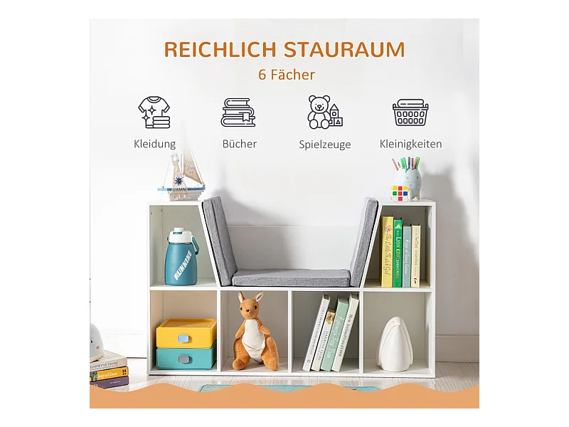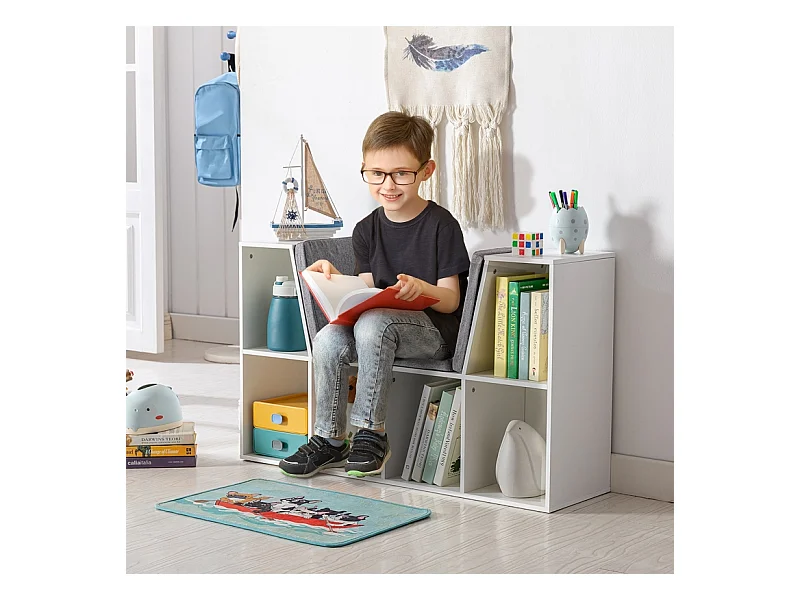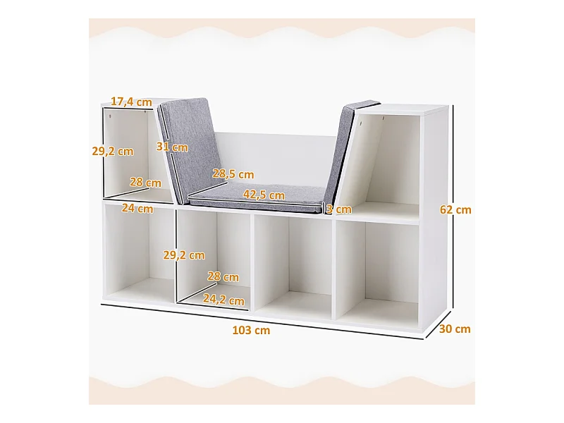 Bibliothèque enfant avec siège, 6 compartiments, MDF, blanc et gris, avec coussins (103x30x62 cm)