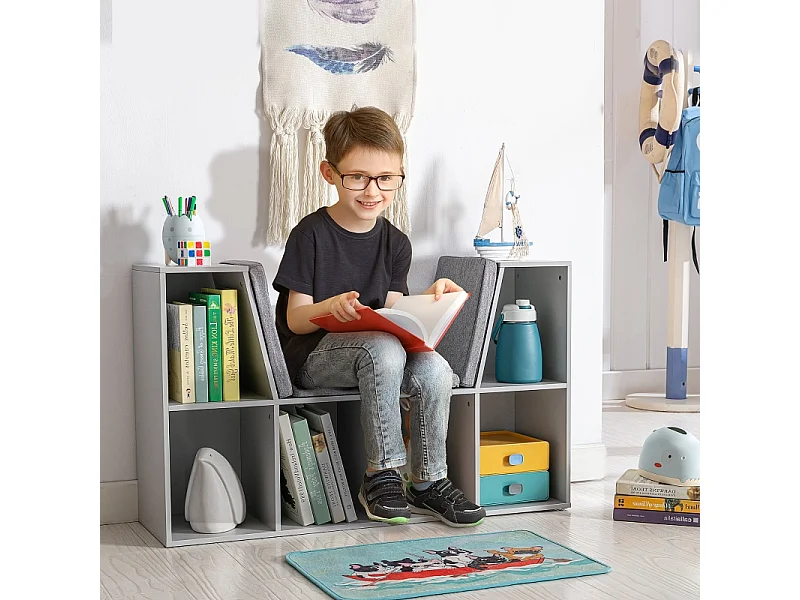 Bibliothèque enfant avec banc et 6 compartiments, en MDF, gris et naturel (103x30x62 cm)