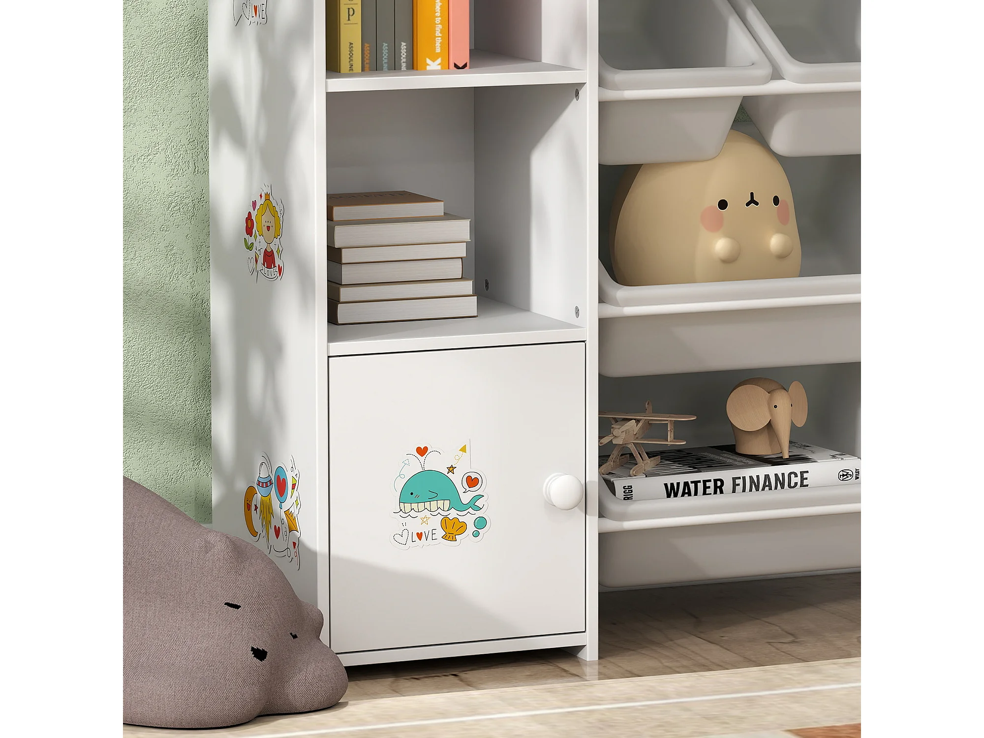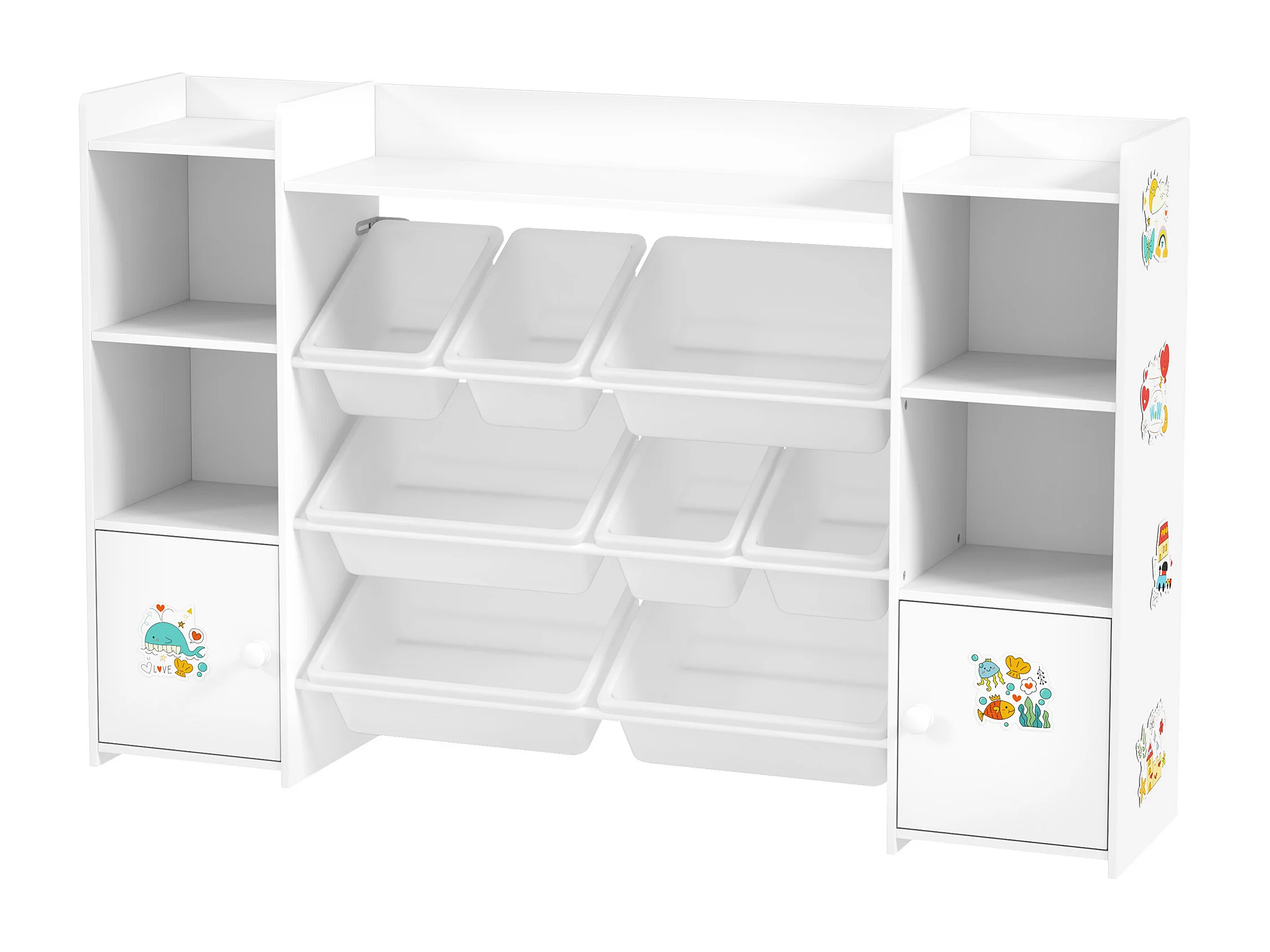 Bibliothèque enfant - rangement à bacs posés x 8 - 4 niches, 3 étagères, 2 portes - blanc