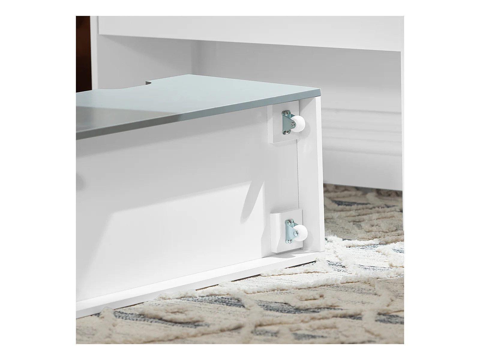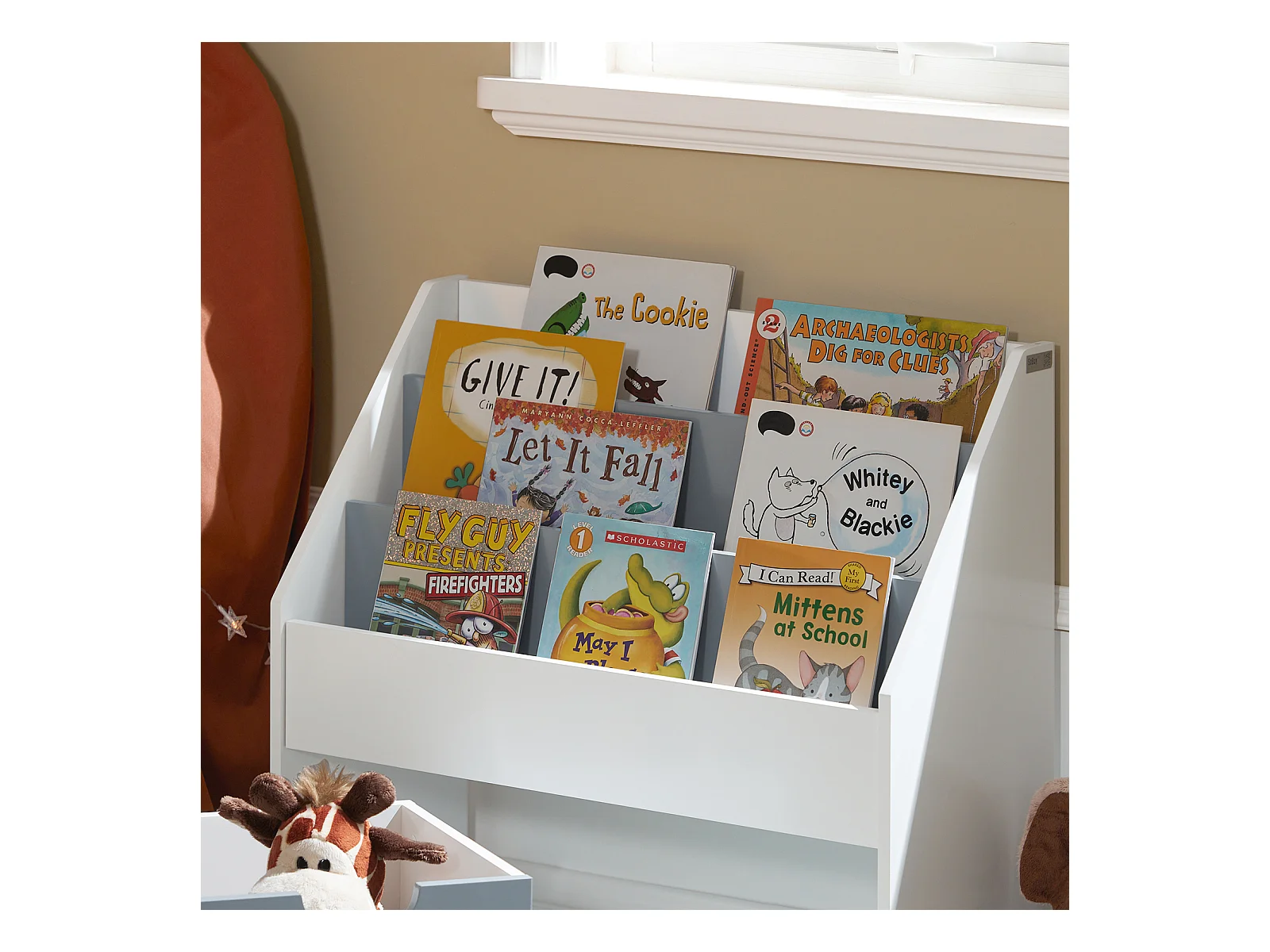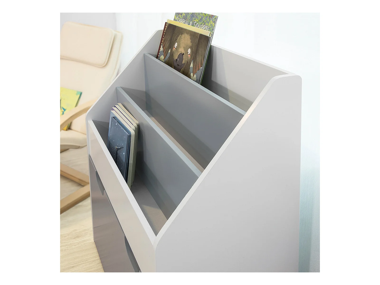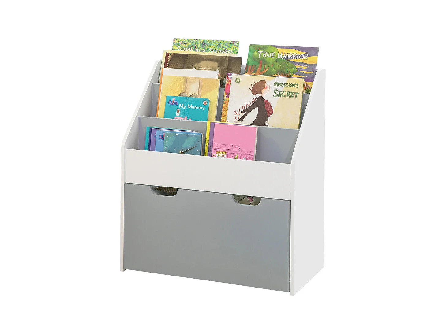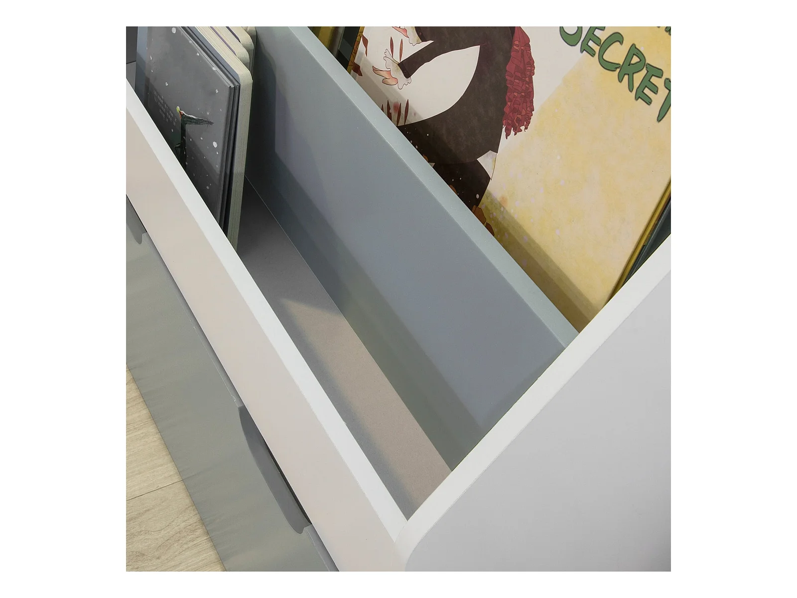 Bibliothèque Enfant blanche & grise avec bac de rangement sur roulette