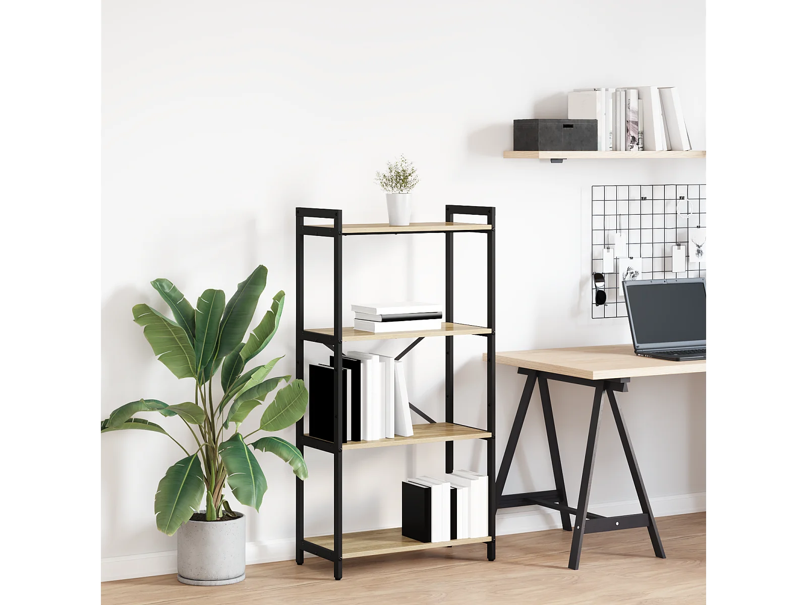 Bibliothèque, meuble étagère aspect bois coloris chêne et métal noir - Longueur 58 x Profondeur 35 x Hauteur 175 cm