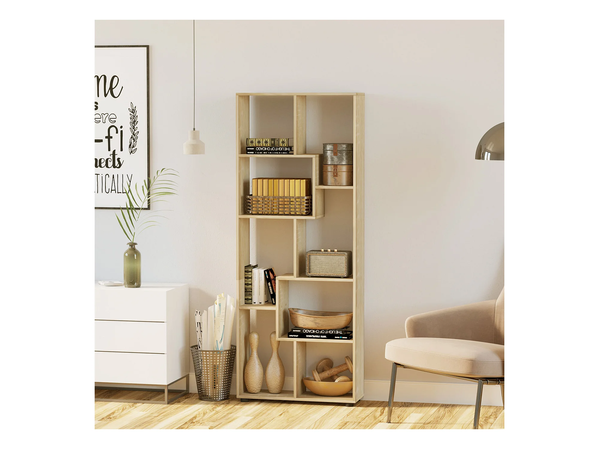 Bibliothèque étagère meuble de rangement dim. 70L x 24l x 178H cm en zigazag et 8 espaces en panneau de particules naturel
