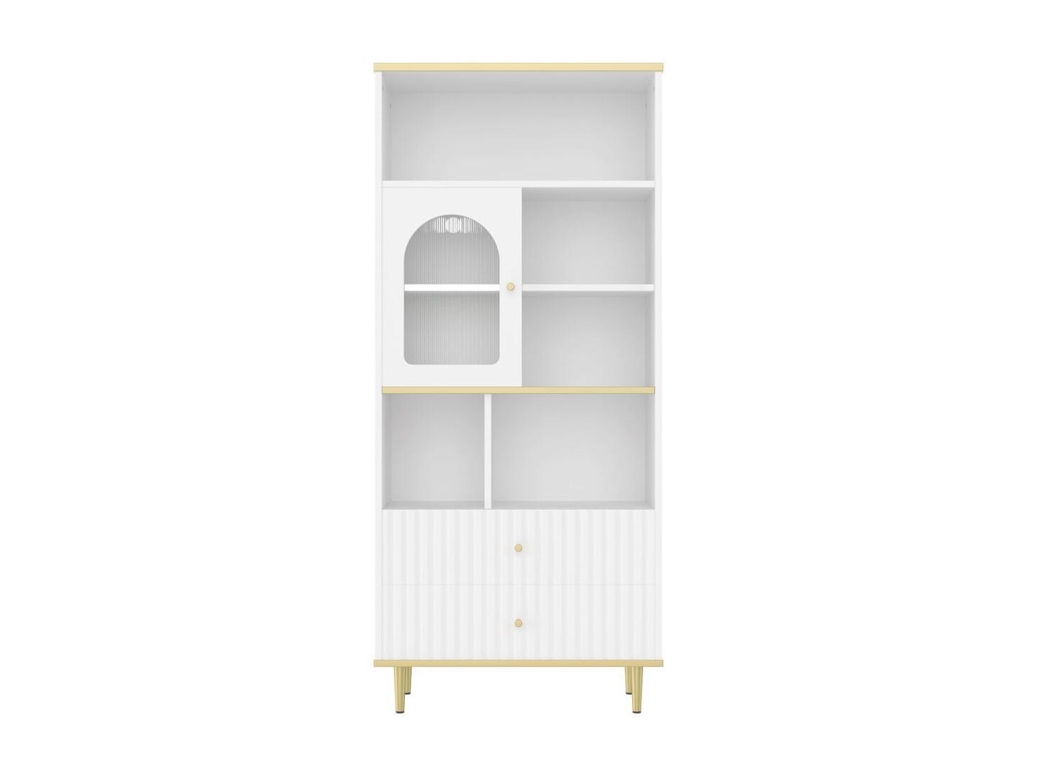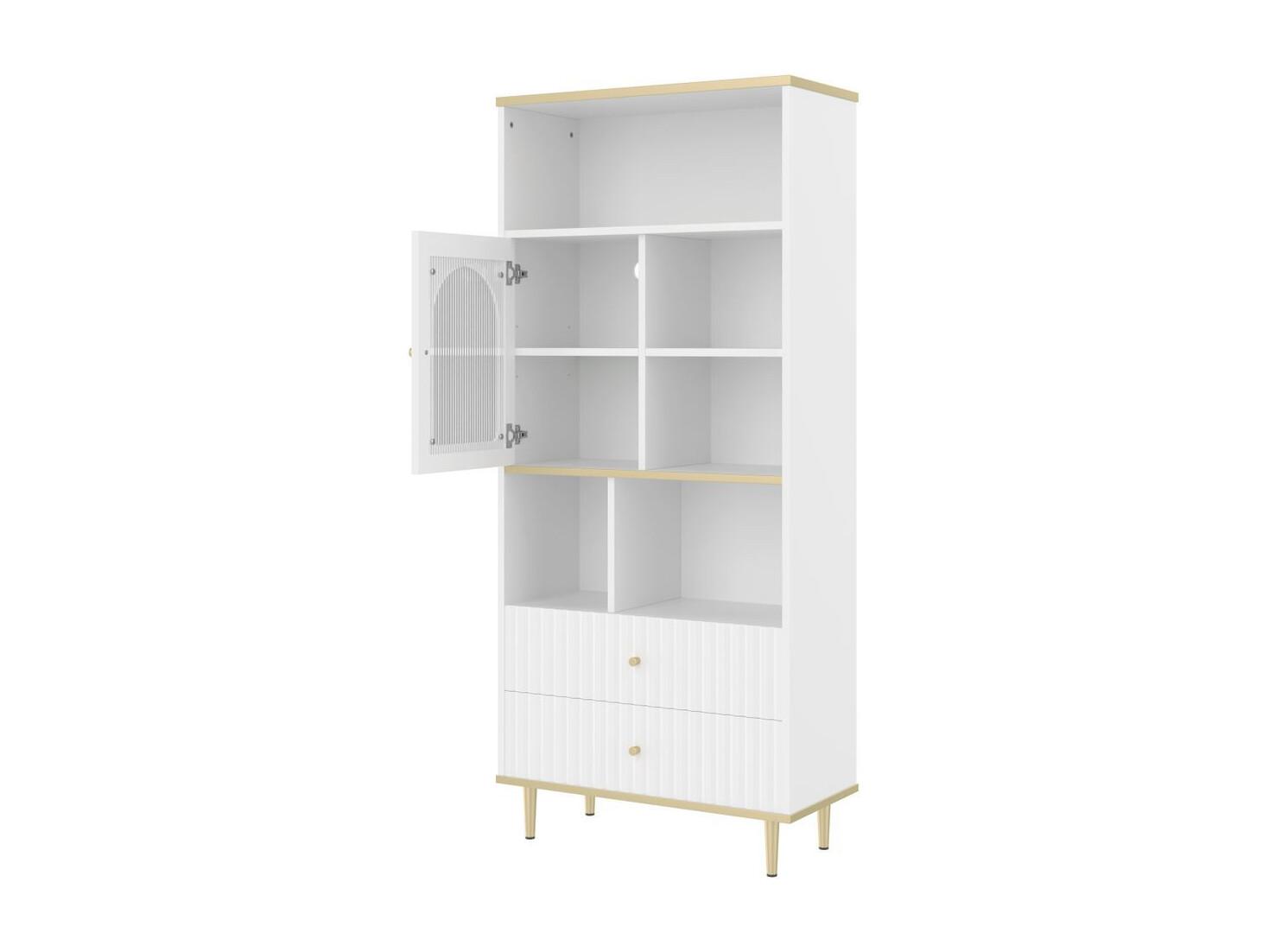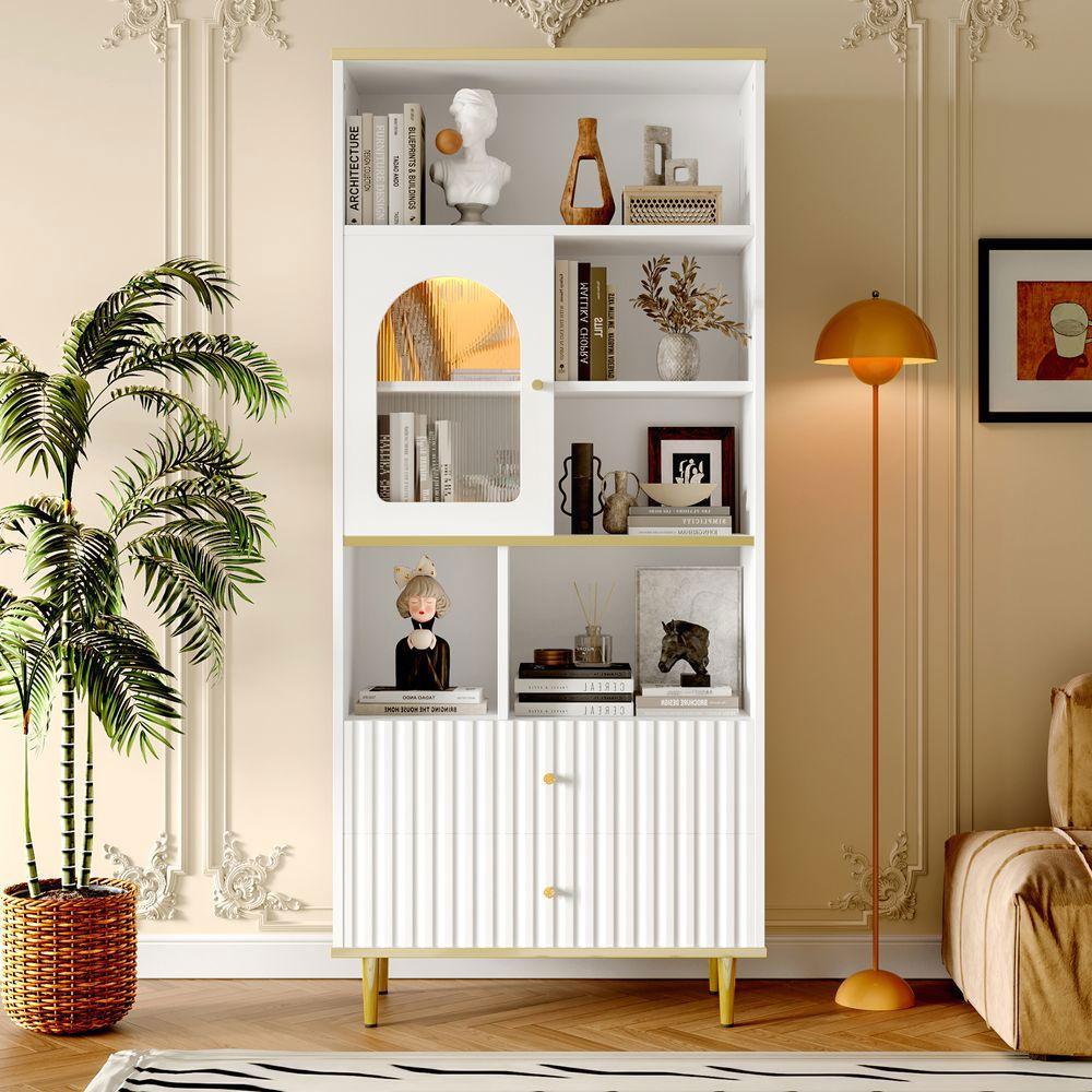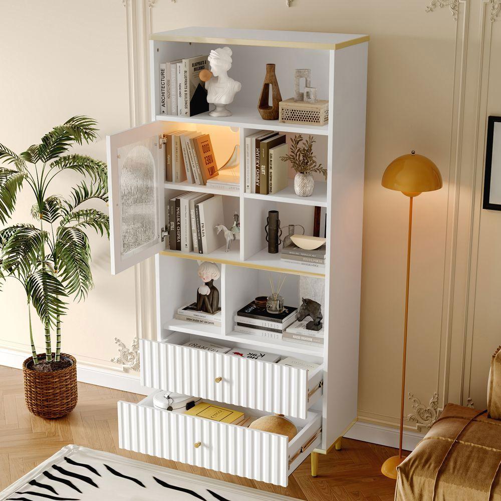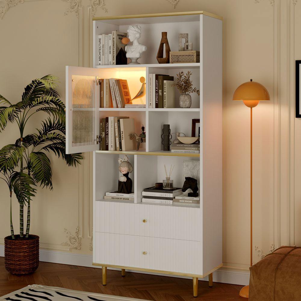 Bibliotheque multifonctionnelle rangement multicouche porte vitree deux tiroirs silencieux bande lumineuse couleur telecommandee pieds metal blanc