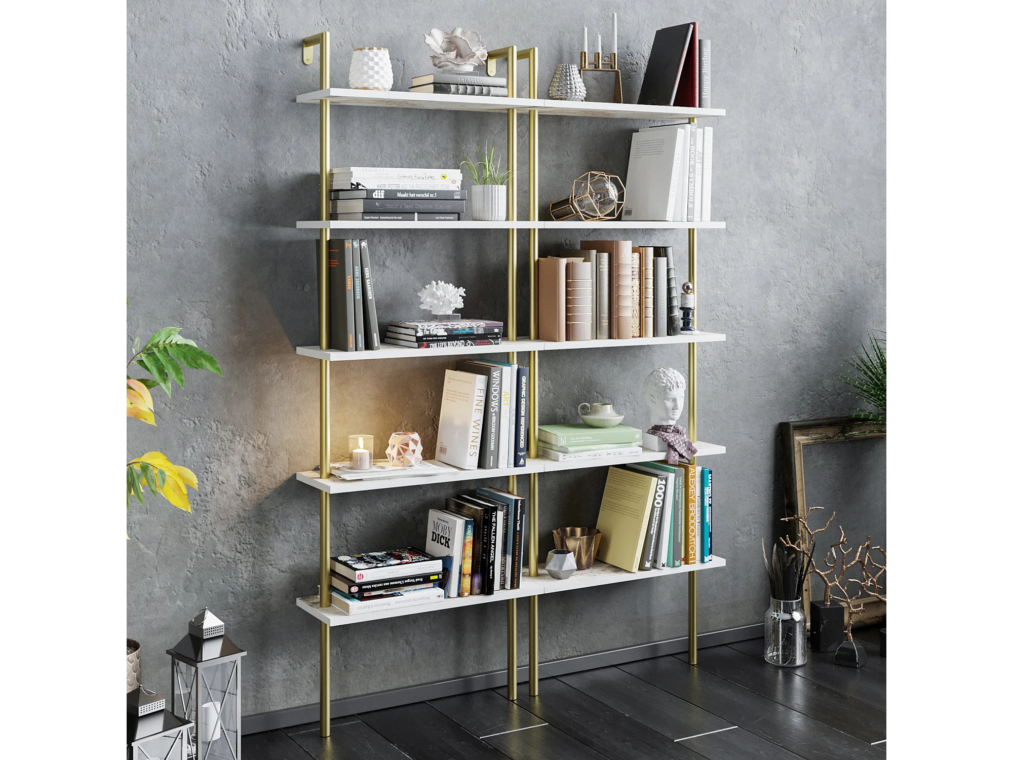 Bibliothèque 5 étagères marbre blanc et métal doré