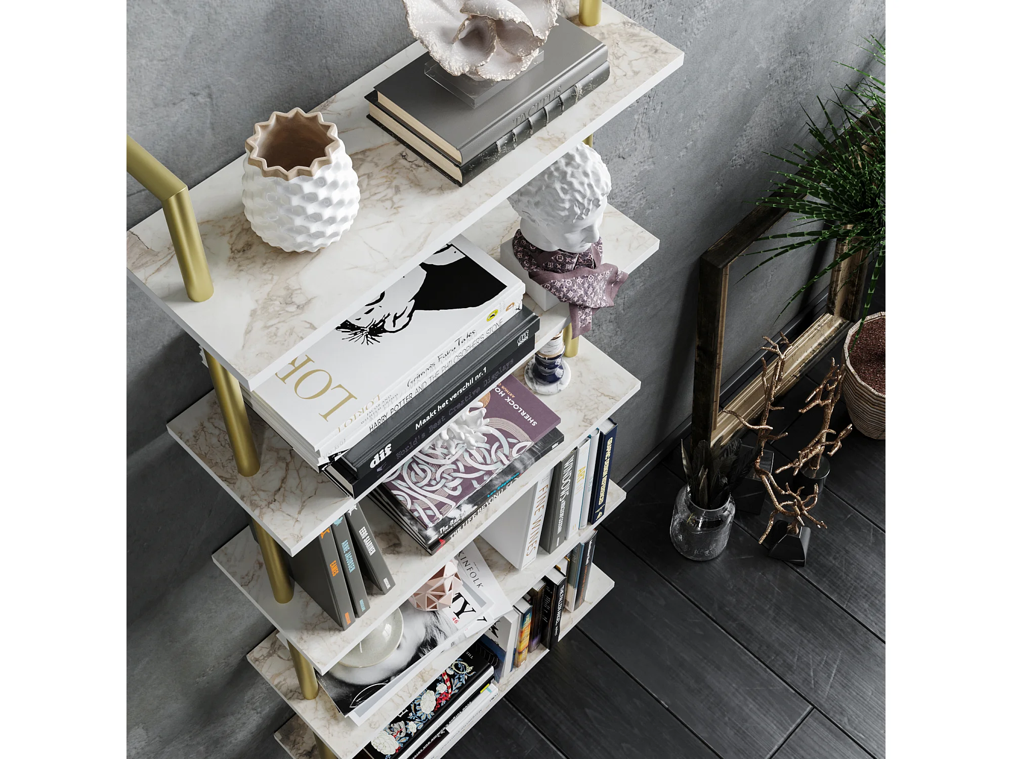 Bibliothèque d`angle 5-étagères Alice avec le cadre en métal (Doré et Effet marbre blanc)