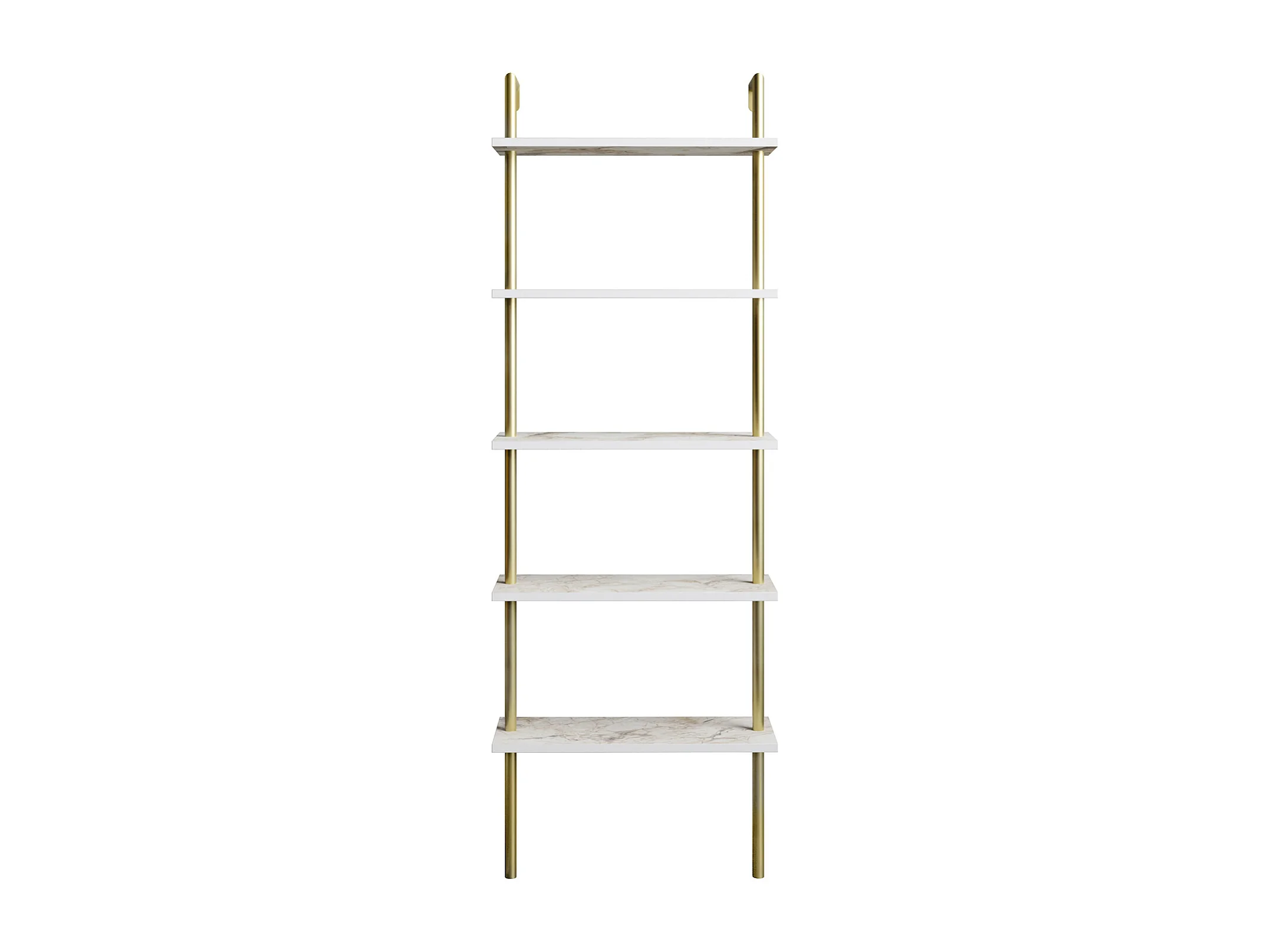 Bibliothèque Paula murale 5 étagères, cadre en métal (Doré et Effet marbre blanc)