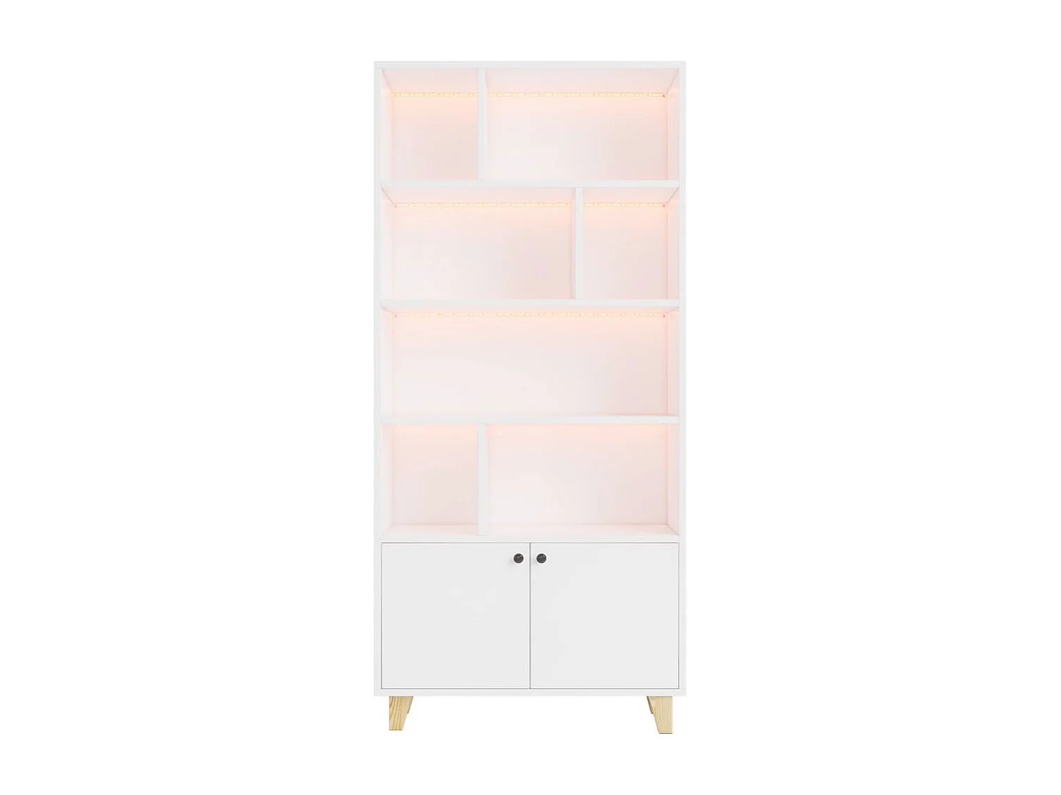 Bibliotheque pieds bois massif nombreux casiers double porte eclairage LED couleur variable telecommande forme simple blanc
