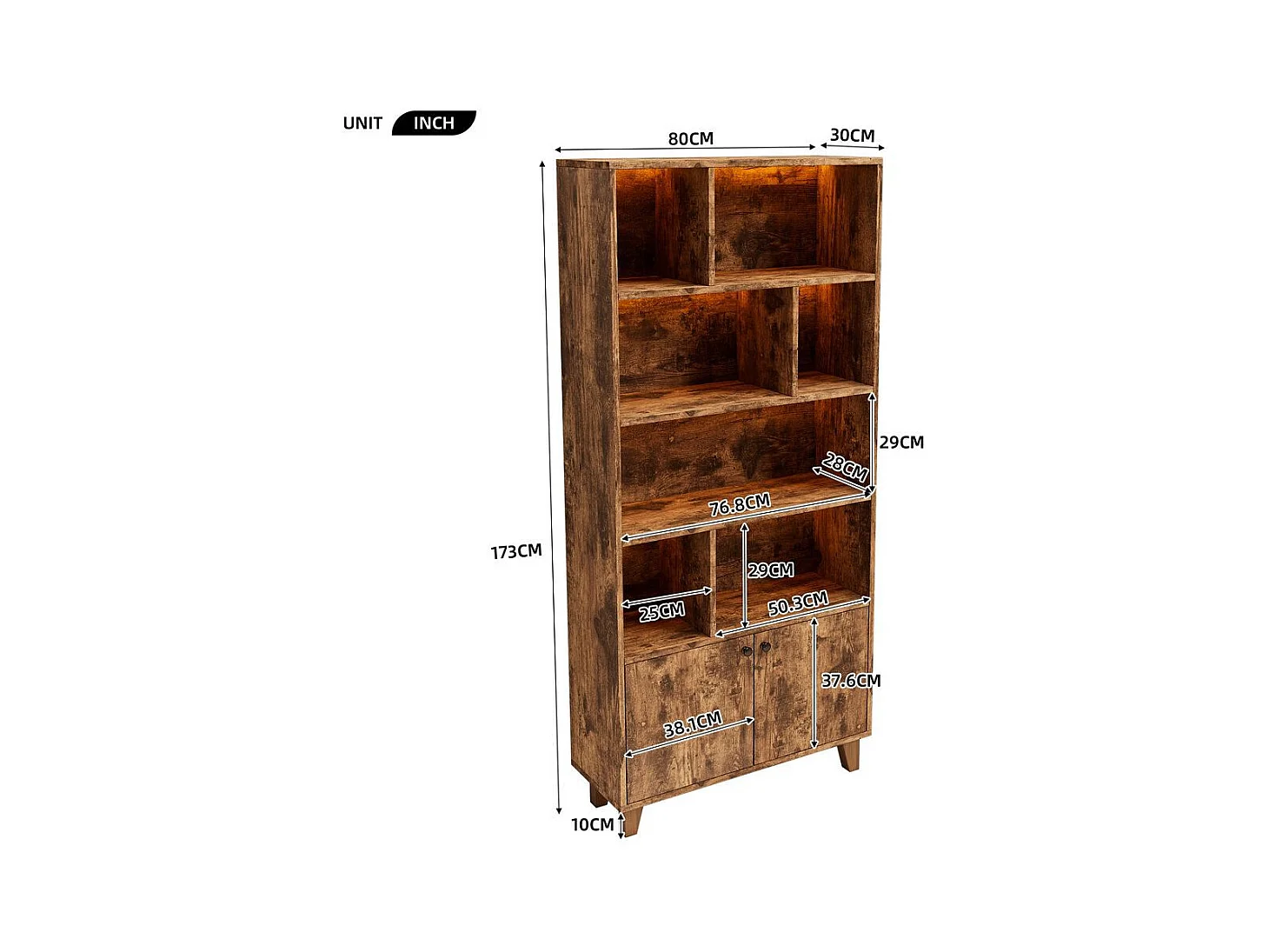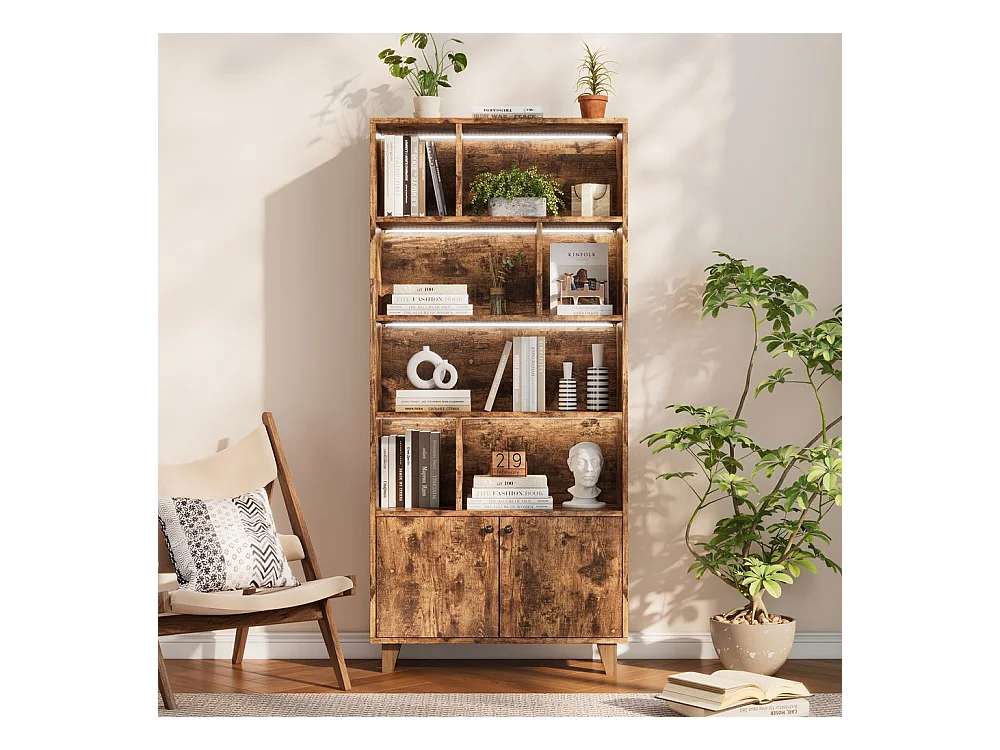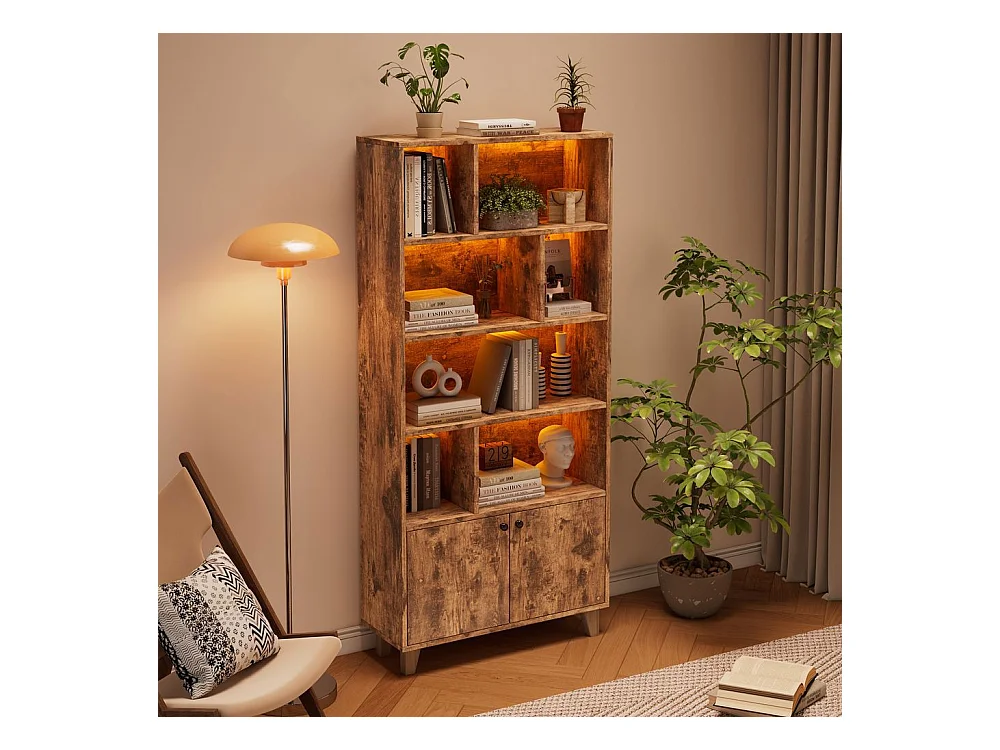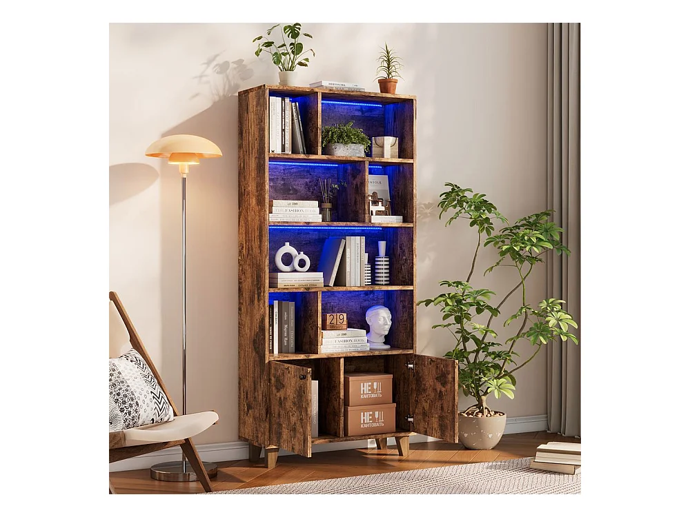 Bibliotheque pieds bois massif nombreux casiers double porte eclairage LED couleur variable telecommande forme simple marron