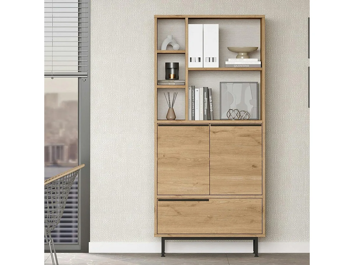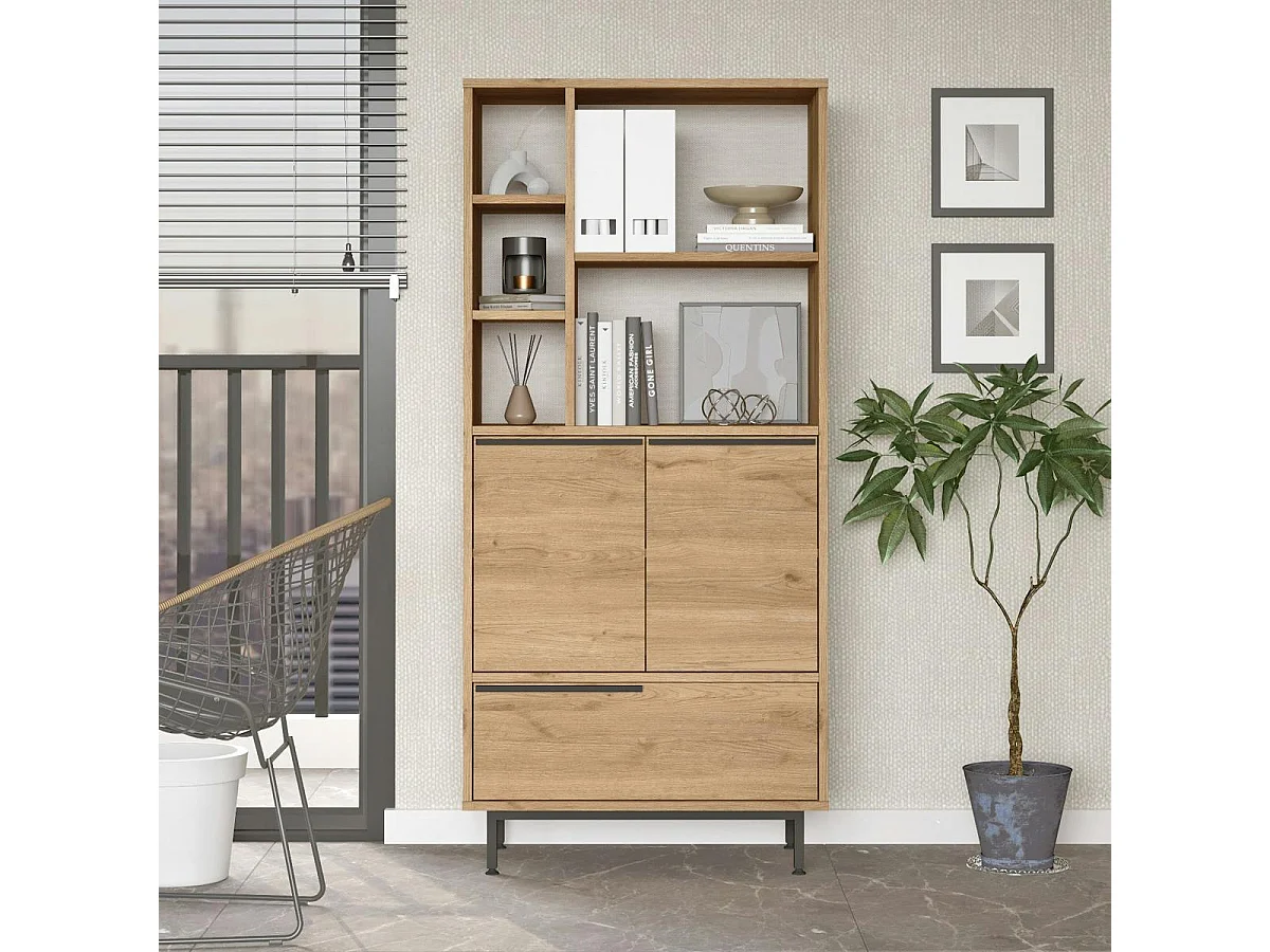 Bibliothèque salon 3 portes 2 étagères décor bois JENA