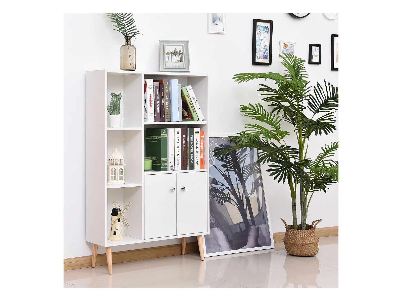 Bibliothèque scandinave 4 niches + 2 placards avec étagère dim. 80L x 24l x 123H cm pieds effilés inclinés bois massif panneaux particules blanc