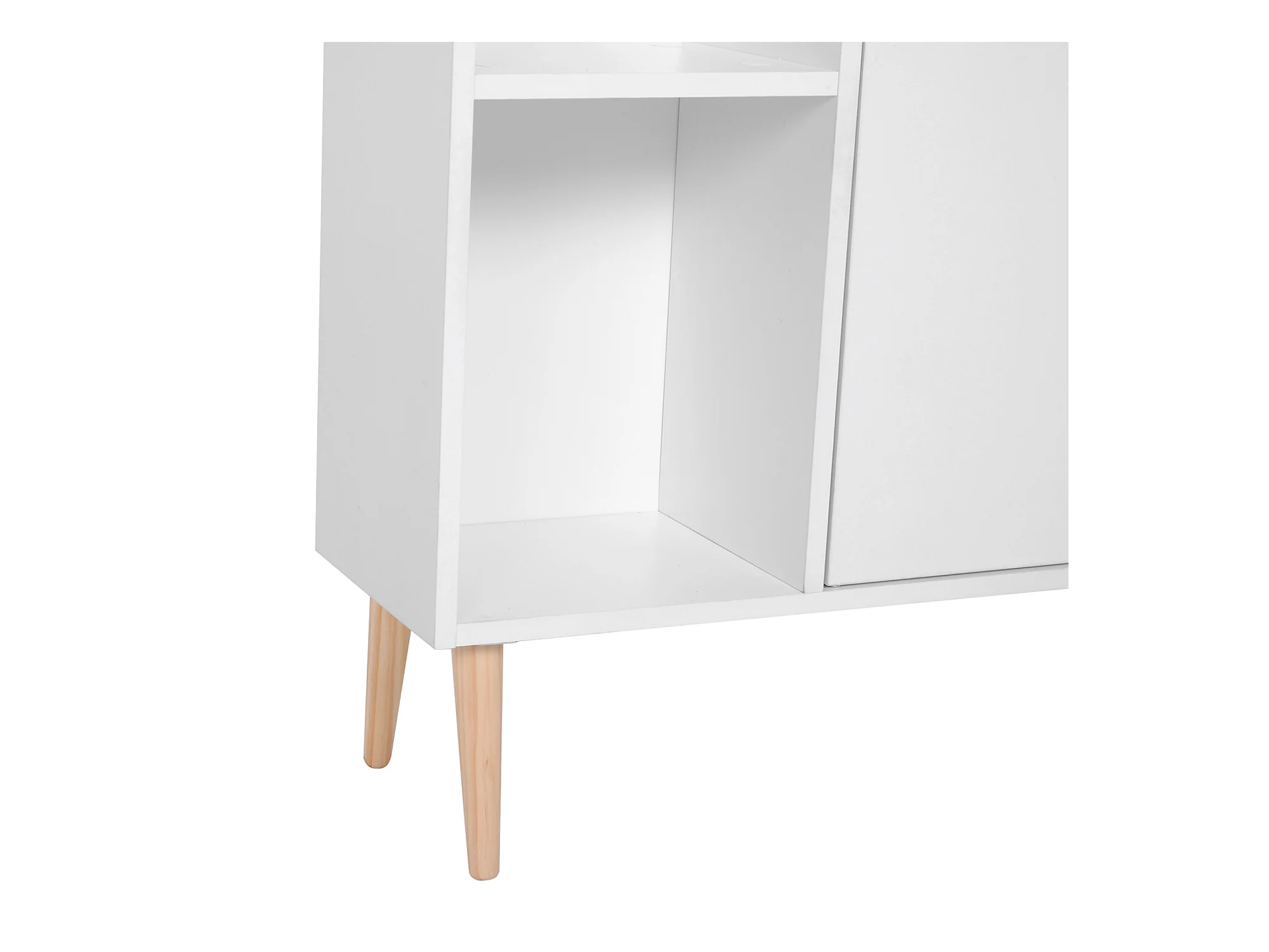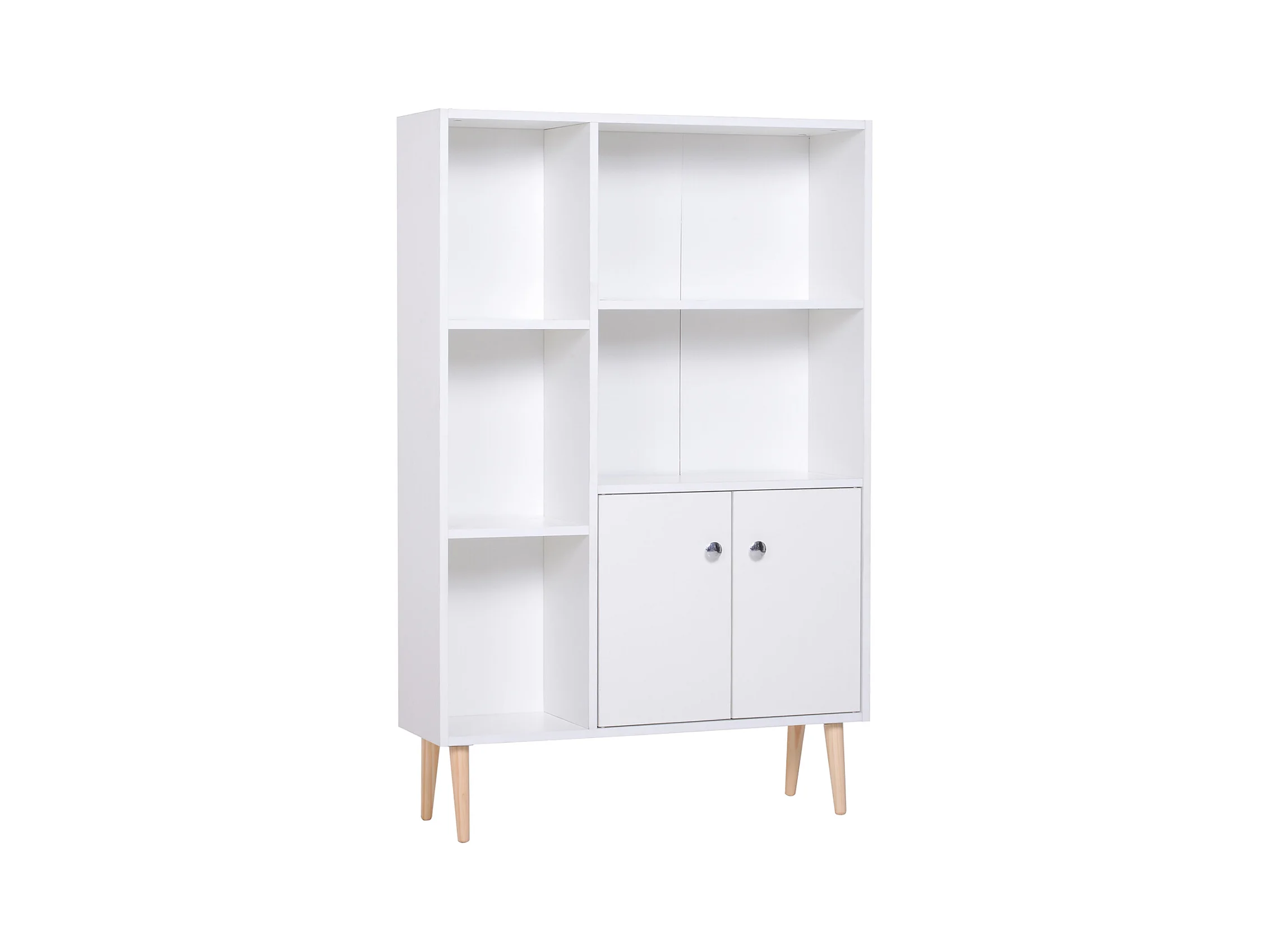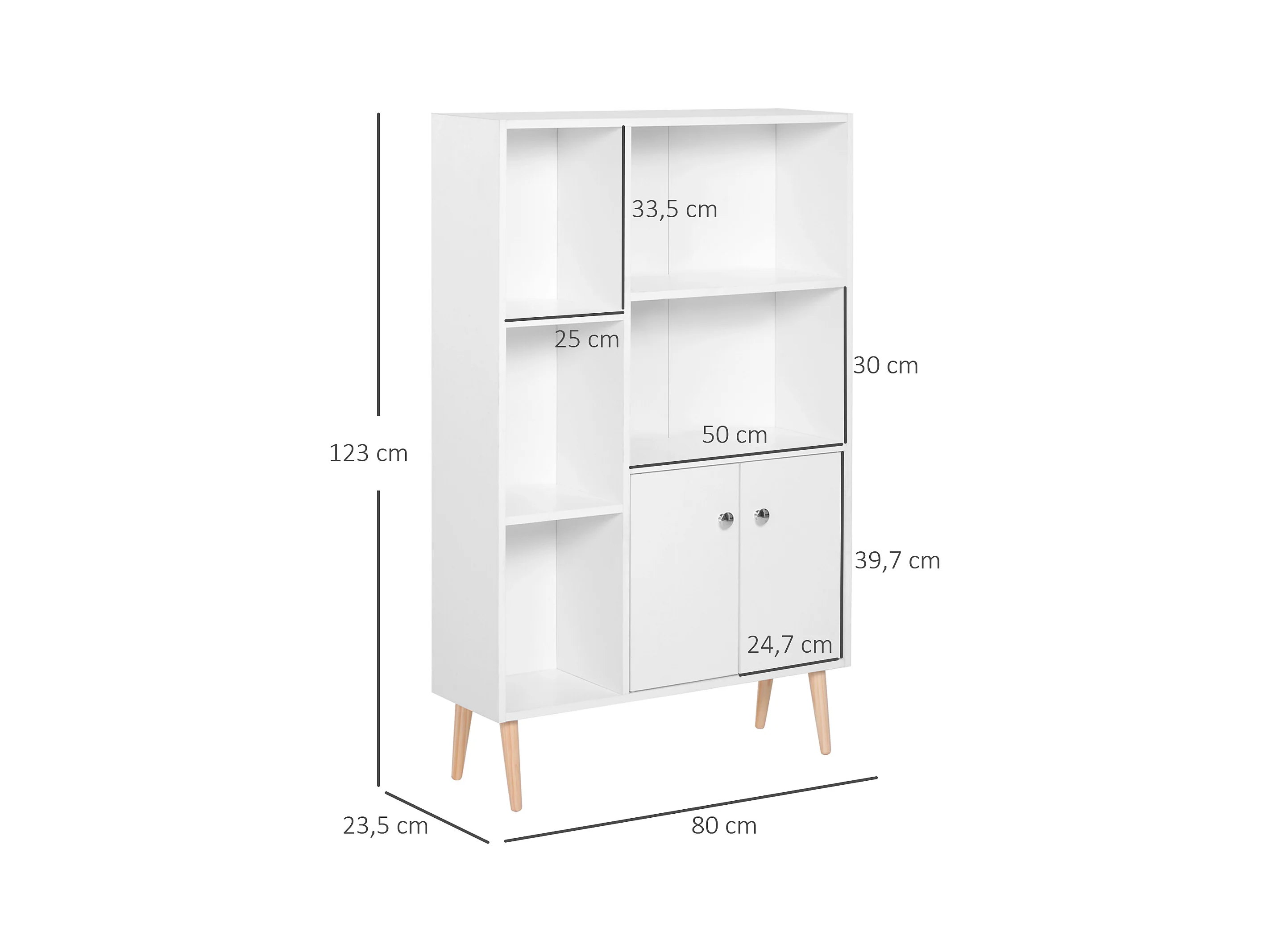 Bibliothèque scandinave dim. 80L x 23,5l x 123H cm 5 niches placard 2 portes pieds effilés inclinés bois massif panneaux particules blanc