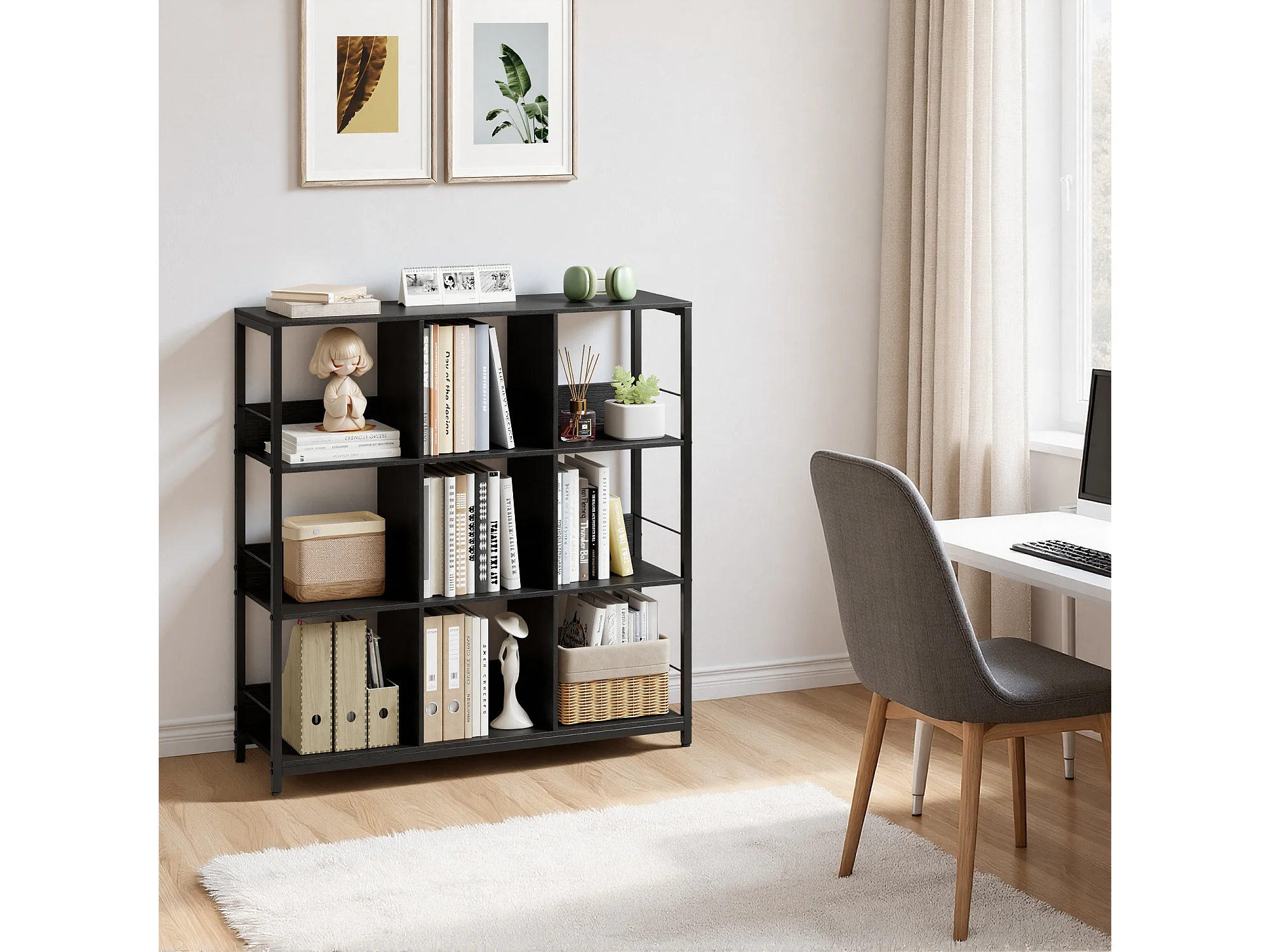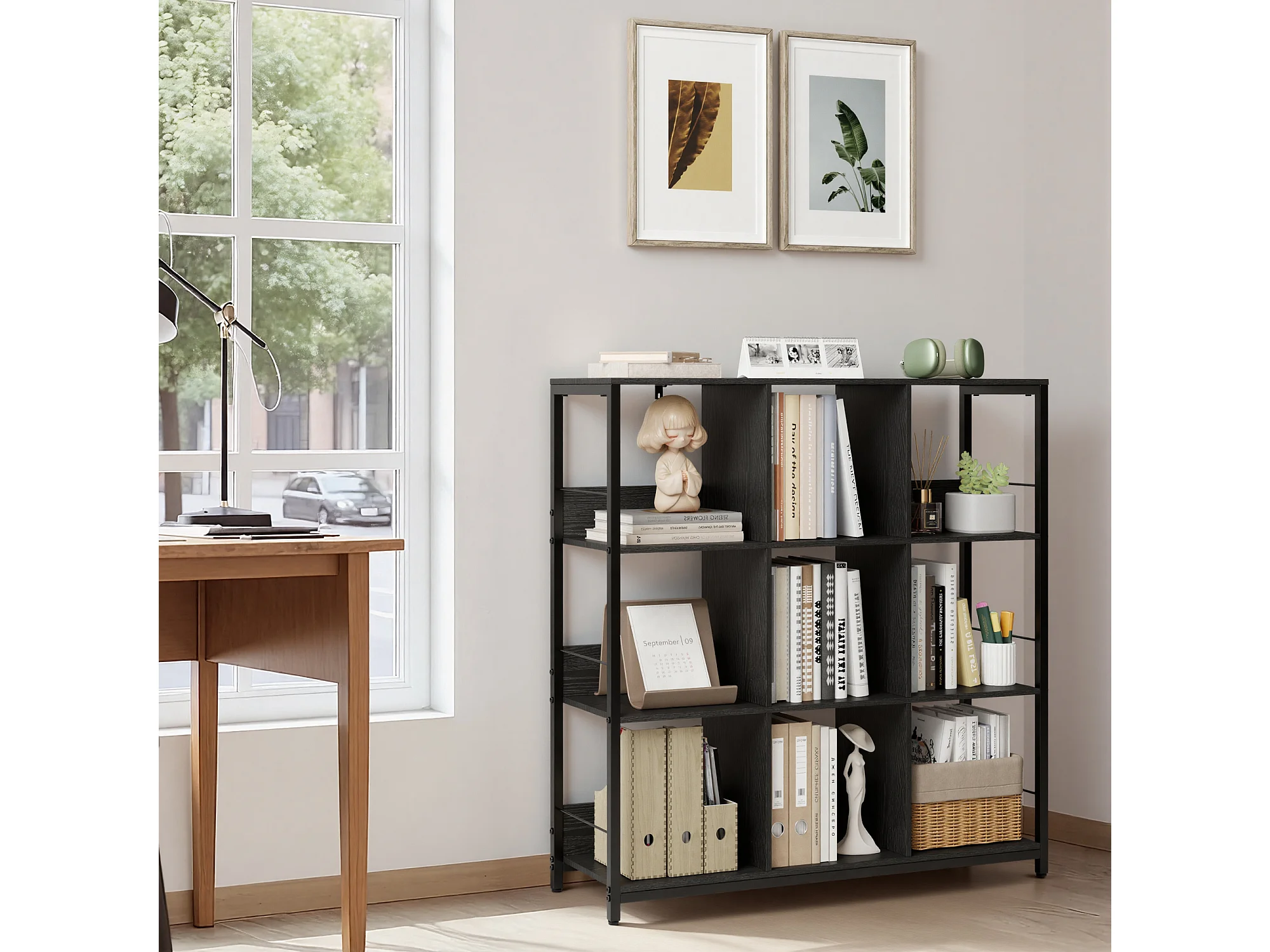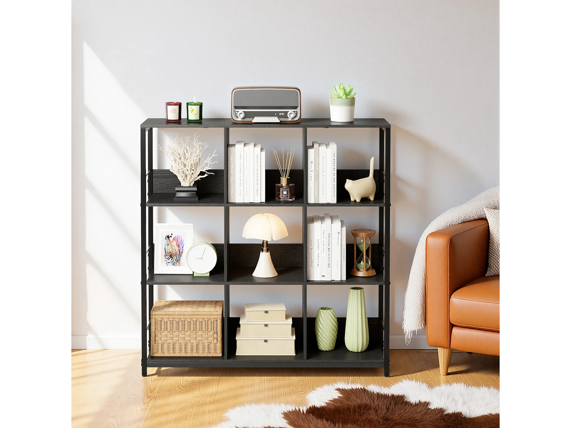 Bibliothèque Séparation 9 Cases Imitation Chêne Et Acier Noir