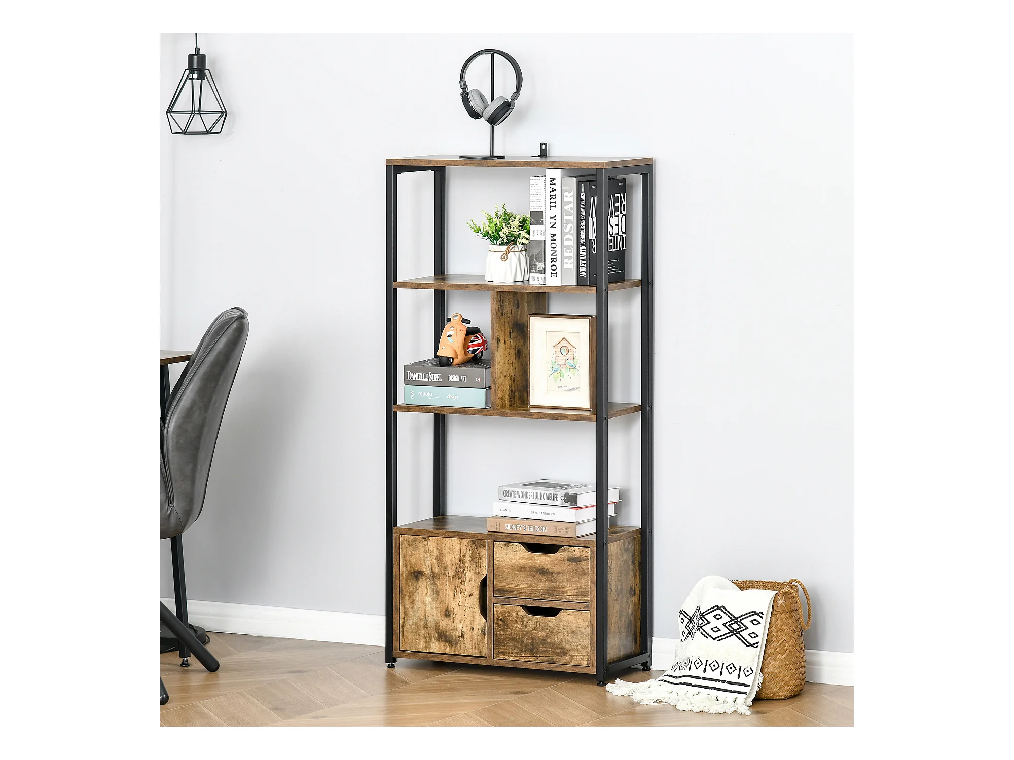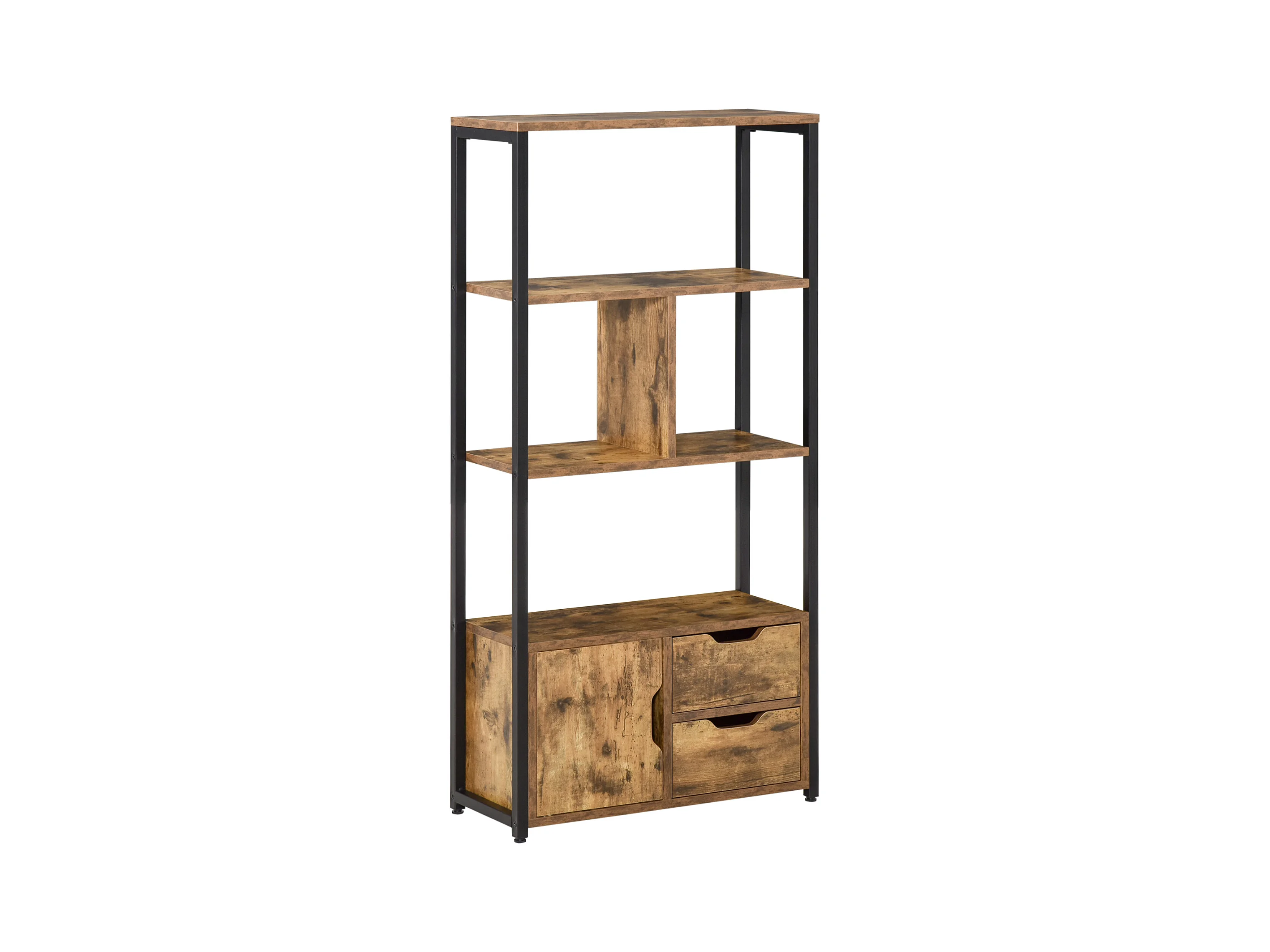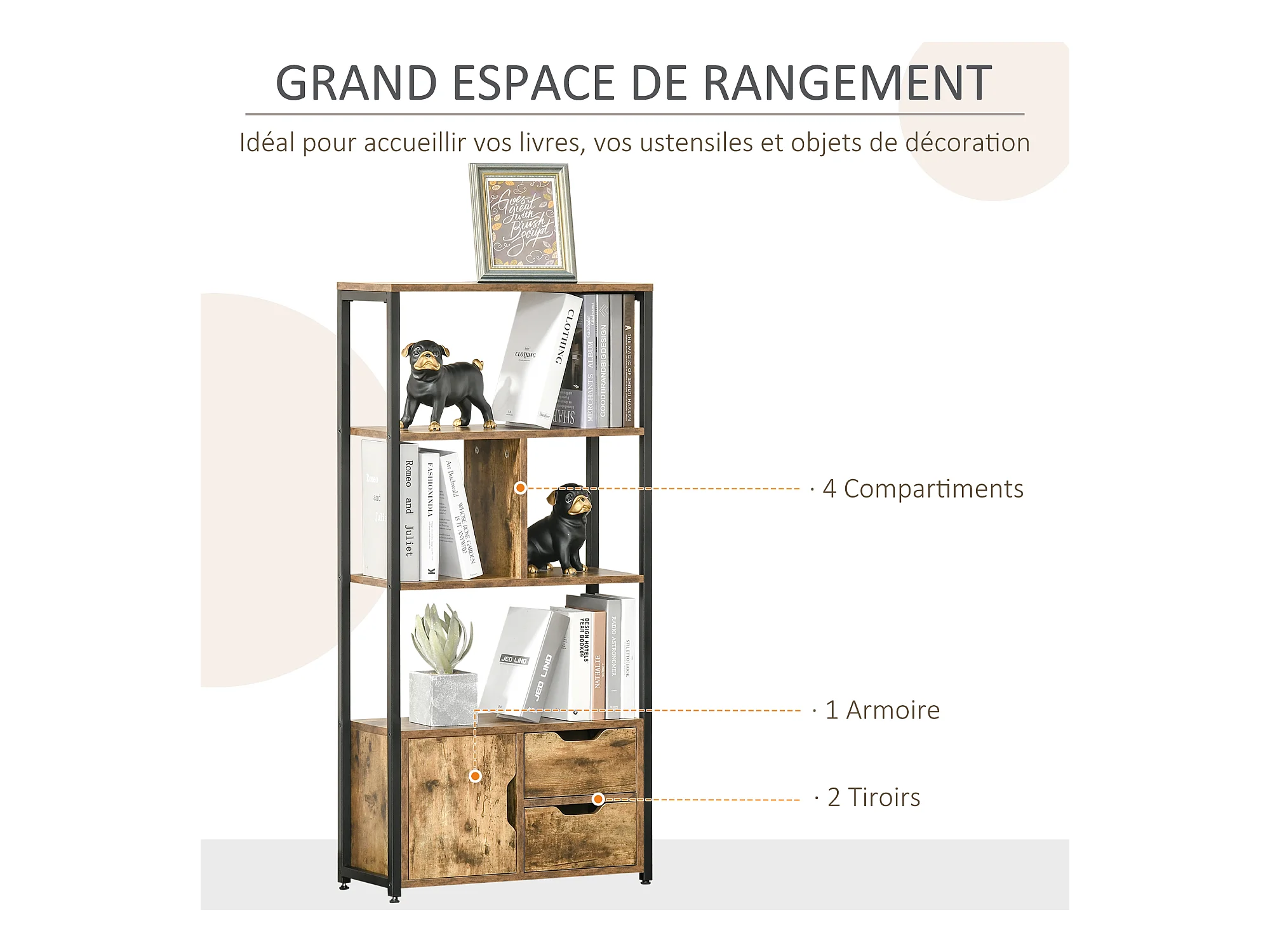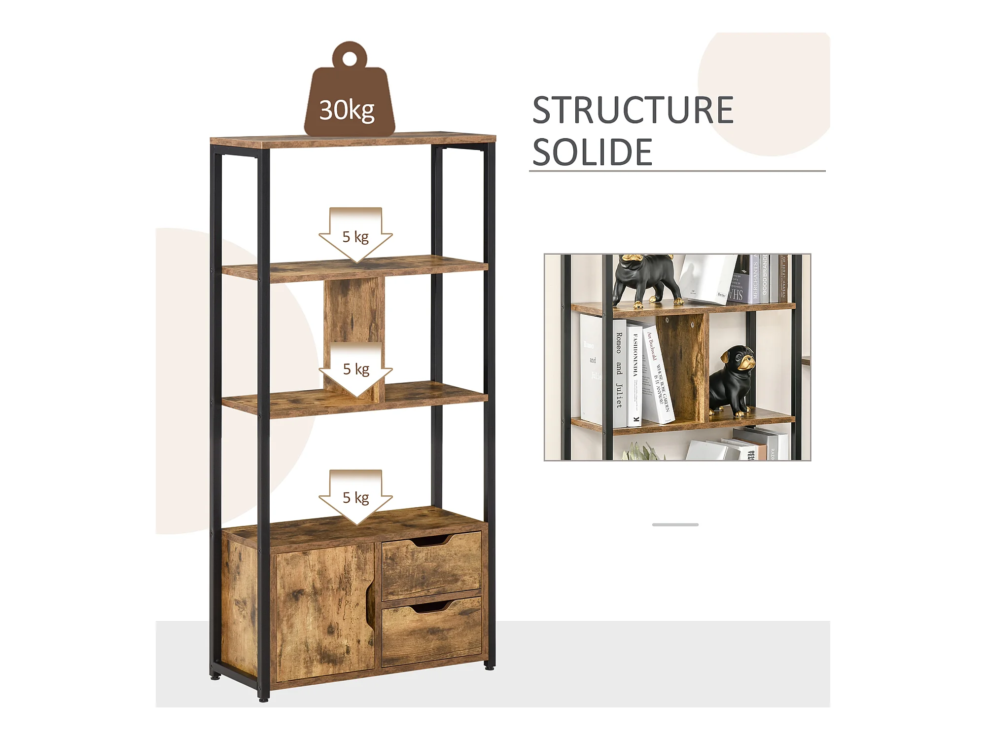 Bibliothèque style industriel 3 étagères placard porte 2 tiroirs panneaux particules aspect vieux bois acier noir