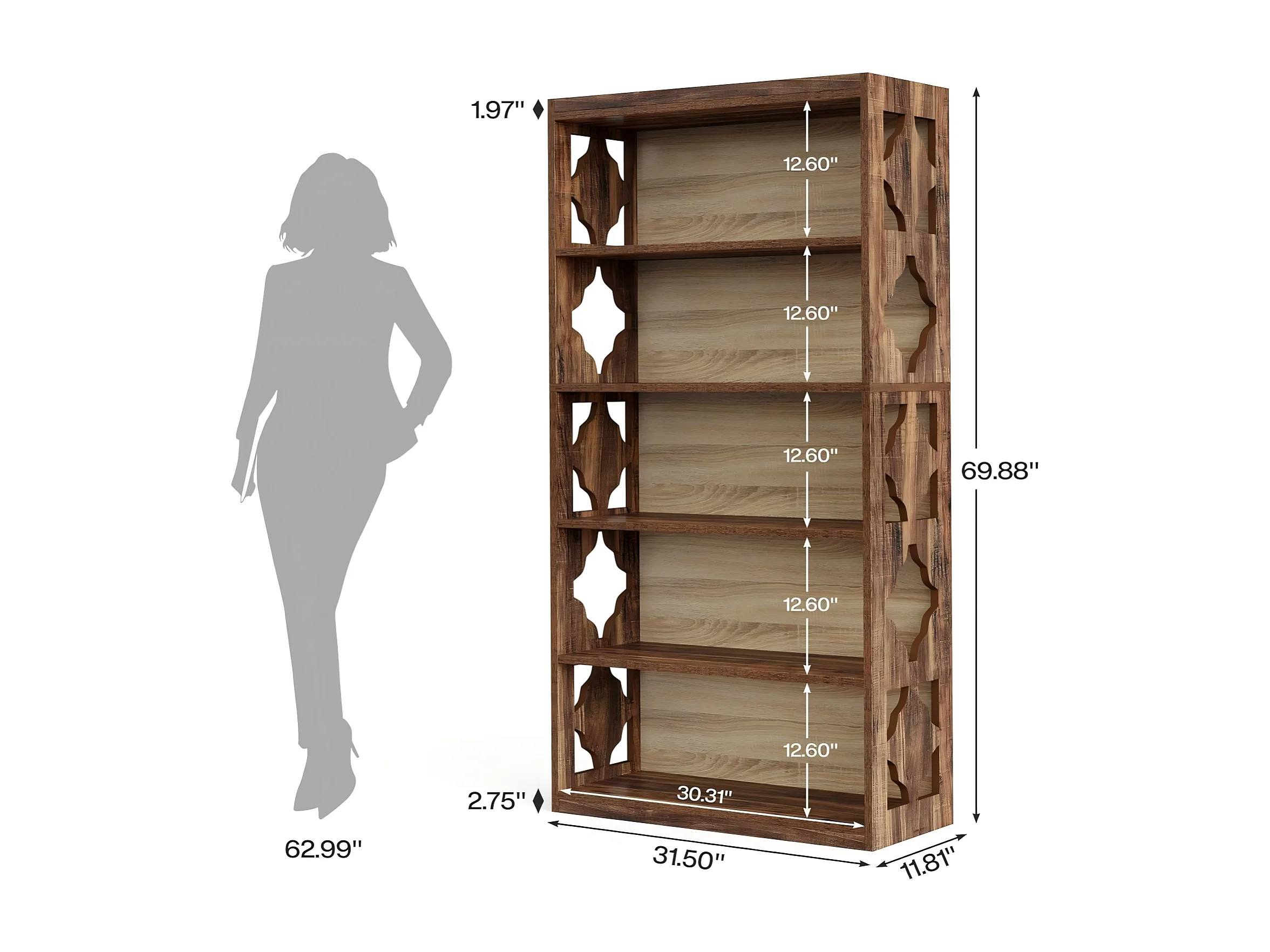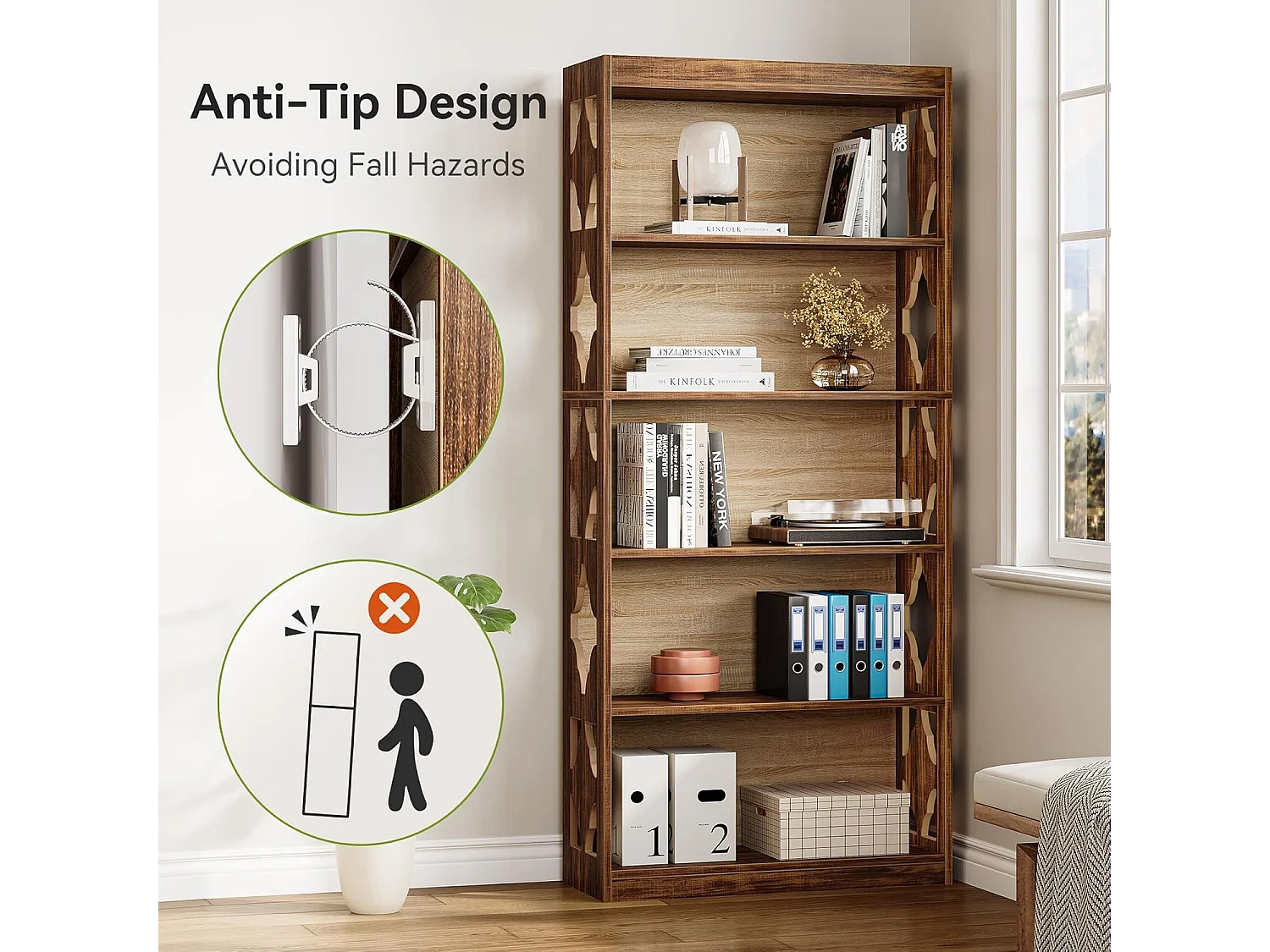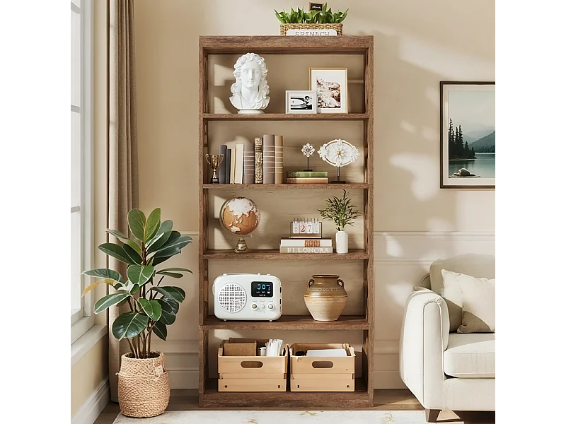 Bibliothèque vintage de 179 cm, Étagère de rangement à 5 niveaux, bibliothèque verticale ajourée, étagère haute autoportante