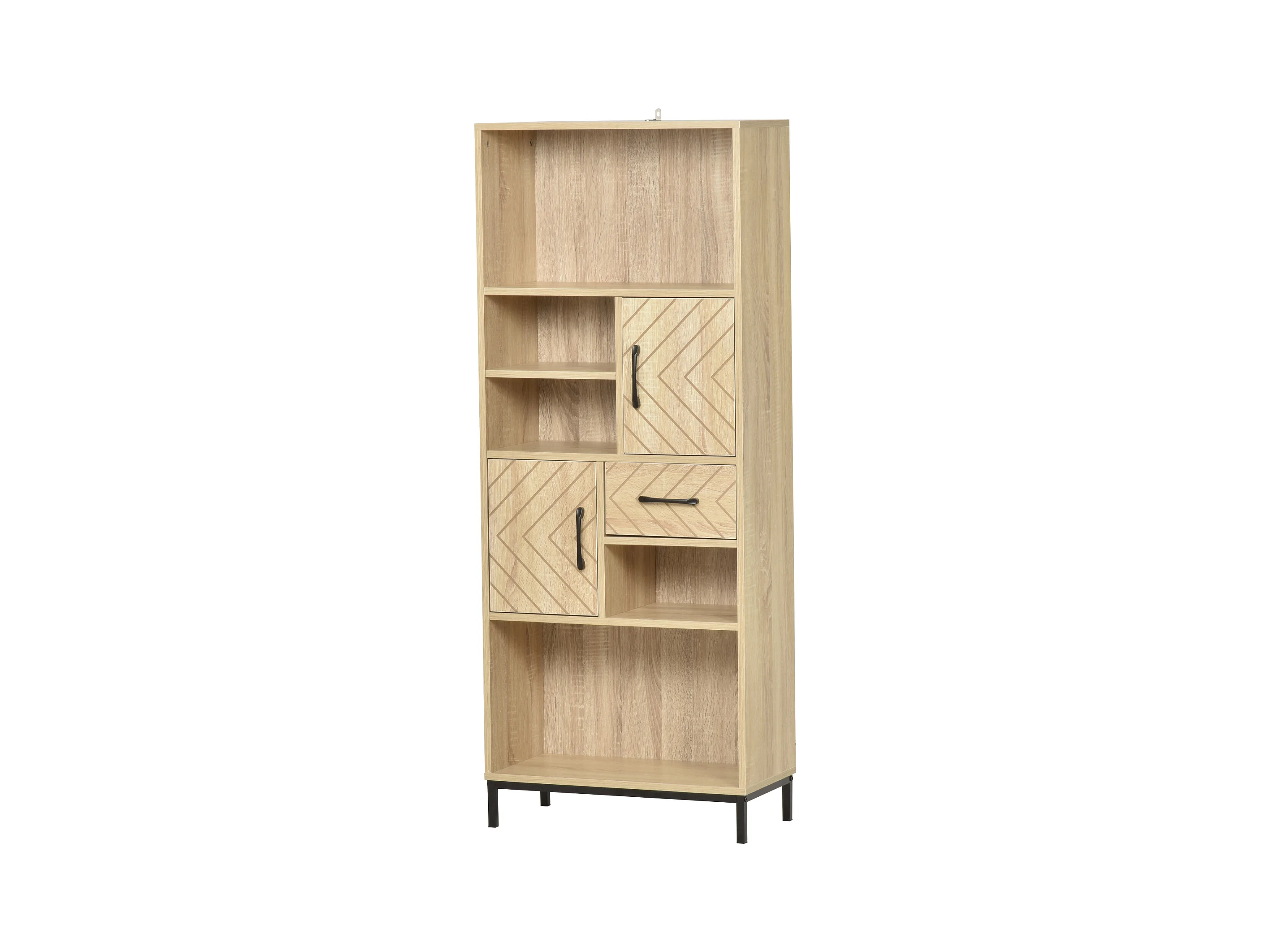 Biblliothèque 2 étagères 3 niches 2 placards + tiroir panneaux particules MDF chêne clair motif graphique métal noir
