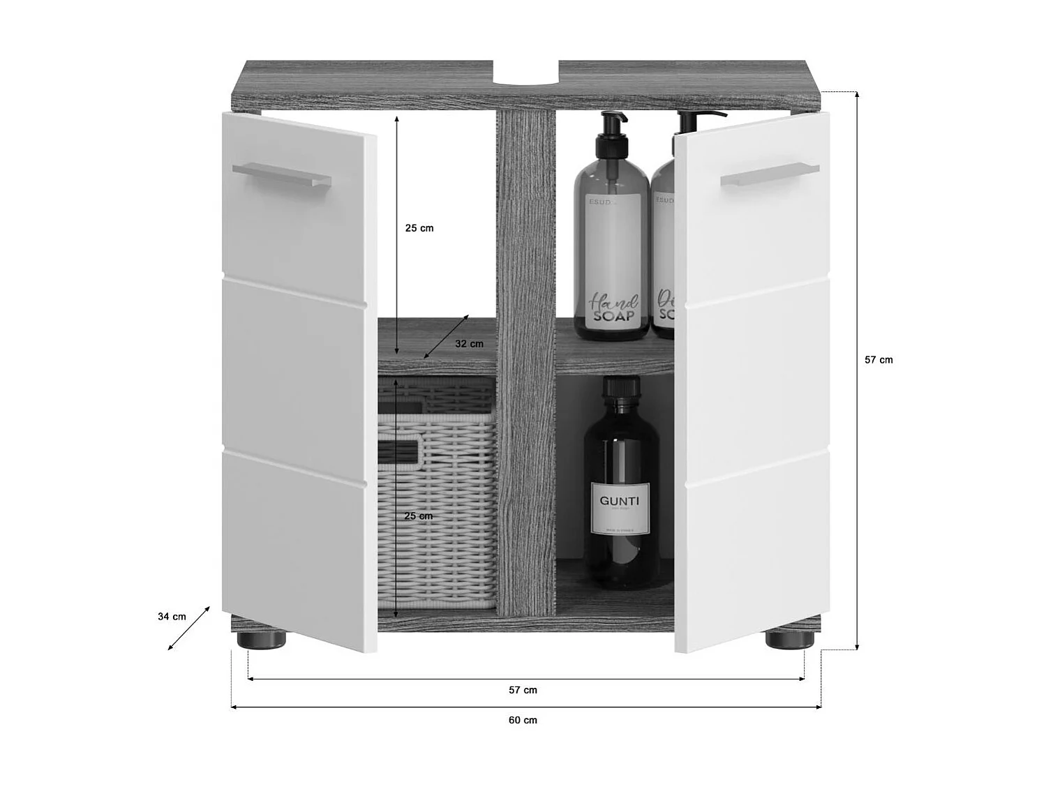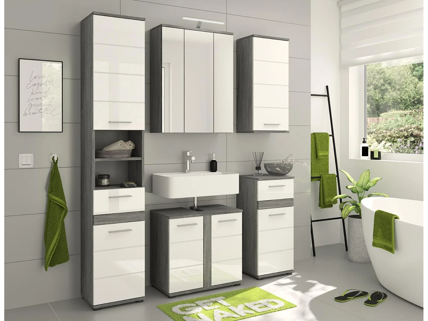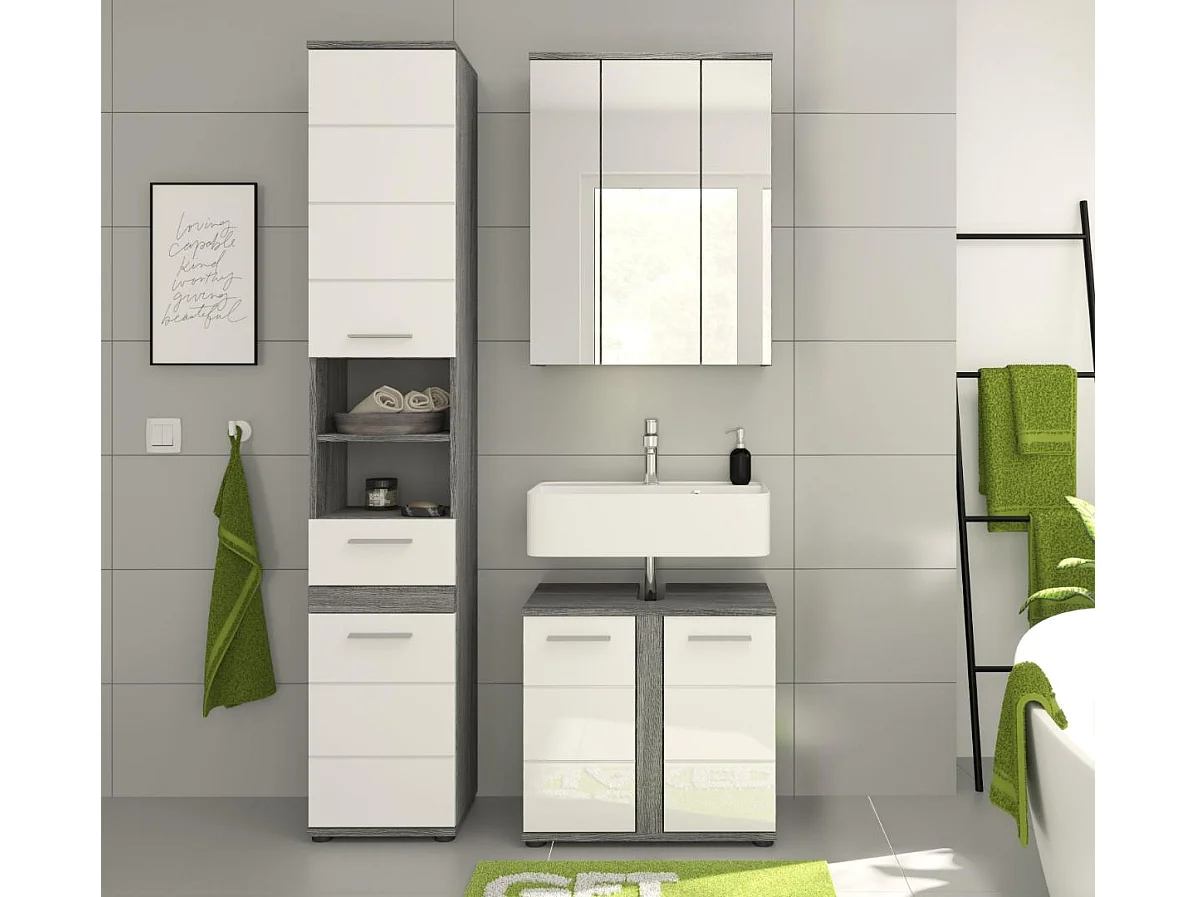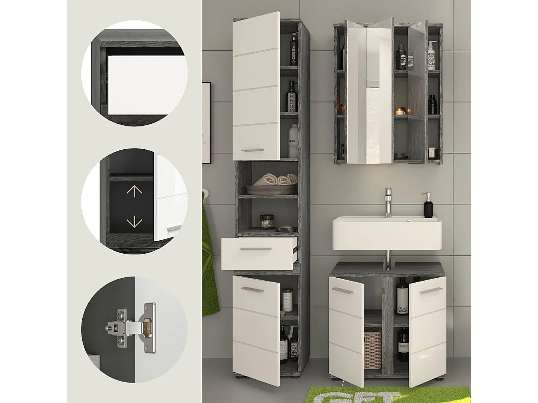 Blake - Ensemble de 3 meubles de salle de bains en mélaminé blanc et argenté, vasque non incluse (L/H/P : 114x191x34 cm)