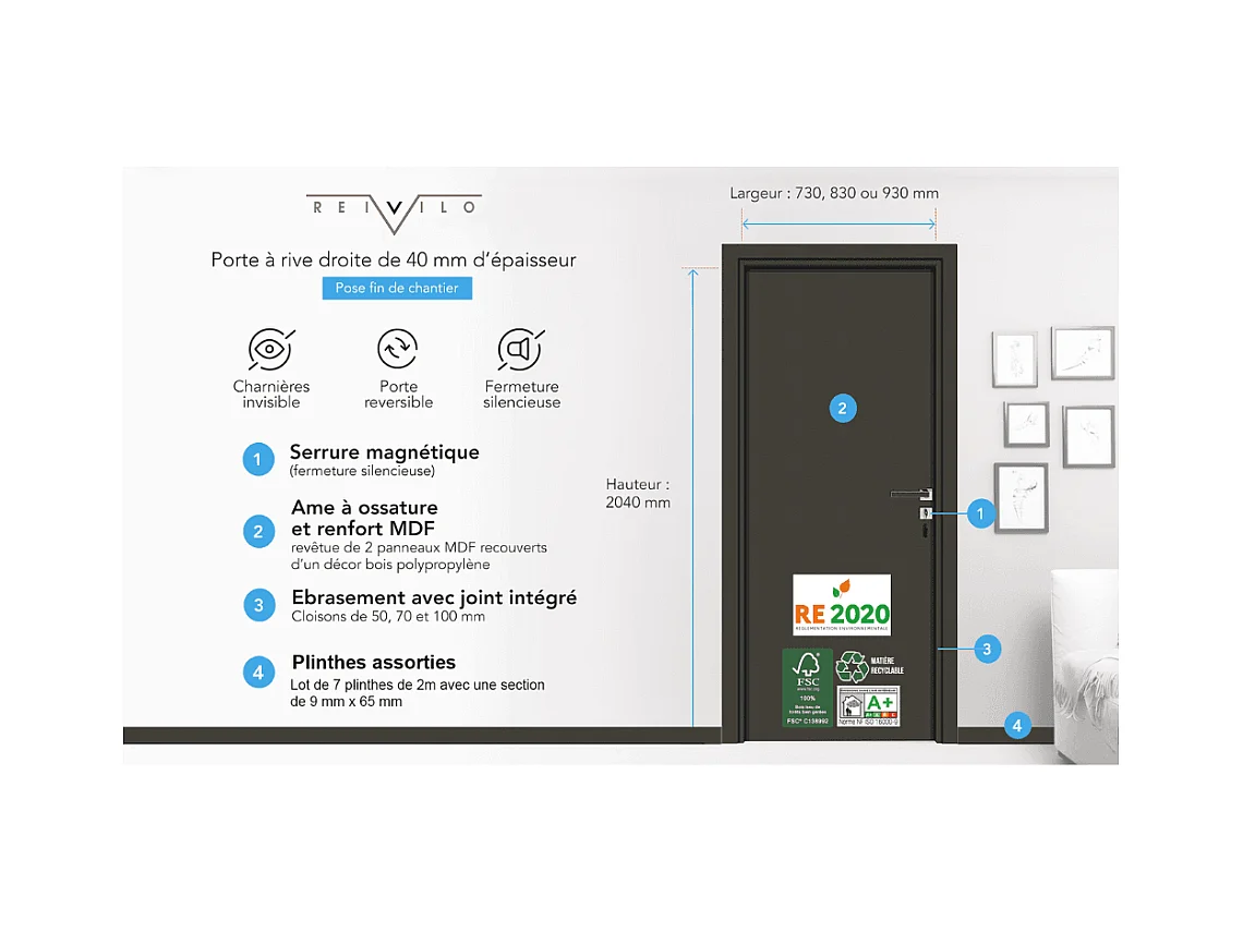 Bloc-porte pose fin de chantier collection Premium Miro, H.204 x l.63 cm, aspect chêne blanc, réversible