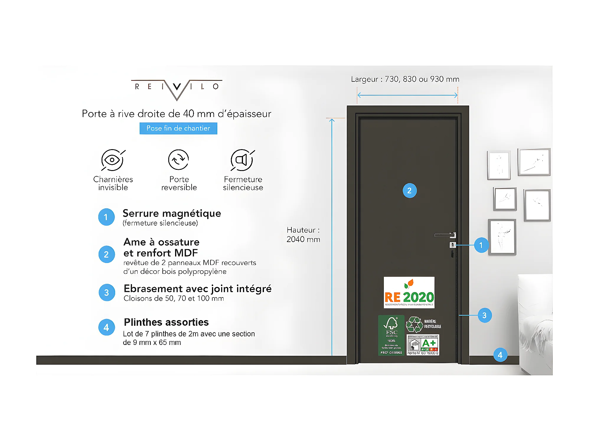Bloc-porte pose fin de chantier collection Premium Miro, H.204 x l.63 cm, aspect textile perle, réversible