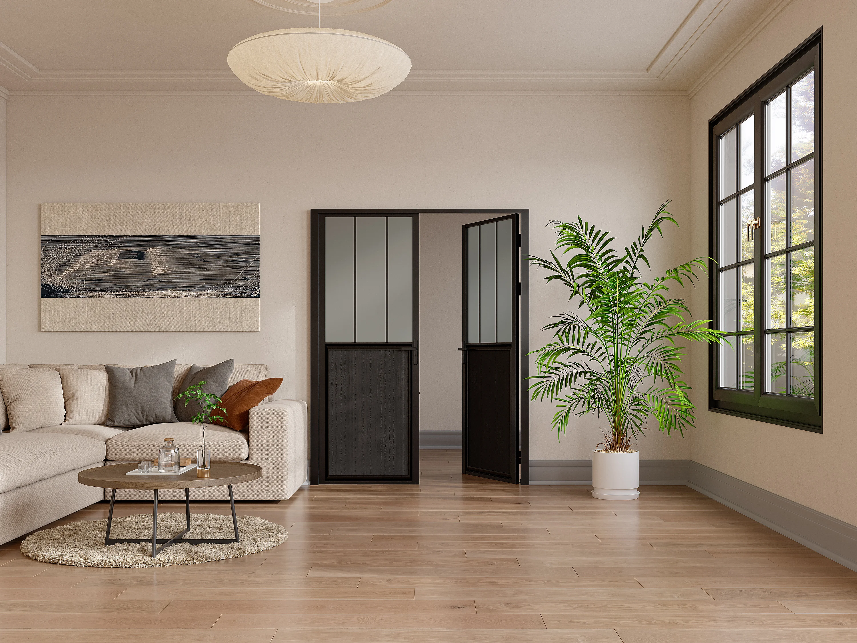 Bloc porte réversible à deux battants en aluminium et verre trempé dépoli style atelier - 2 x H204 x L93 cm - Noir - ERMELO