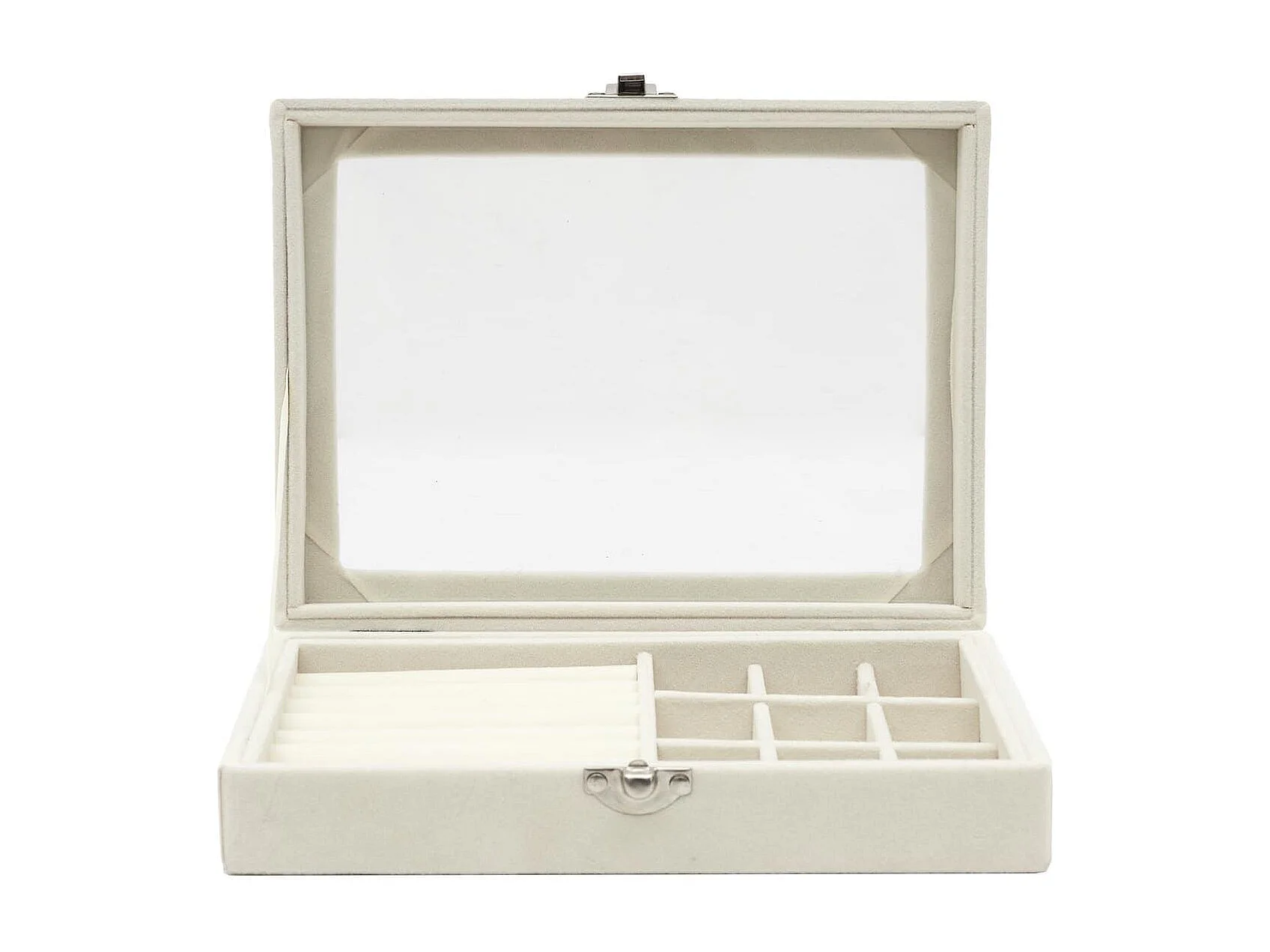 Boîte à bijoux beige avec miroir et 6 compartiments