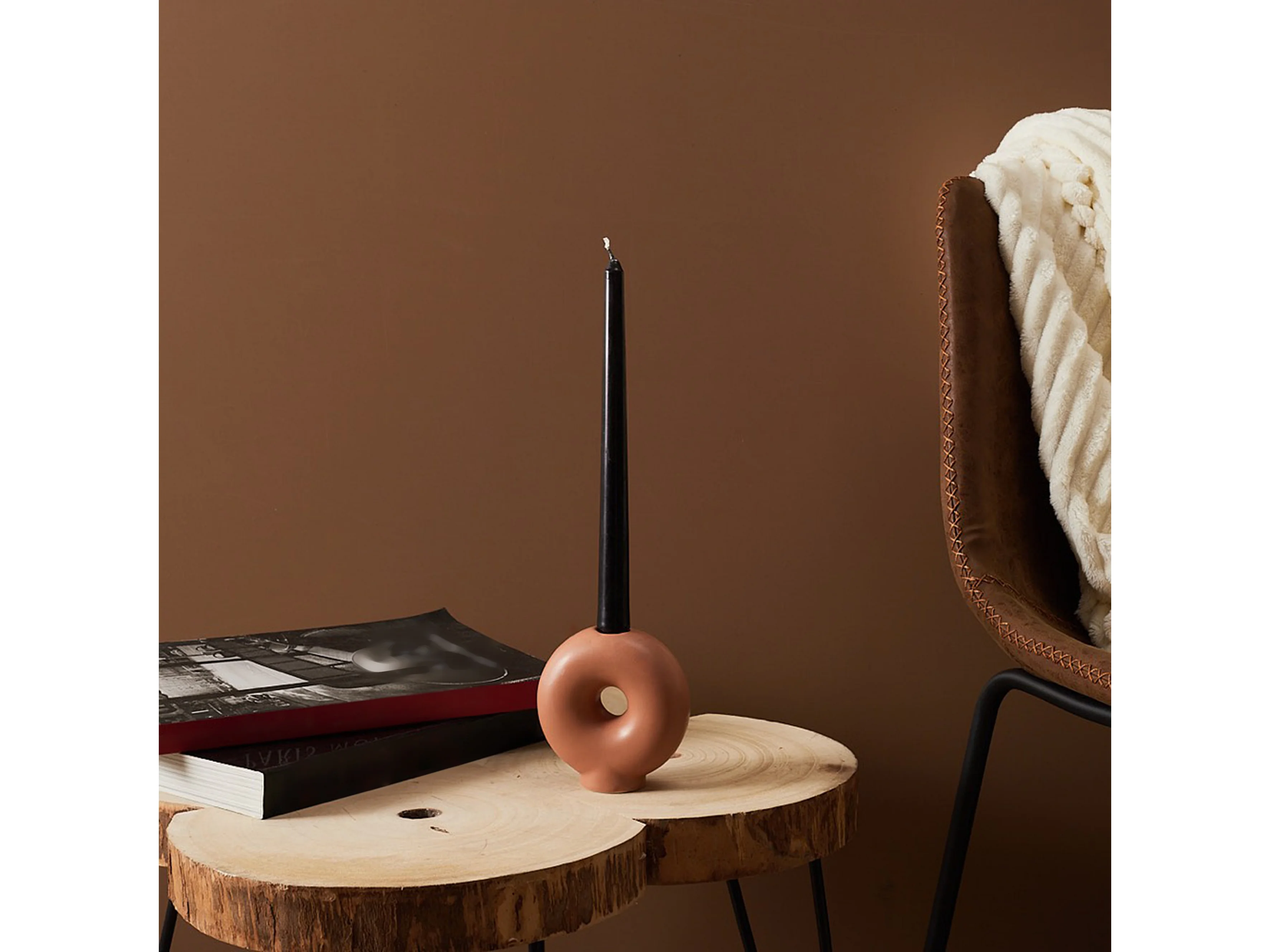Bougeoir déco en céramique - forme anneau sculptural, beige brun