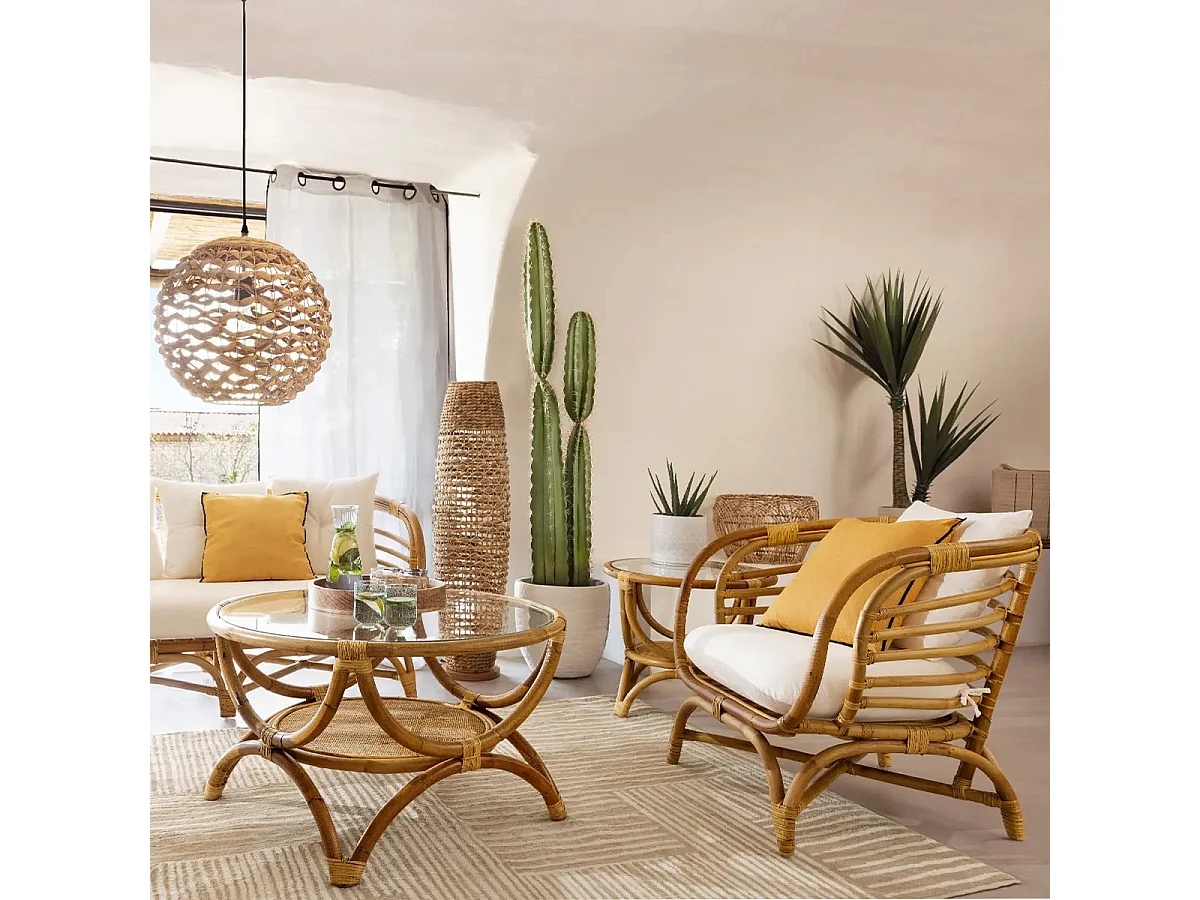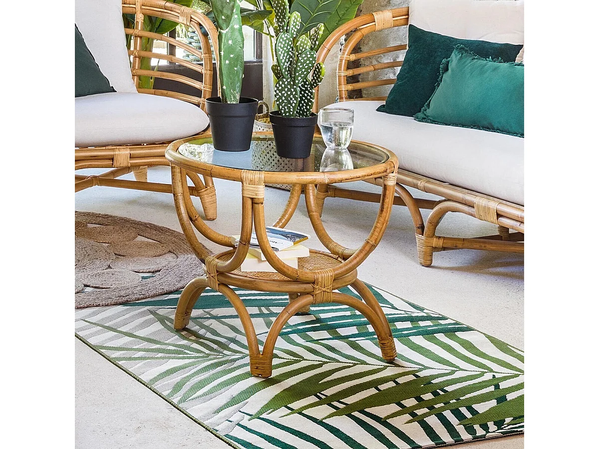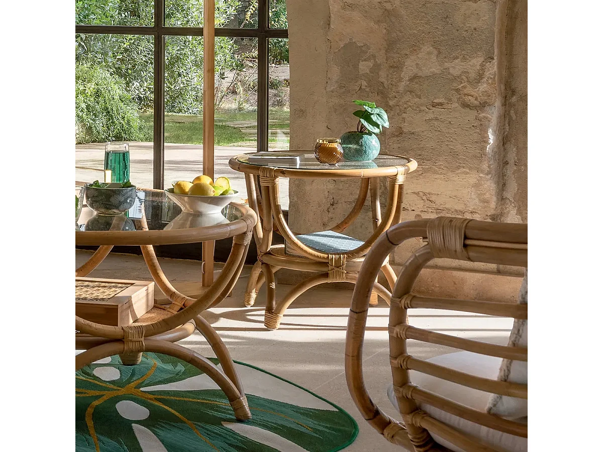 Bout de canapé en rotin et verre trempé coloris naturel - Diamètre 60 x Profondeur 50 cm