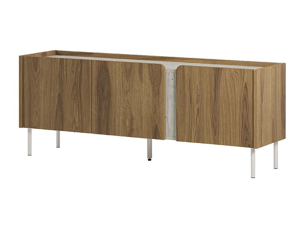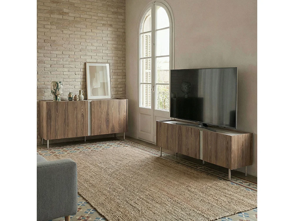 Boxy - Meuble TV 3 portes en bois et effet travertin L140cm - Bois foncé
