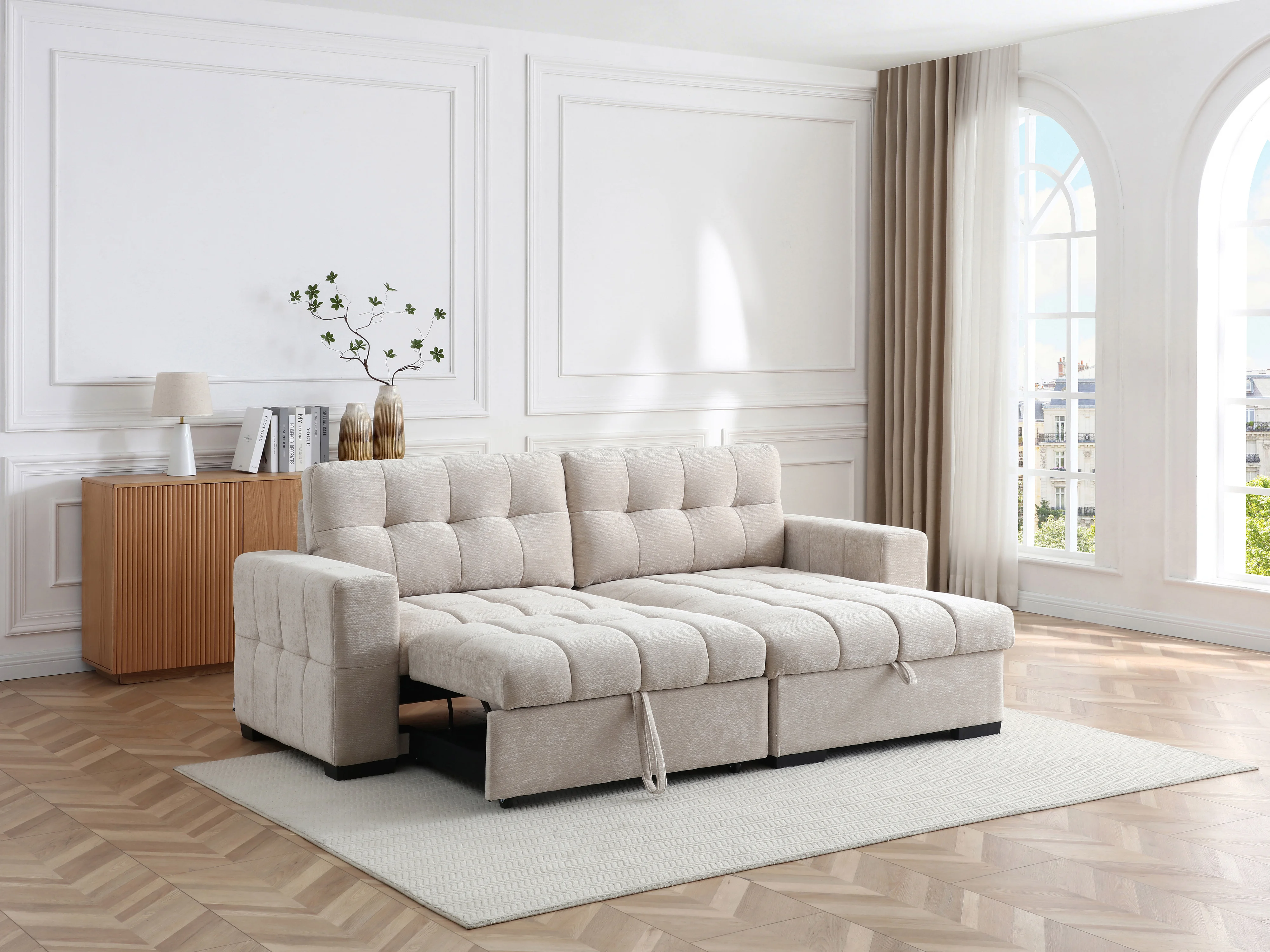 Canapé d'angle convertible et réversible en tissu texturé beige BRISAMA