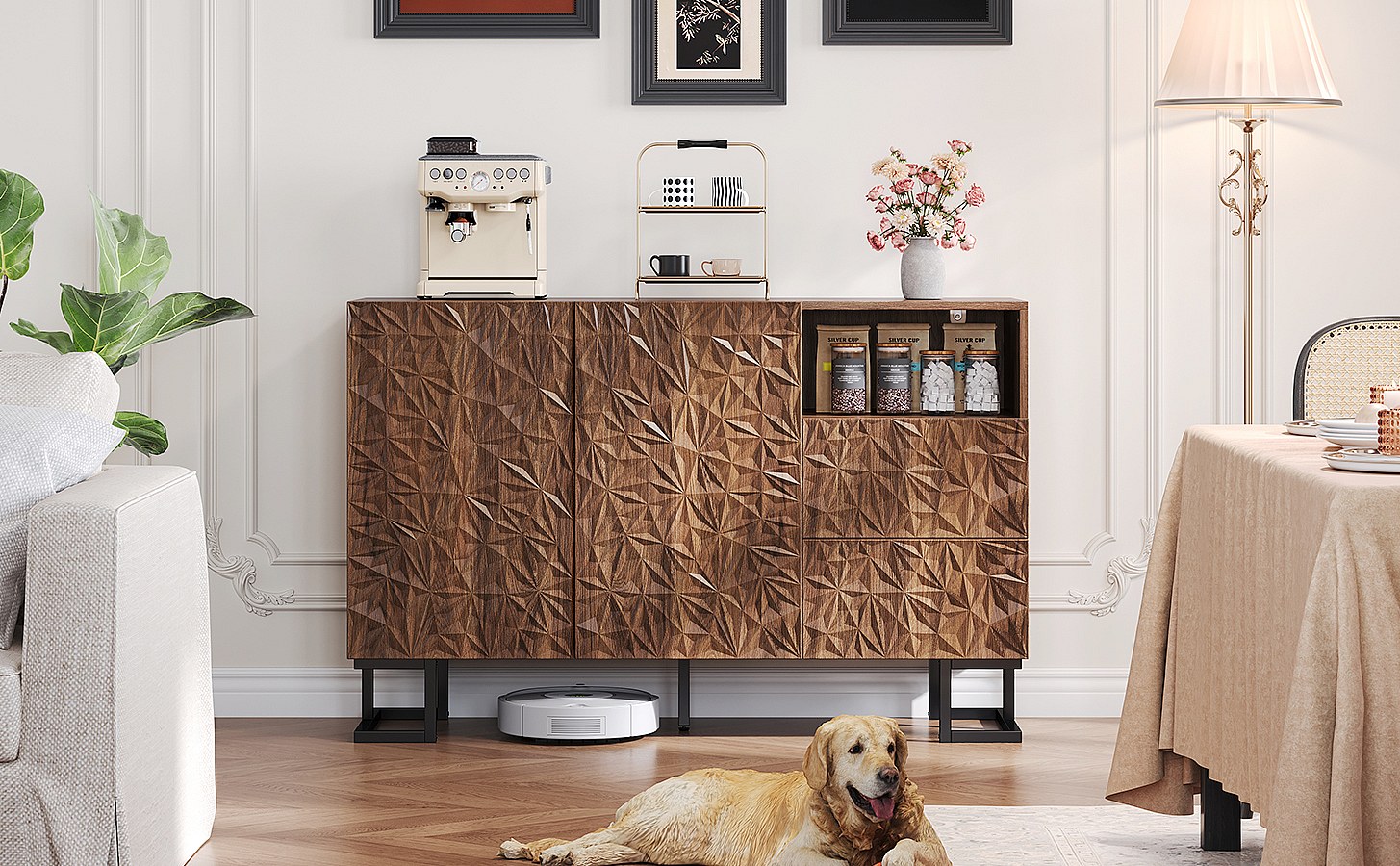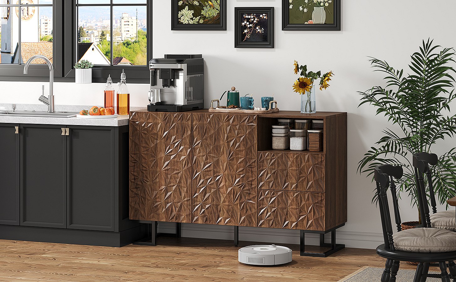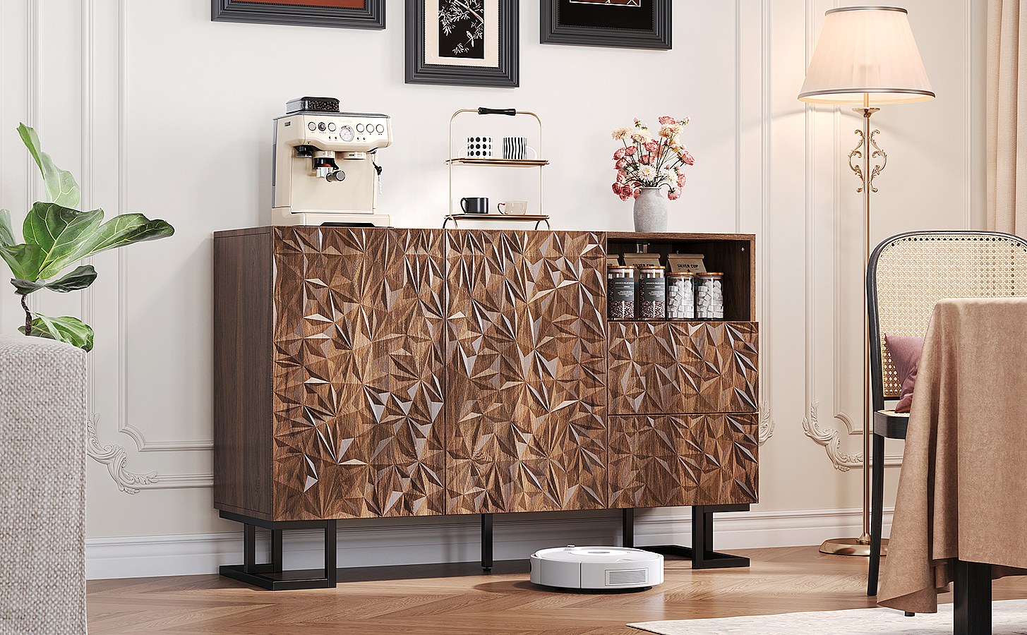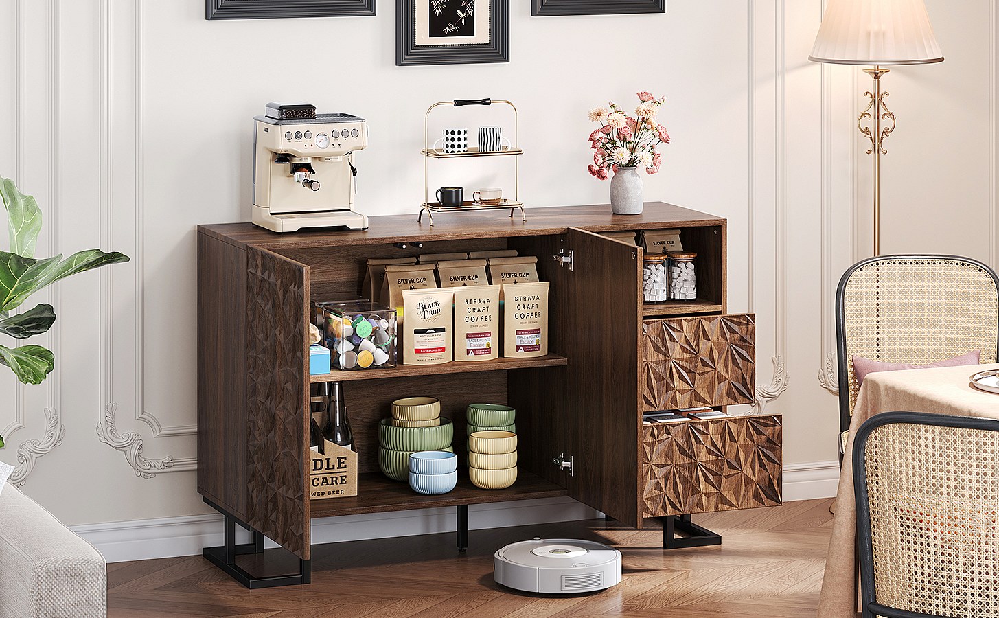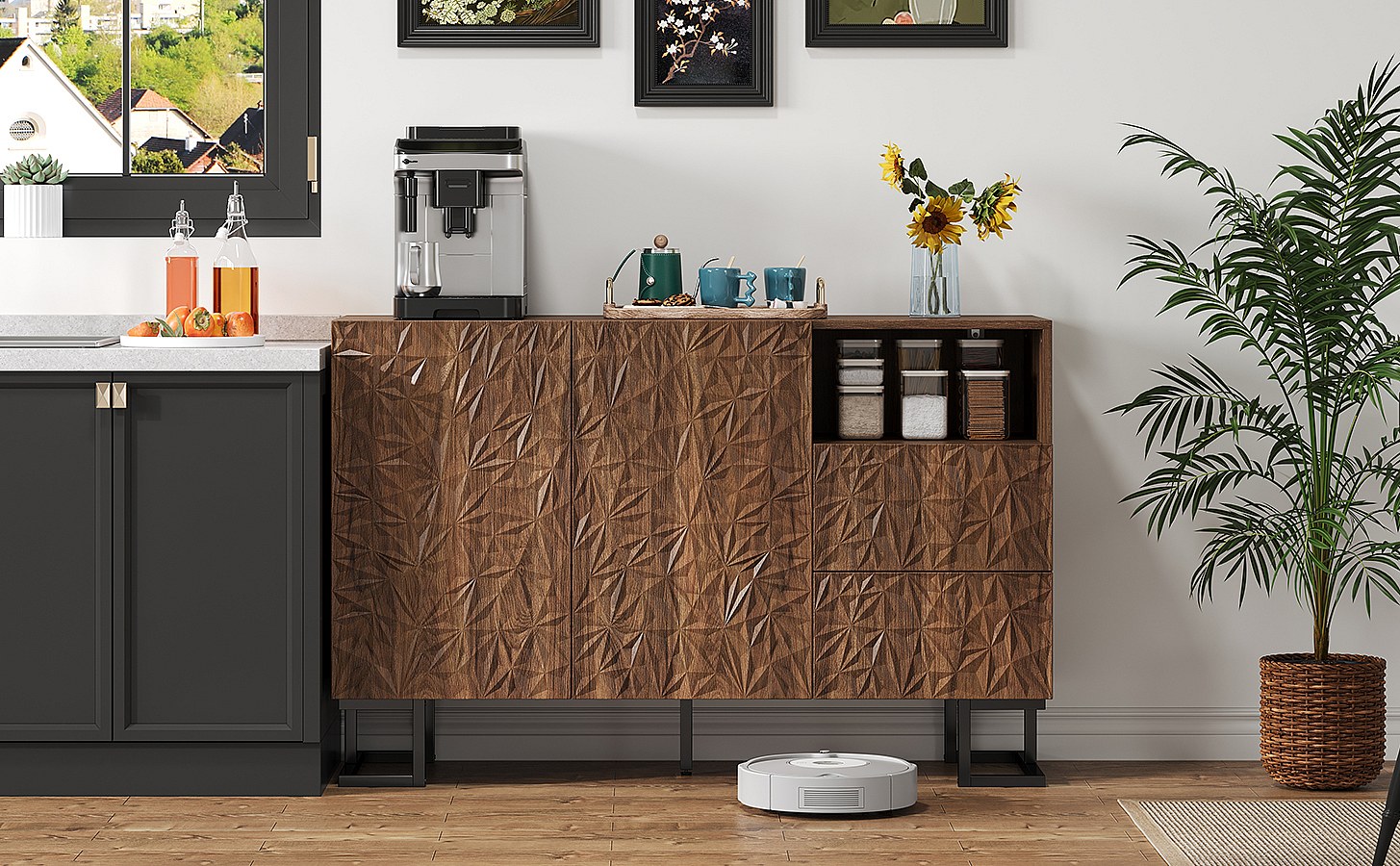 Buffet 120×40×78,5 cm en noyer foncé avec relief feuilles, pieds en métal, 2 portes et 2 tiroirs – Idéal pour salle à manger, salon ou couloir
