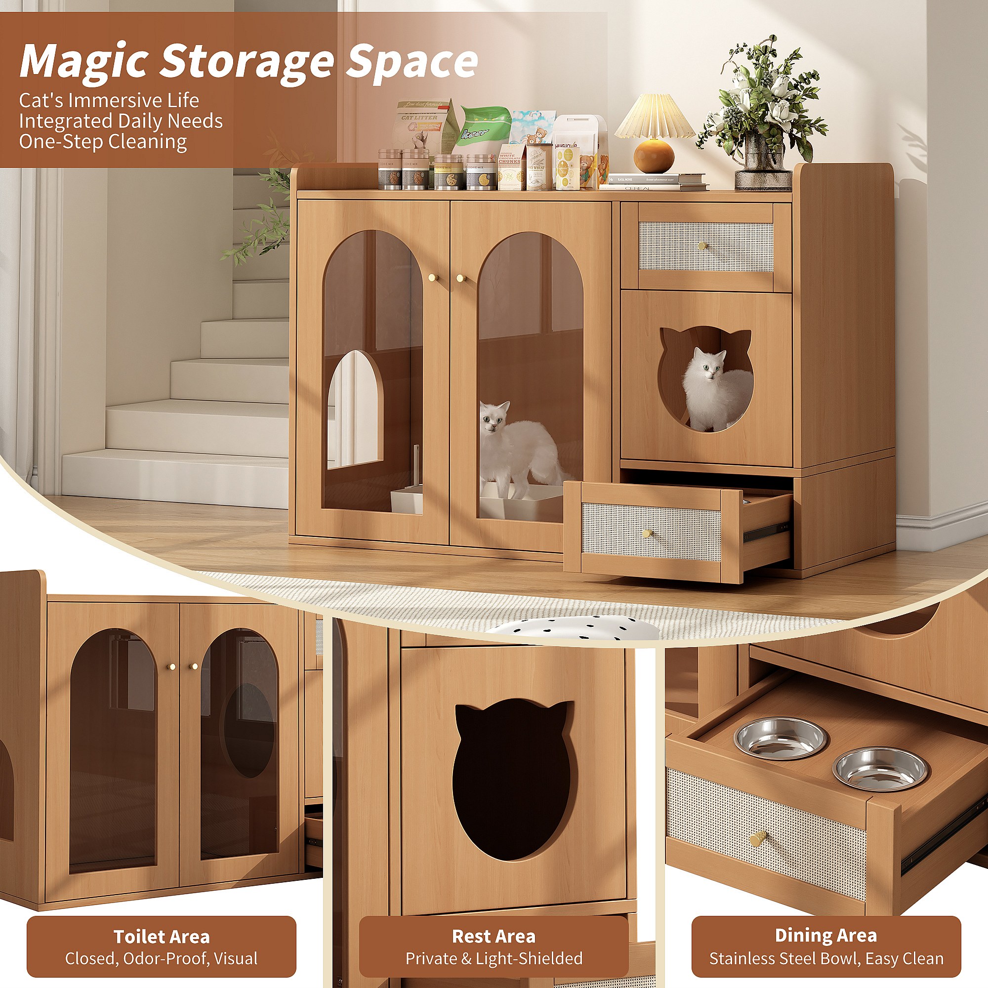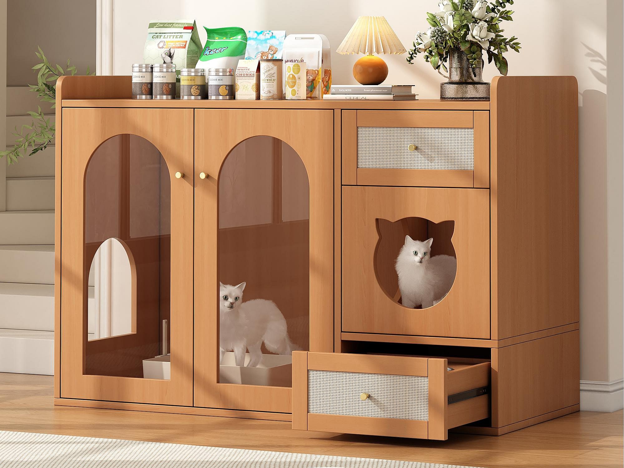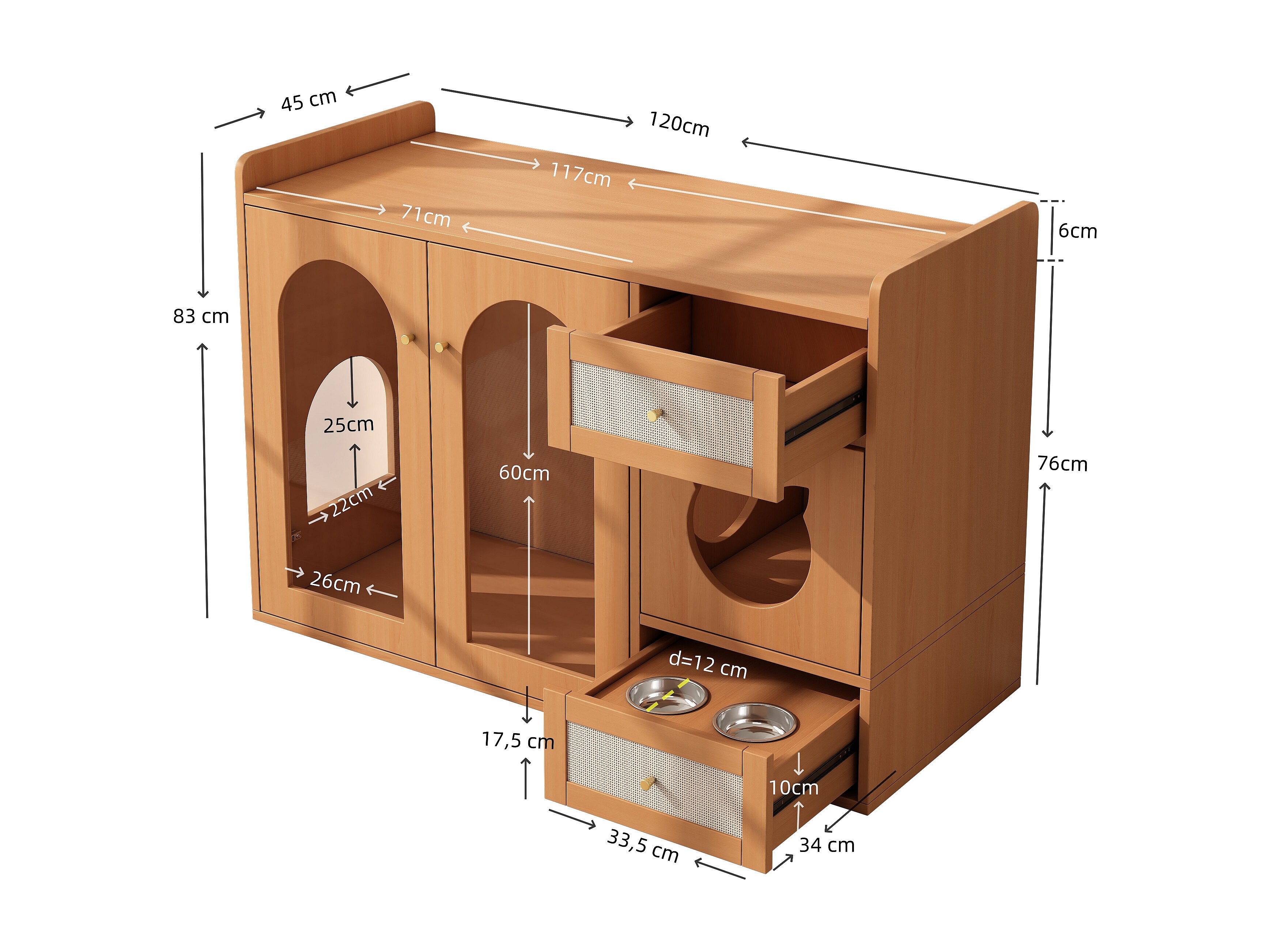 Buffet 120x45x83cm - 2 gamelles pour chat - 2 tiroirs et 2 portes - naturel