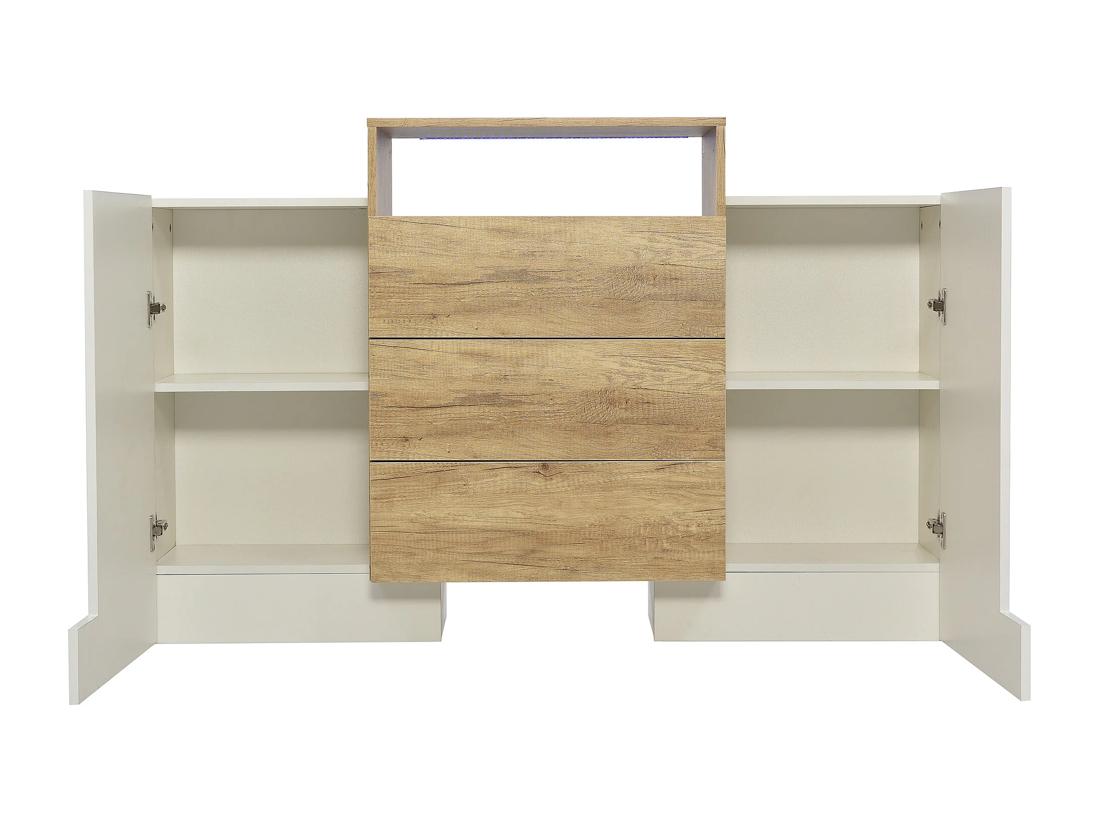 Buffet 140x30x77.5 cm, LED multicolore, 2 portes, 3 tiroirs, 2 étagères, MDF, blanc brillant et naturel