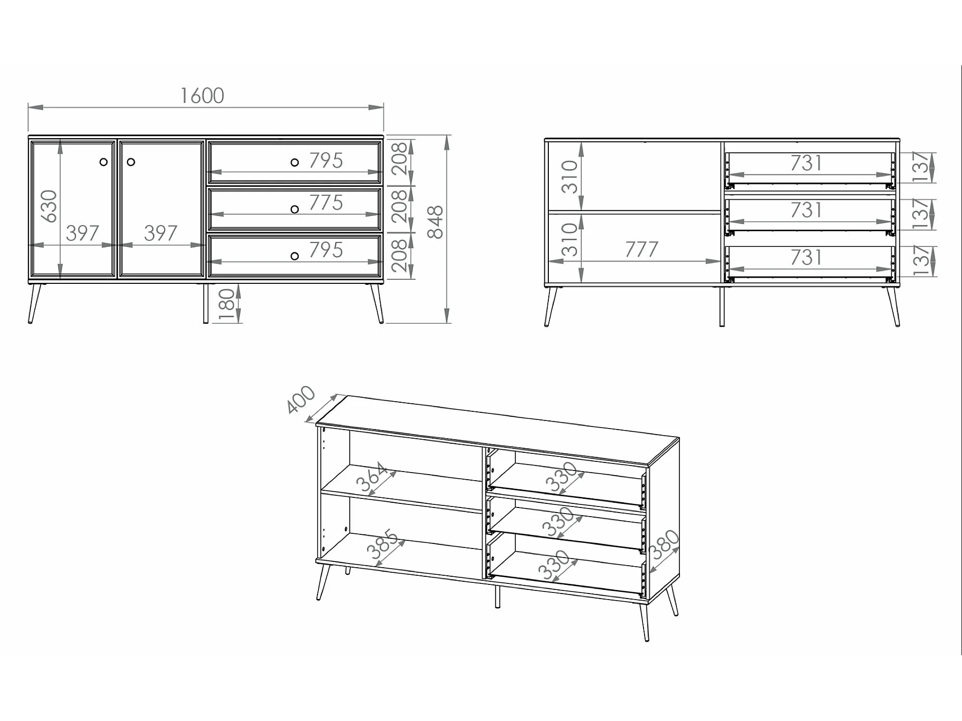 Buffet - 160 cm - 2 portes - blanc mat / brillant, pieds dorés - DARRBY