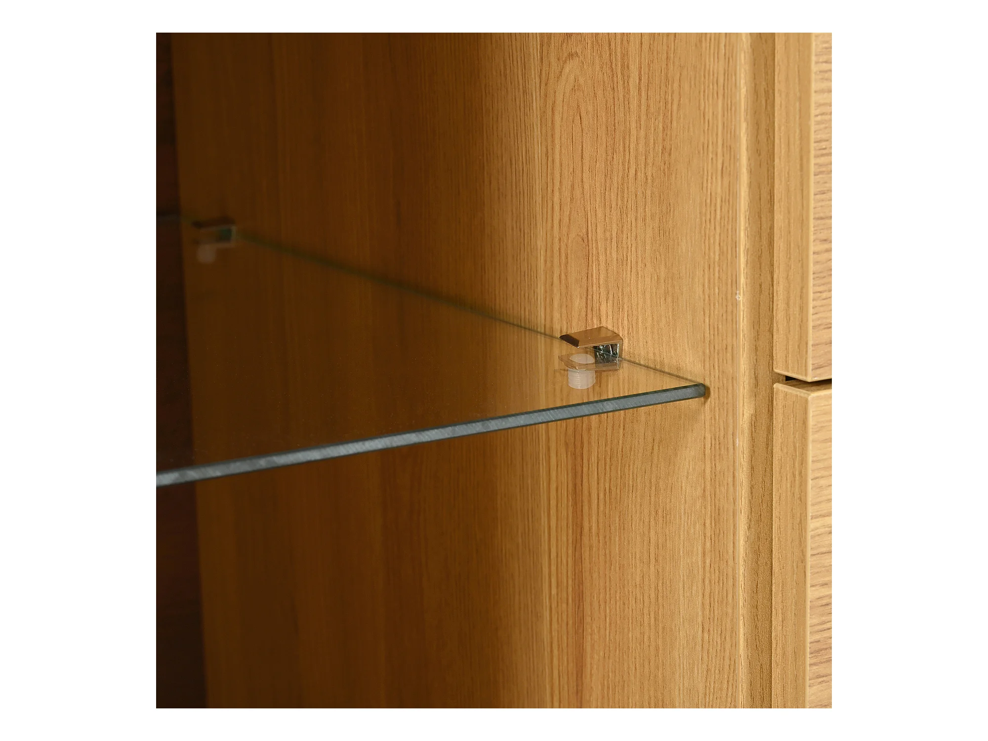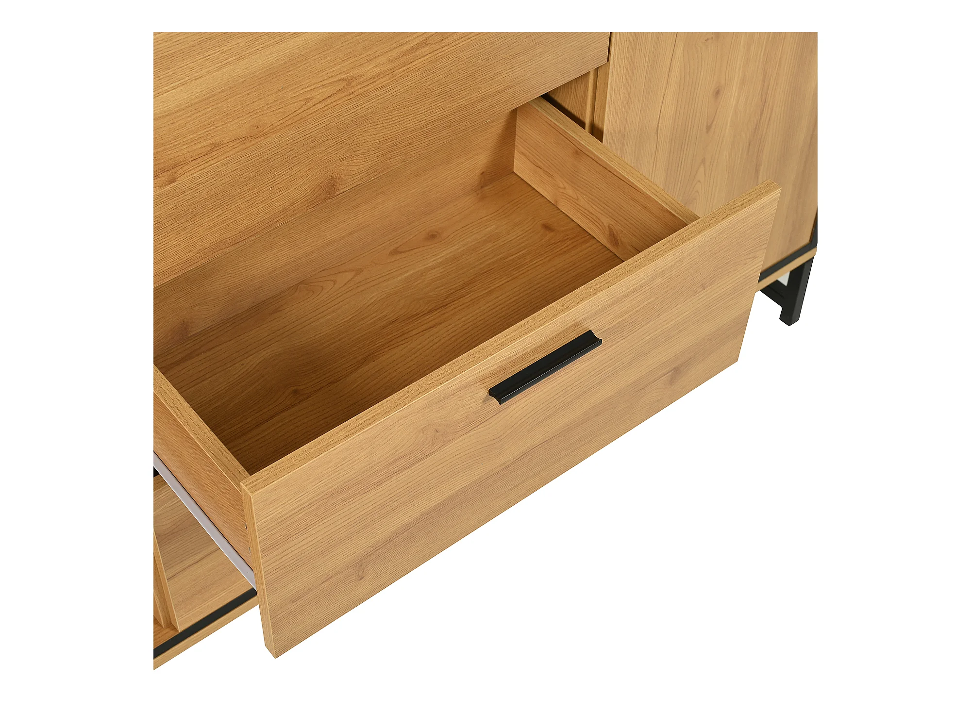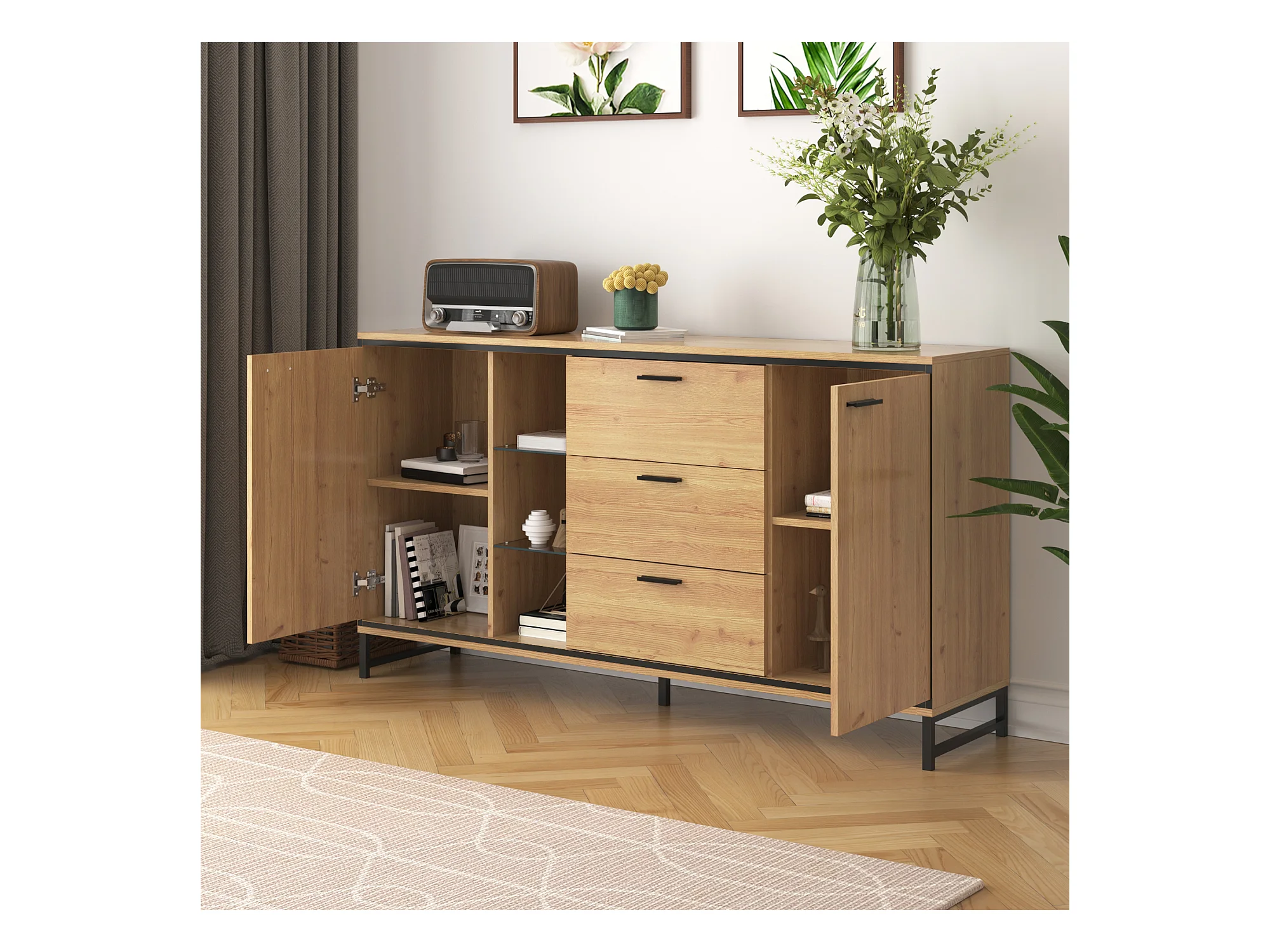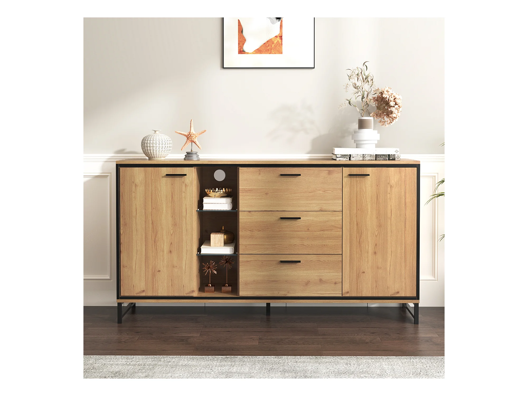 Buffet 160x40x85cm avec 3 tiroirs, 2 portes, 3 niches et LED, corps en placage bois naturel clair