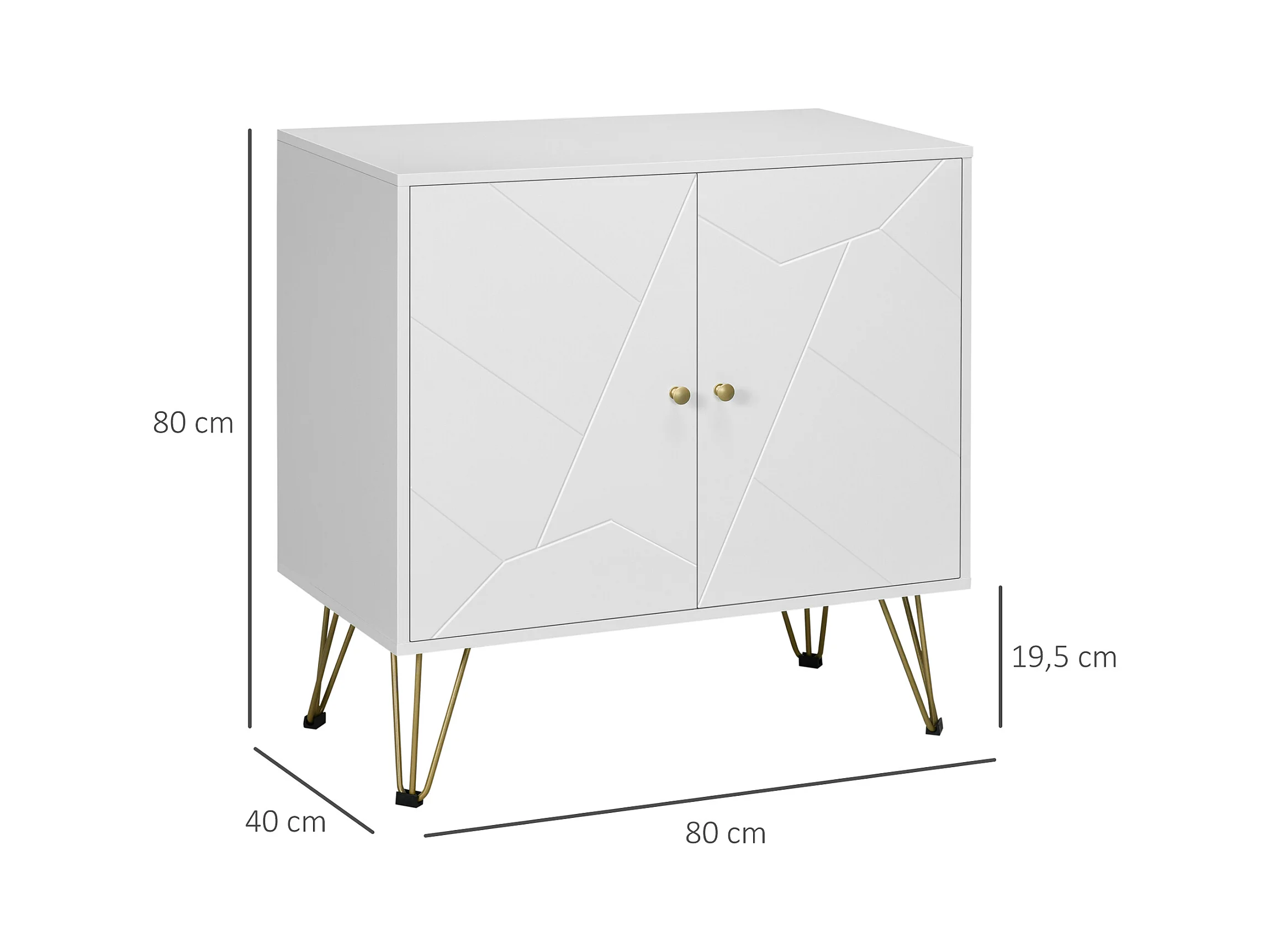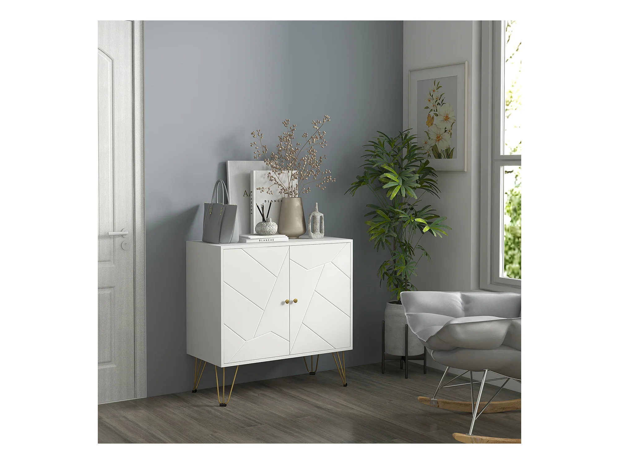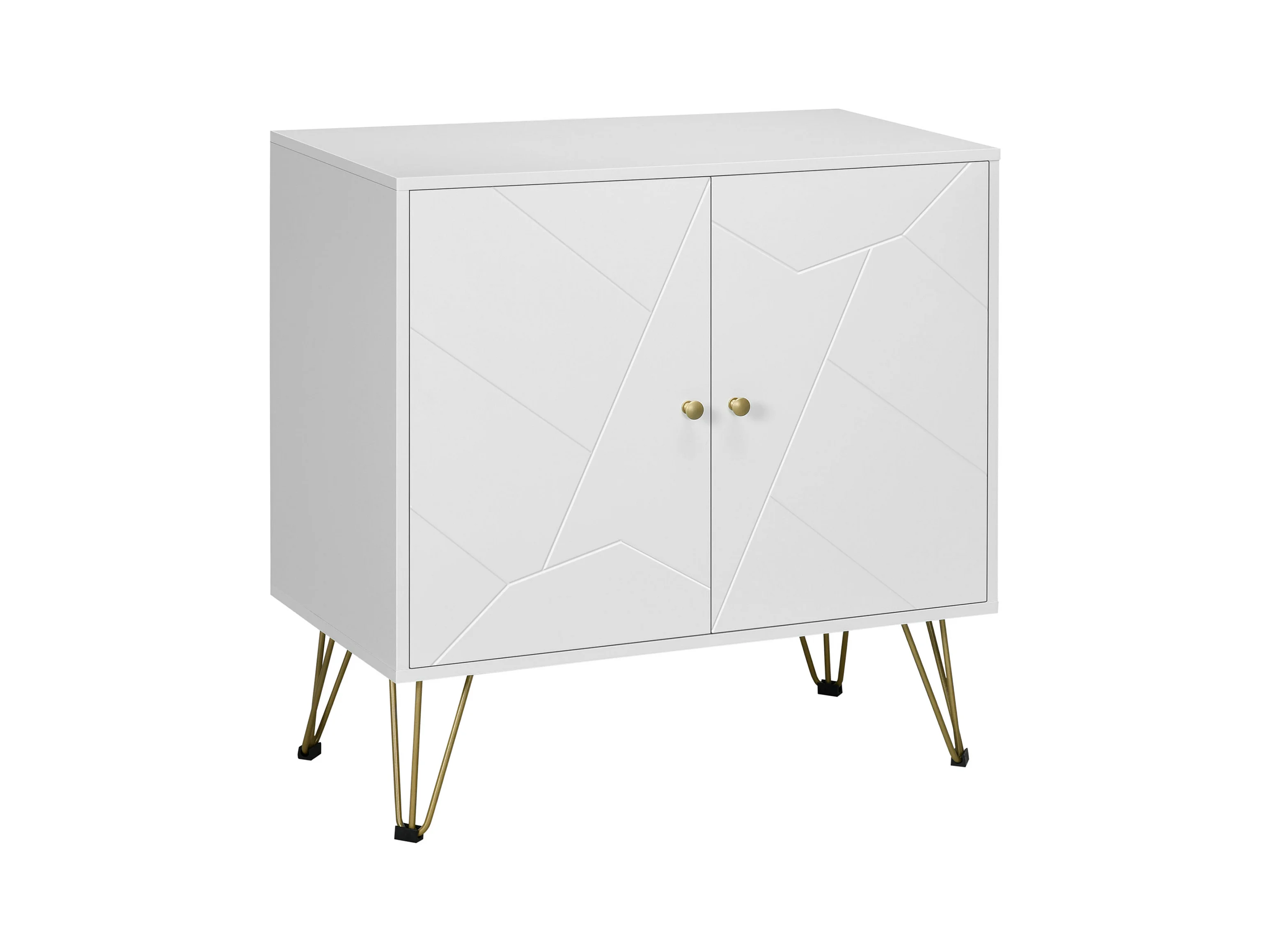 Buffet 2 portes 2 étagères style Art déco motif graphique piètement épingle poignées métal doré MDF blanc