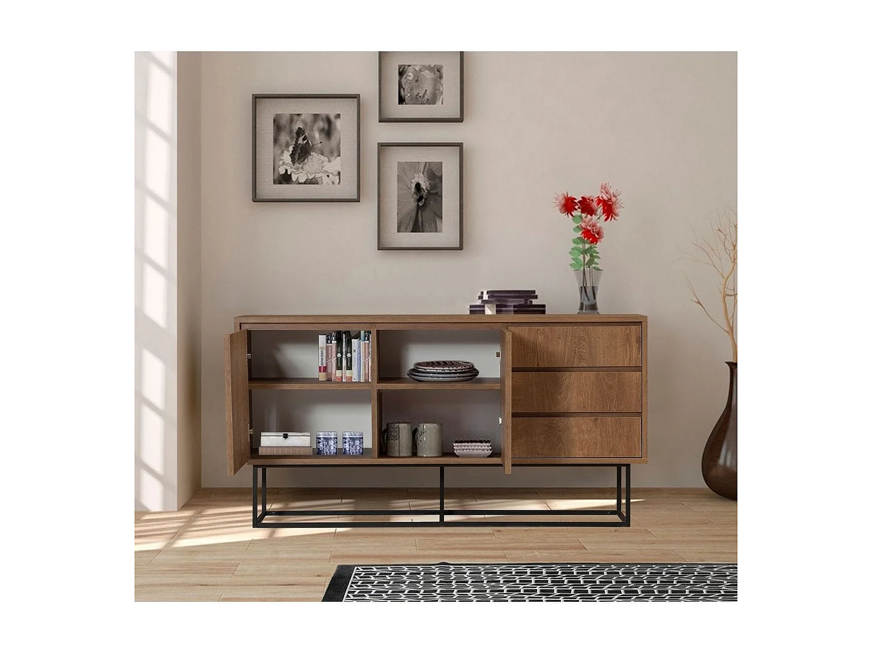 Buffet 2 portes 3 tiroirs effet Noyer 140 cm - Nerio